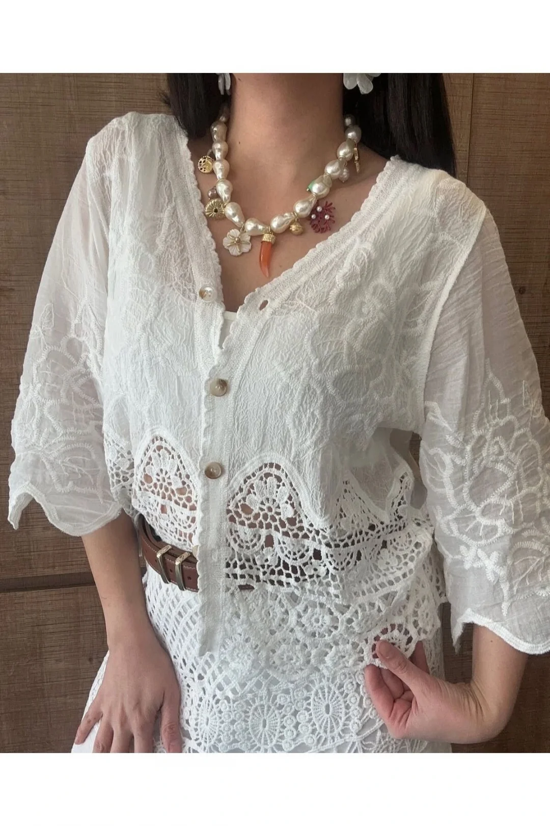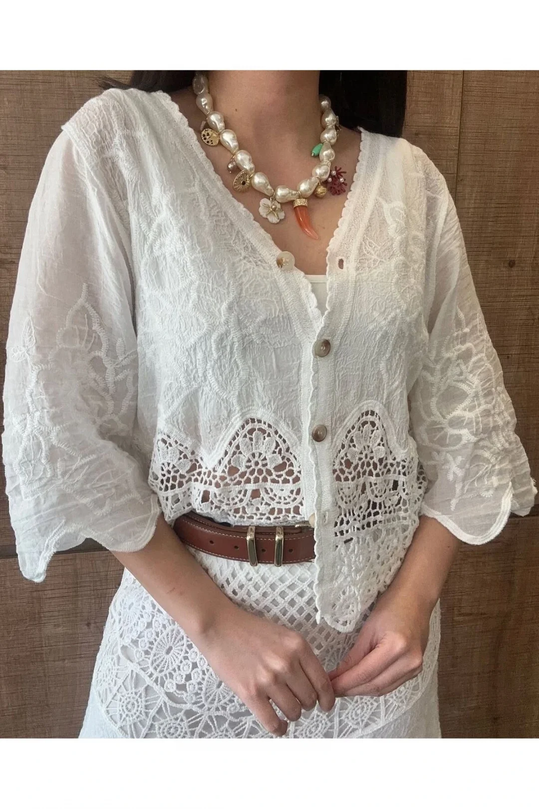 Alaçatı Dantelli Nakış Detaylı V Yaka Güpür Düğmeli Kısa Kollu Basic Kadın Gömlek Bluz Ekru