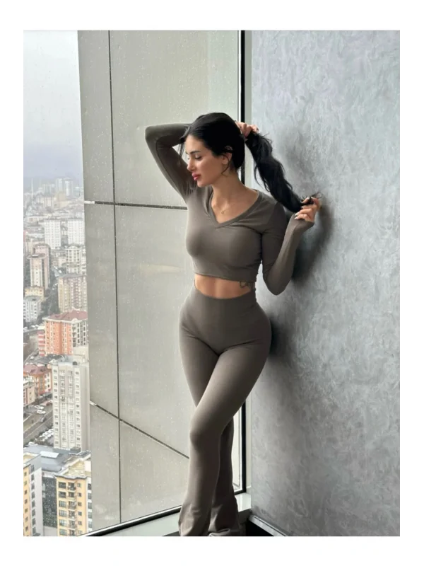 Gri Katlanmış Bel Bantlı Şeritli İspanyol Paça Pantolon