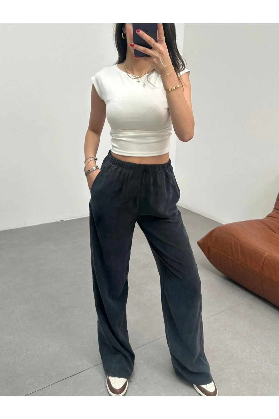 Lastikli İnce Saten Kumaş Rahat Bol Paça Cepli Pantolon