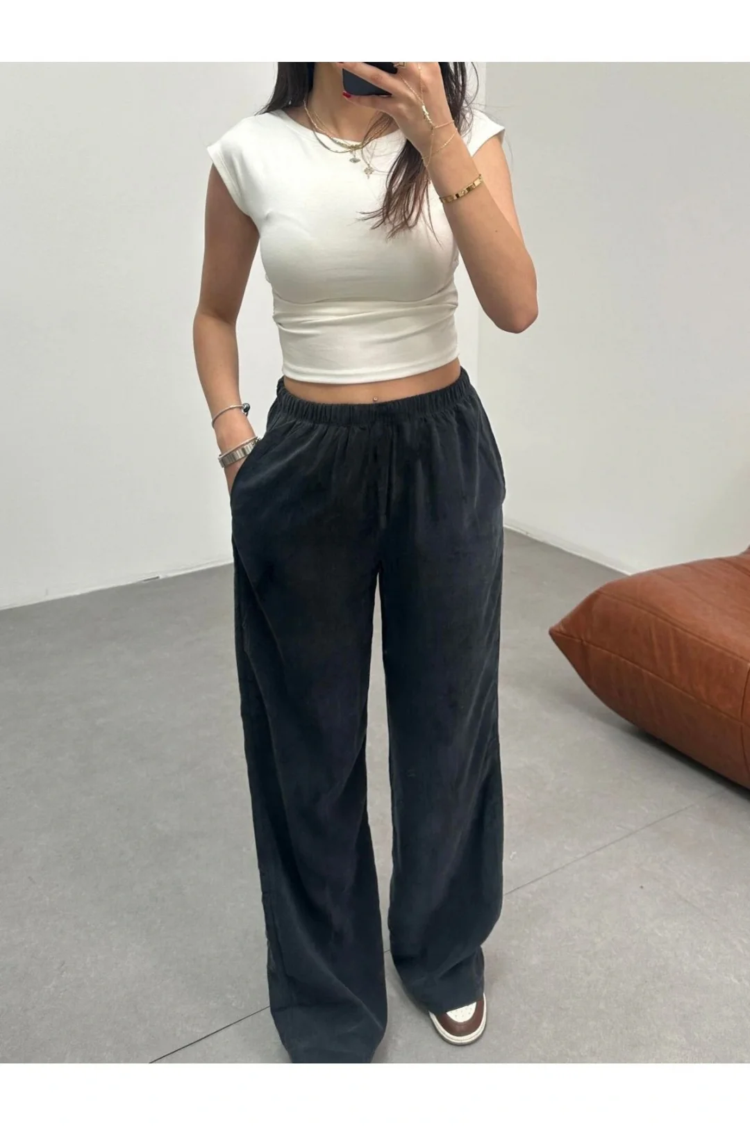 Yüksek Bel Geniş Paça Bol Siyah Spor Pantolon