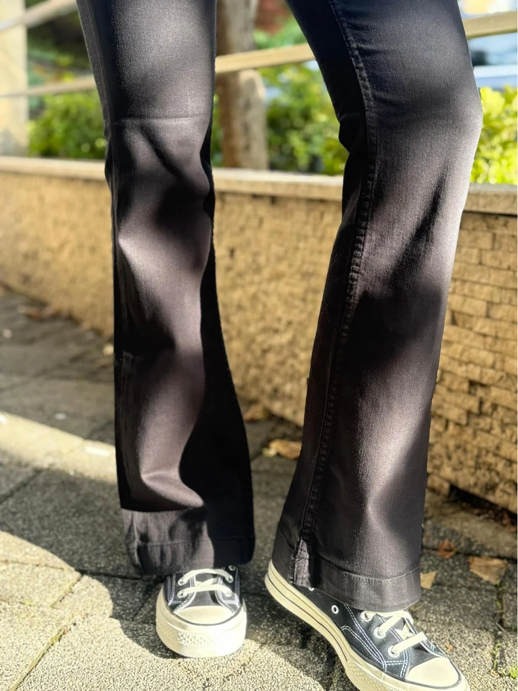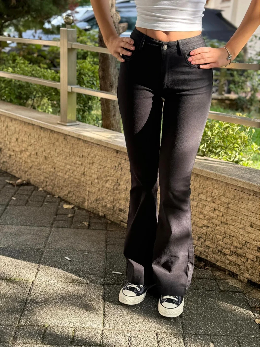 Retro esintili flared paça kesimiyle modern stilin birleştiği bu orta bel denim jean, hem günlük rahatlık hem de feminen duruş sunar. Hem bot hem sneaker kombinlerine uygun yapısıyla sezonun hem ofis hem sokak modası gardıroplarında öne çıkan parçası oluyor.
