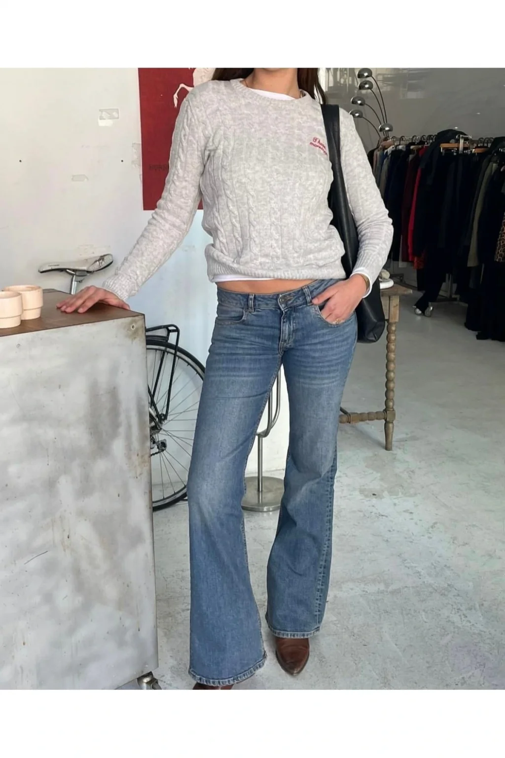 Y2K Vintage Ön Cep Detaylı Gri Düşük Bel Flared Bootcut Jean