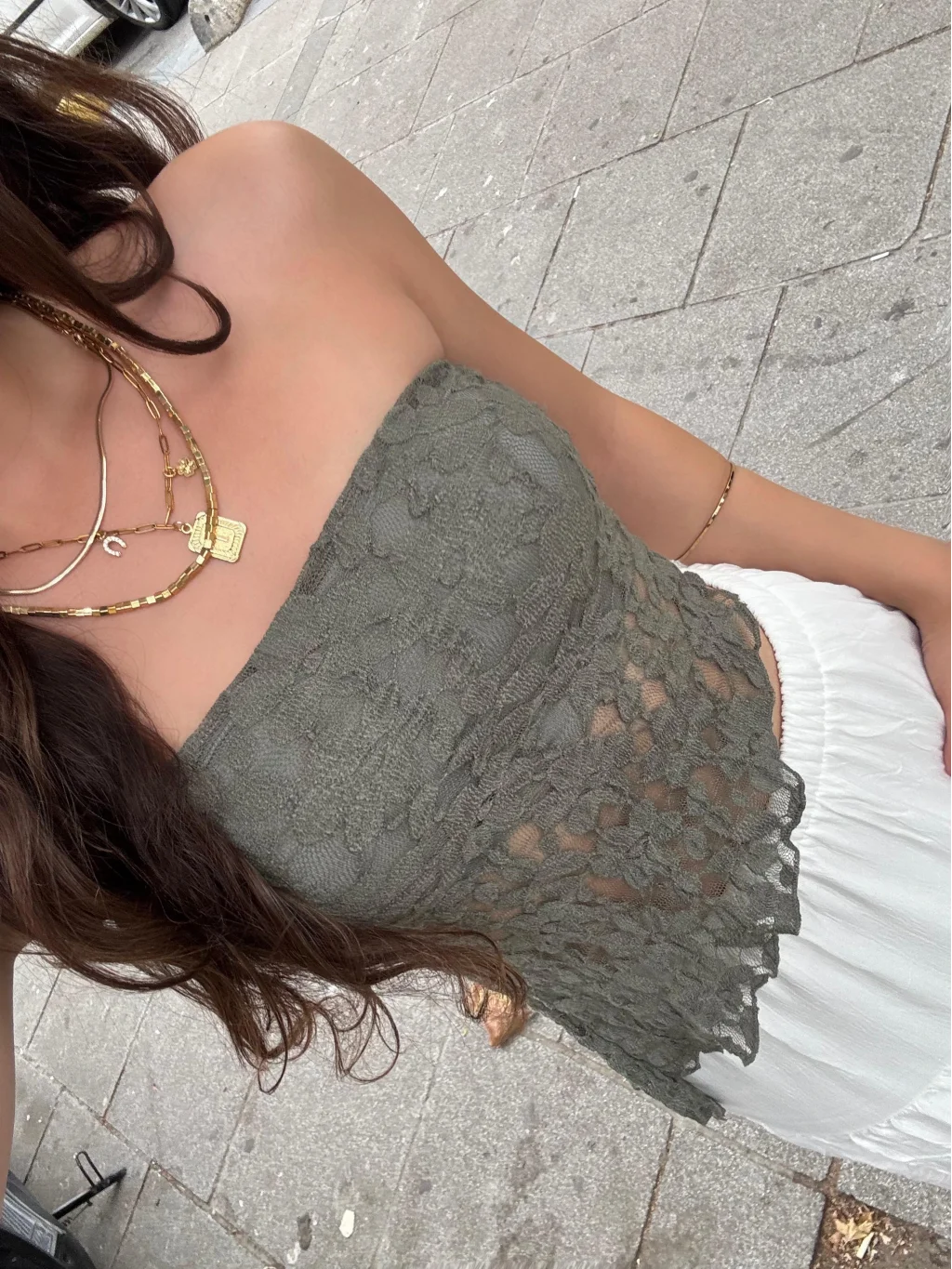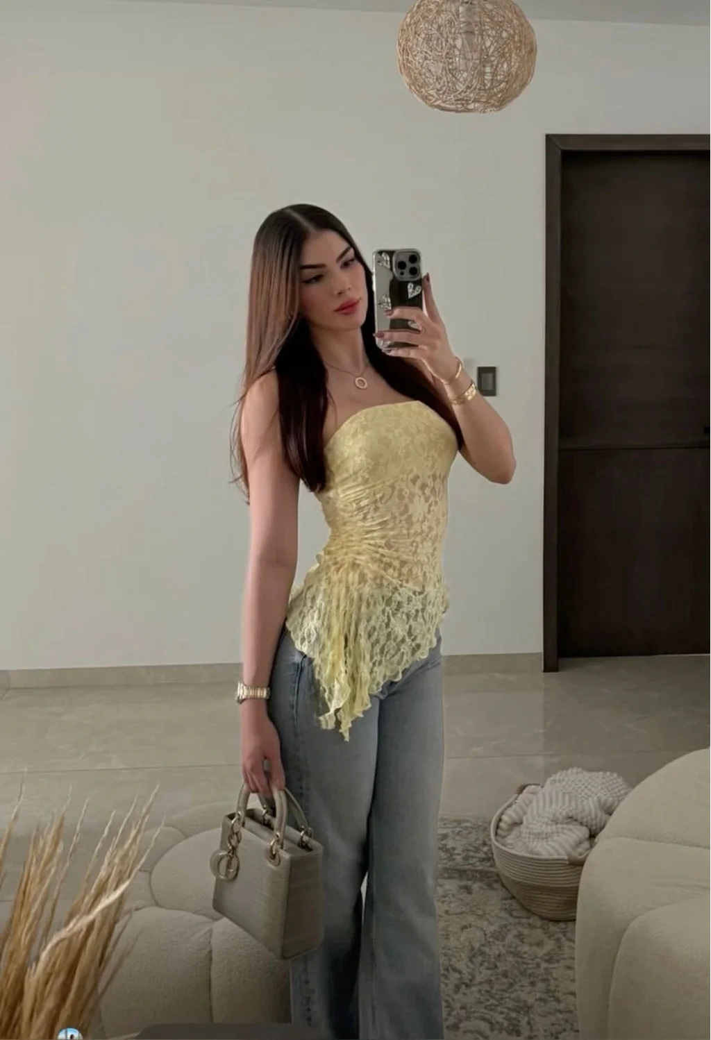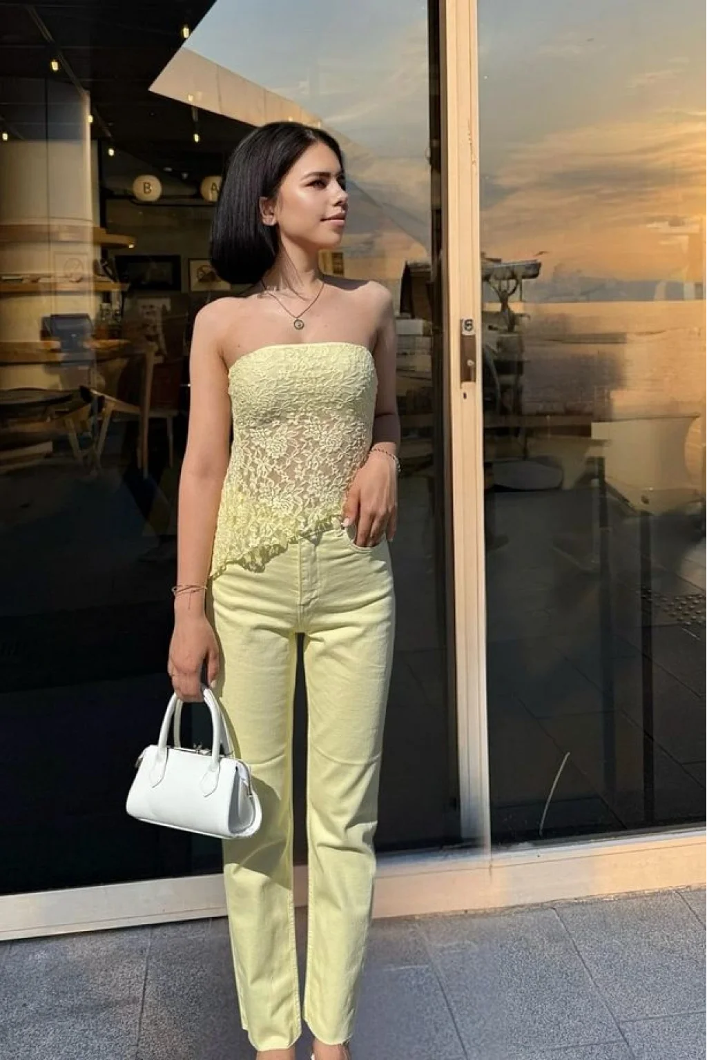 %95 Polyester ve %5 Elastan kumaştan üretilen bu Slim Fit straplez bluz, üst bedeninizi zarifçe saran sıkı formu ile feminen siluet oluşturur. Astarlı iç yapısı sayesinde transparan görünüm önlenir, konfor ve güven sağlar. Asimetrik kesimi ve zarif dantel detayları, bluzun özel ve modern bir görünüm sunmasını destekler.