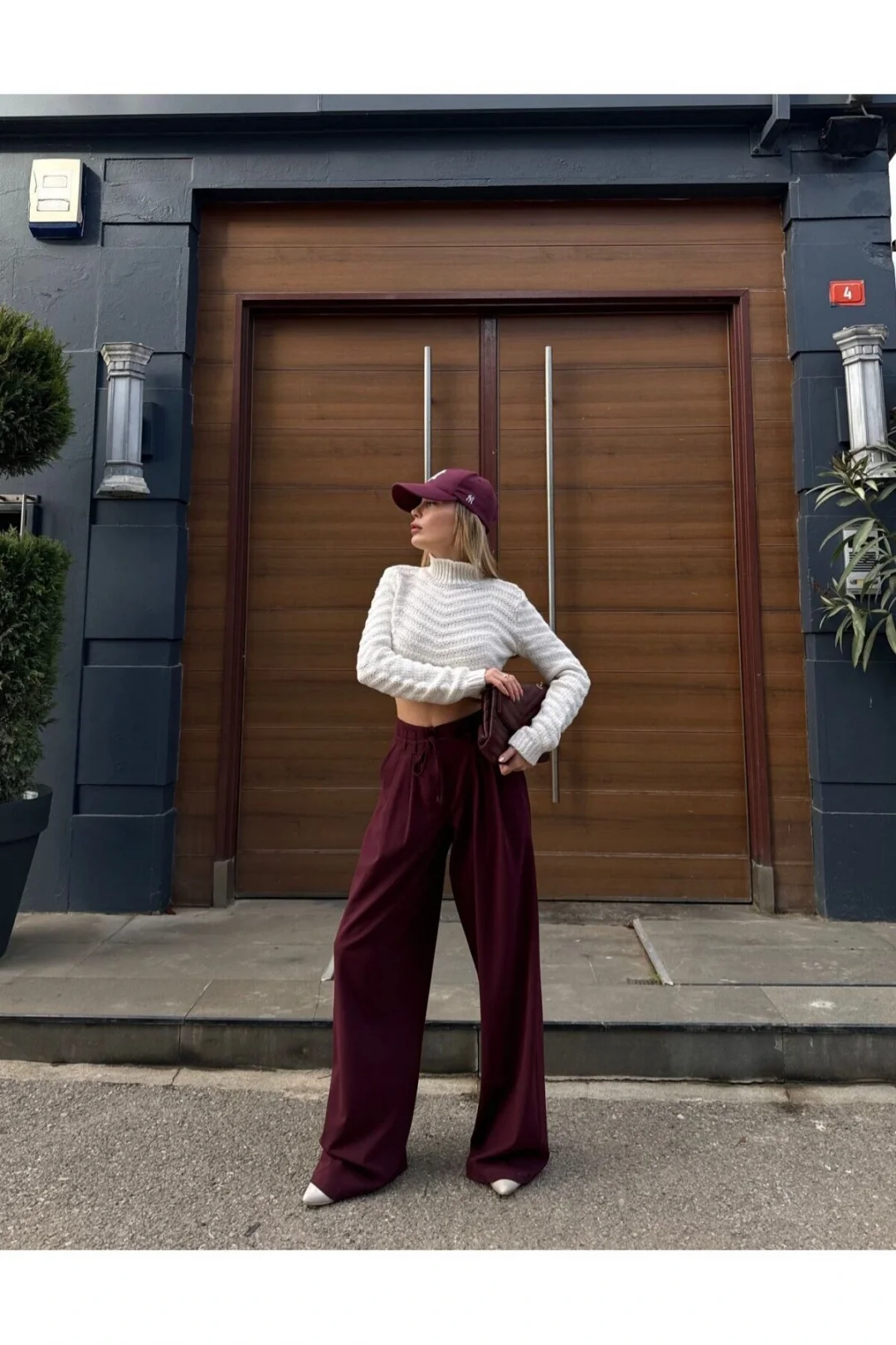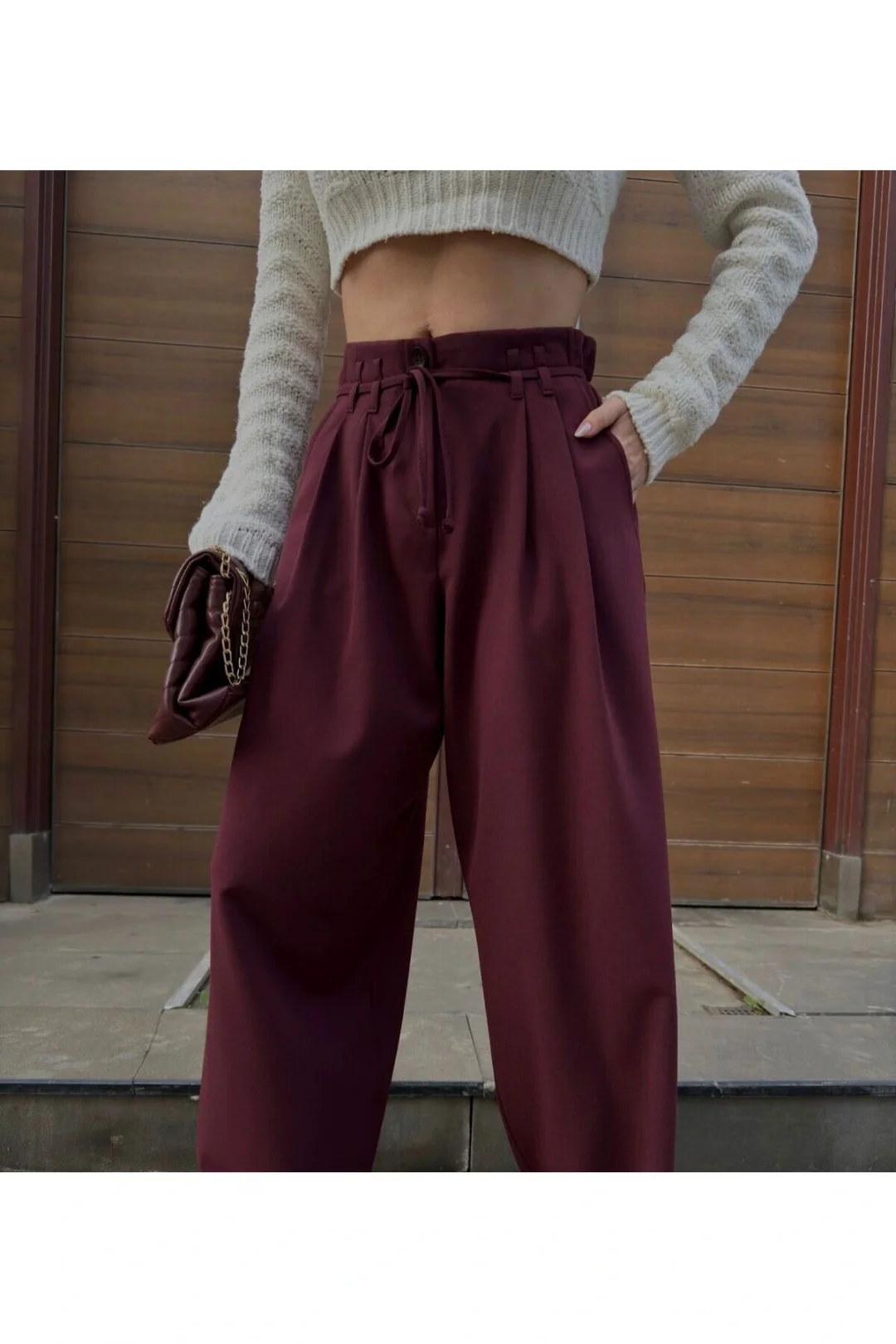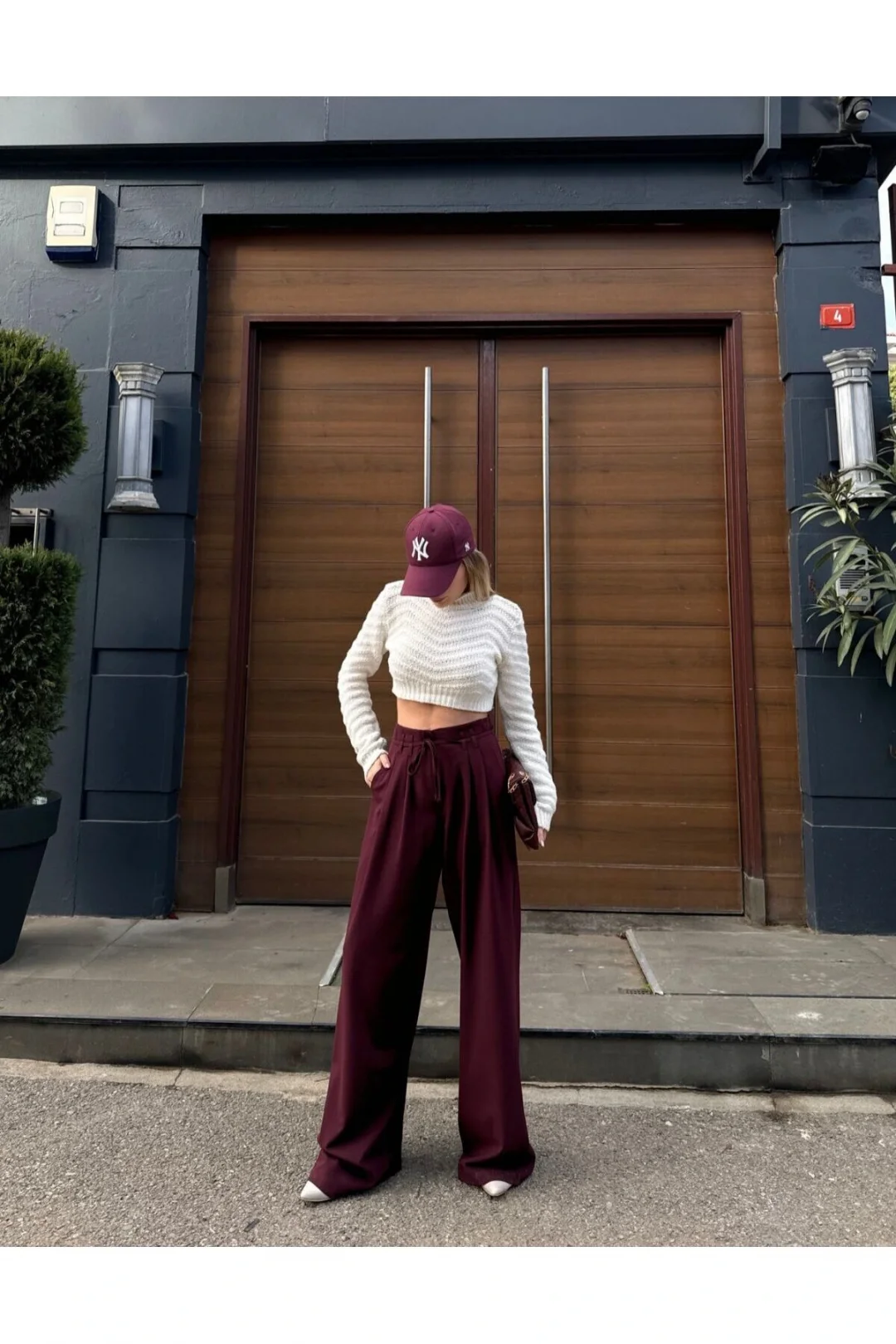 Kadın Yüksek Bel Pileli Füme Modal Karışımlı Bol Paça Uzun Pantolon
