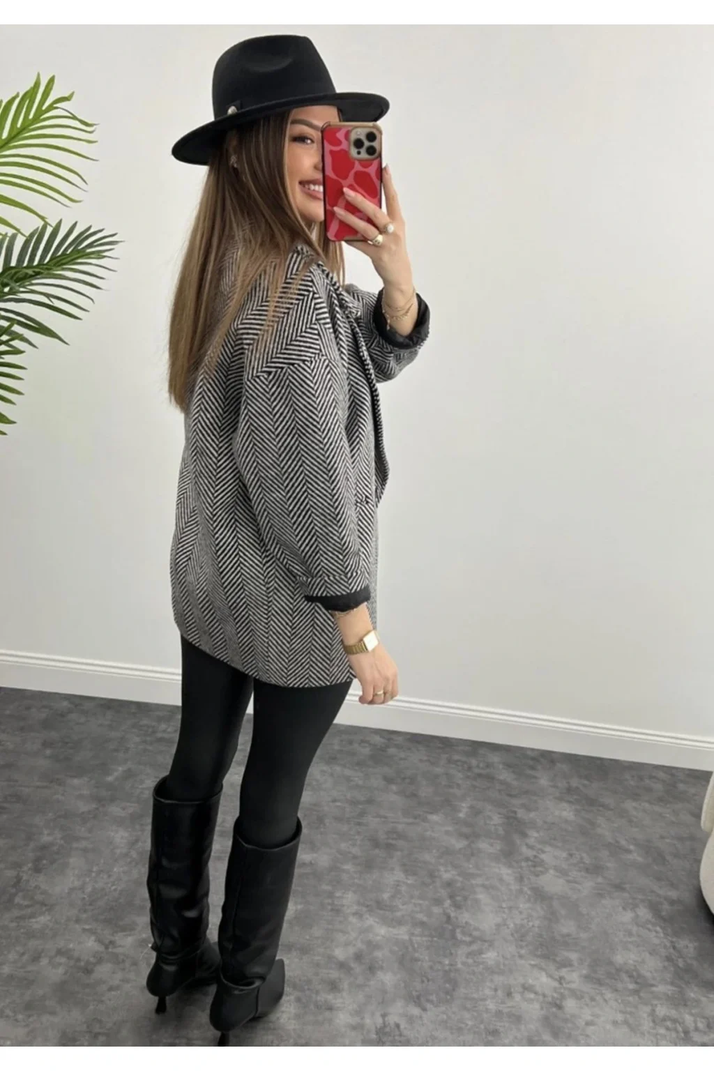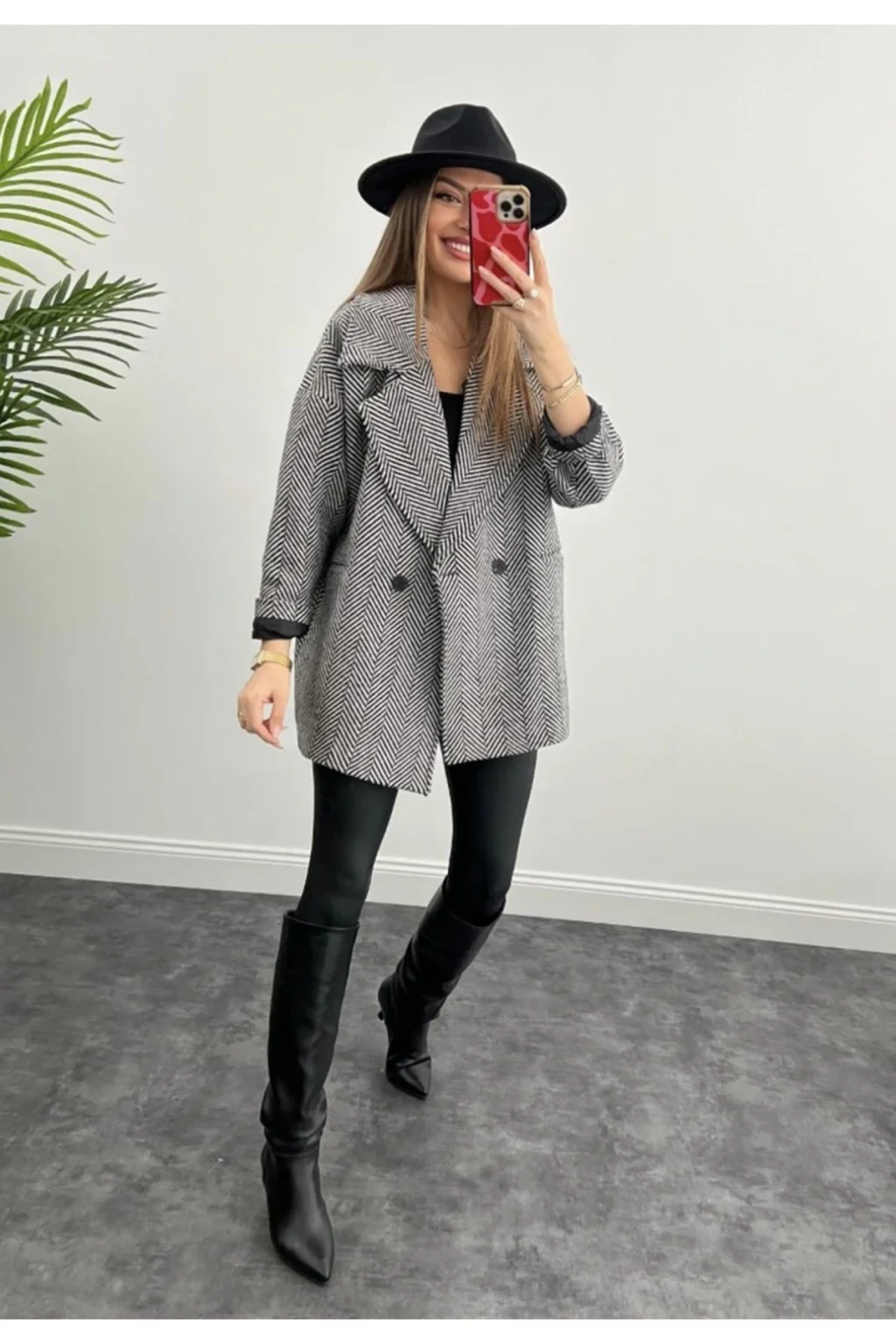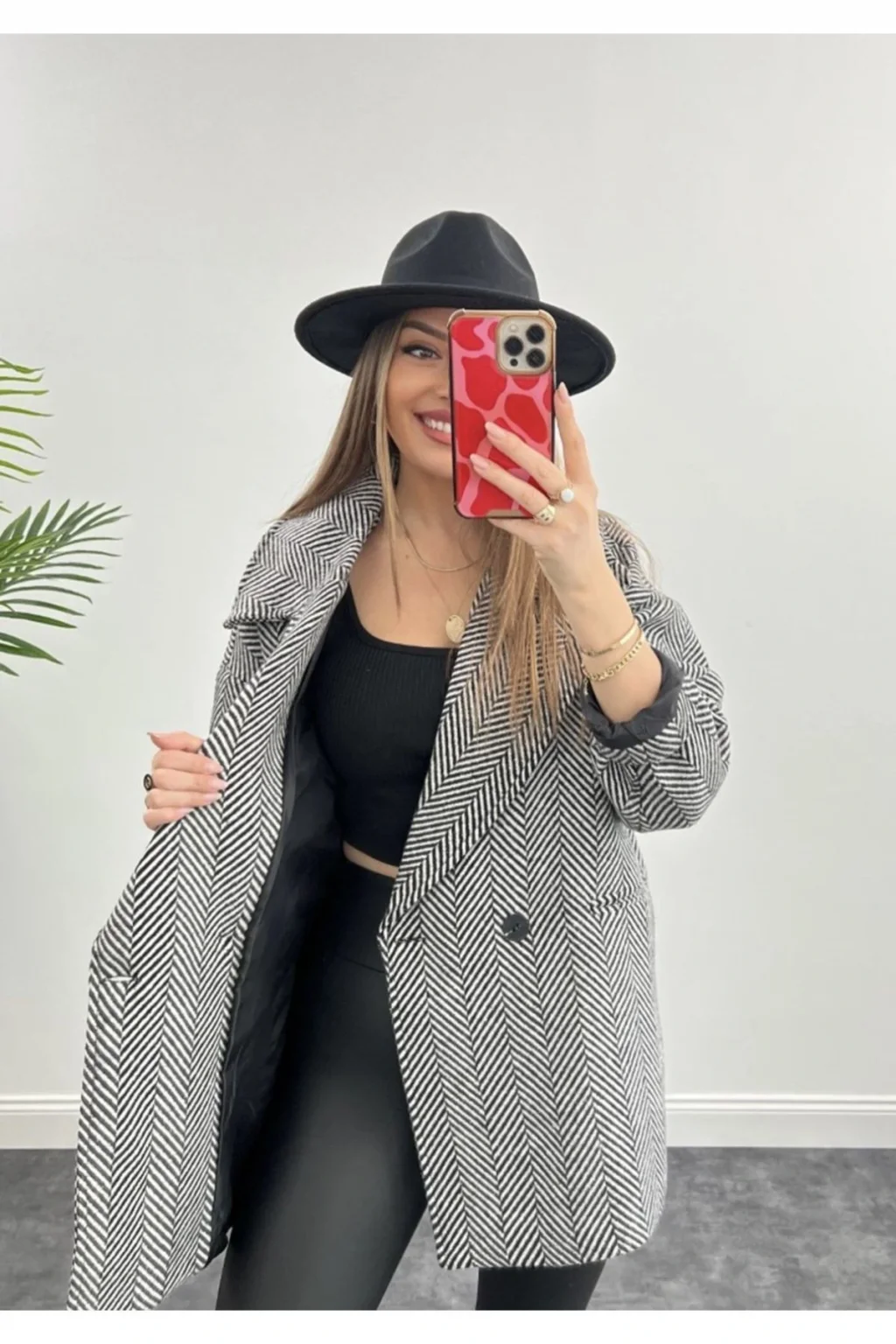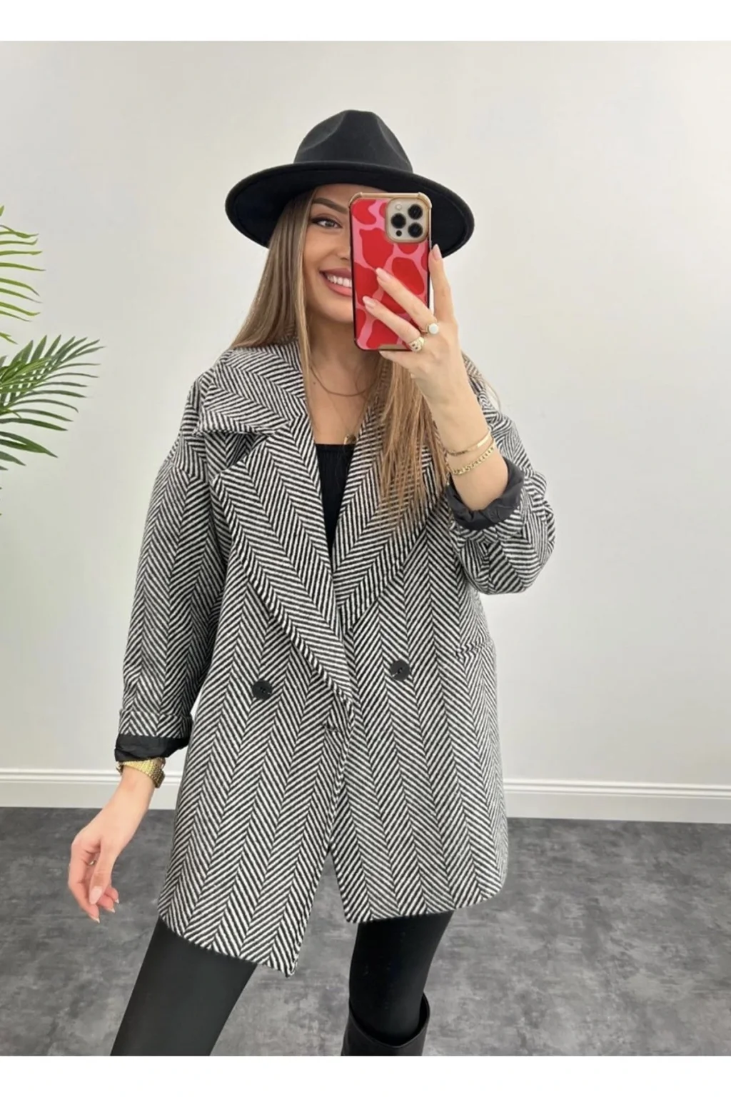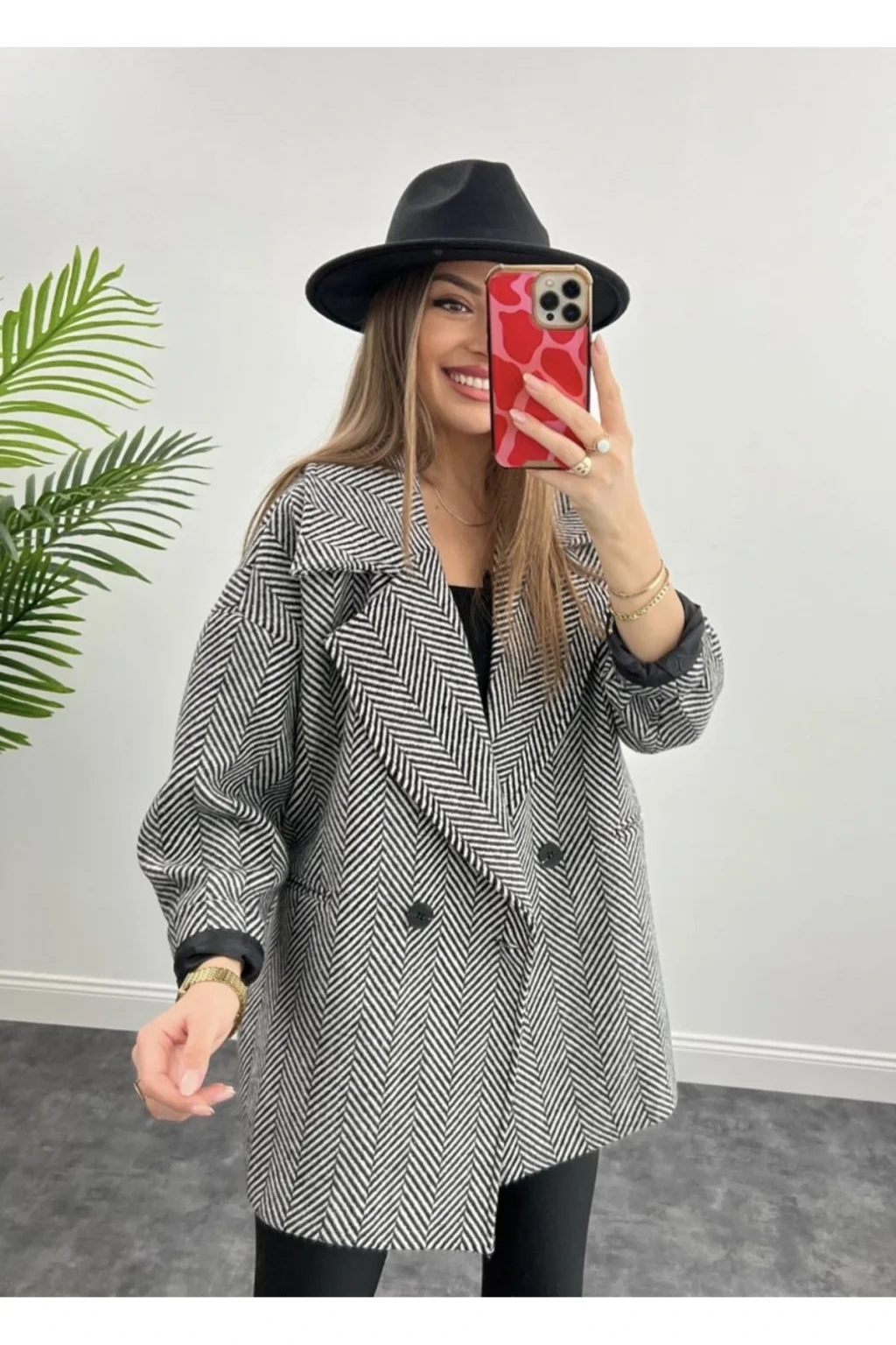 Oversize kalıbı ile rahat bir kullanım sunan bu kaşe kaban, günlük stilinizi tamamlayacak şık bir aksesuardır.; Dokuma kumaşı sayesinde dayanıklı ve kaliteli bir yapıya sahiptir; kuş tüyü karışımlı dolgu materyali ise soğuk havalarda sizi sıcak tutar.; Balık sırtı dokuma tipi, modern ve zarif bir görünüm kazandırırken, astarlı yapısıyla konforlu bir kullanım sağlar.; Günlük stilinize uyum sağlayacak şekilde tasarlanmış bu kaban, casual ortamlarda rahatlıkla tercih edilebilir.; Standart kol uzunluğu ve regular boyu ile vücut hatlarınıza uyum sağlayarak şık bir duruş sergiler.; Siyah rengi ve düz tasarımı ile her türlü kıyafetle kolayca kombinlenebilir; çift cepli yapısı pratiklik sunar.; Kalın yapısıyla soğuk havalarda ekstra sıcaklık sağlarken, rüzgar geçirmez özelliği de sizi dışarıdaki rüzgarlardan korur.; Kruvaze yaka tipi ile modern ve sofistike bir hava verirken, balık sırtı deseniyle göz alıcı detaylara sahiptir.;