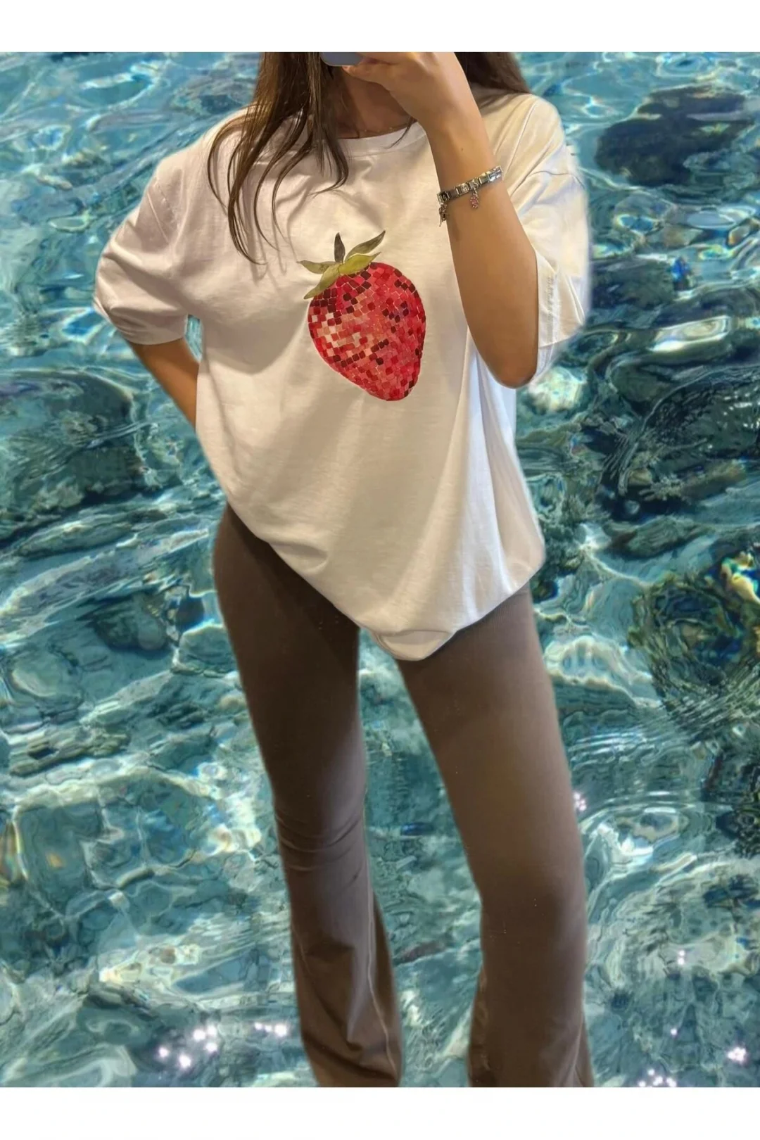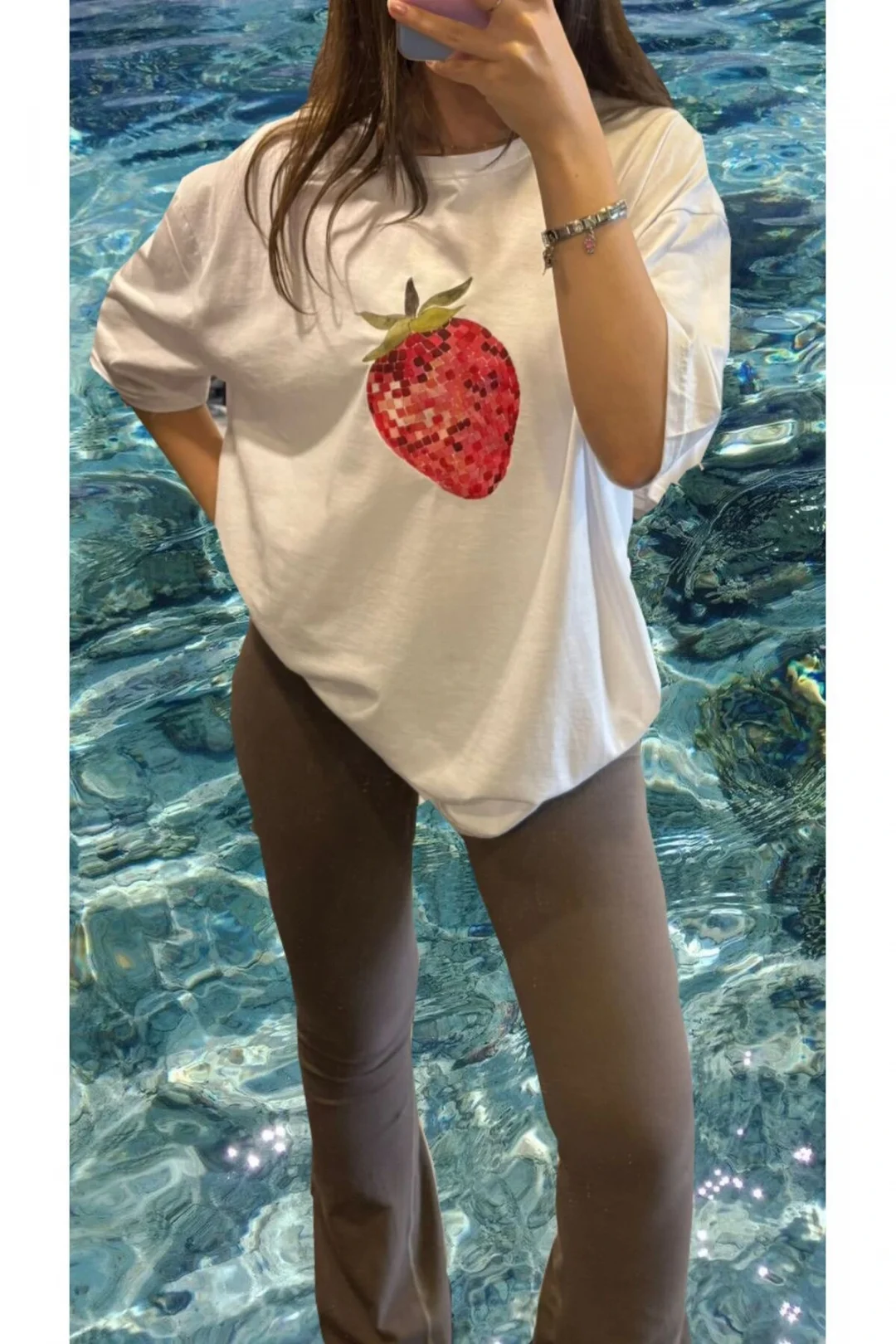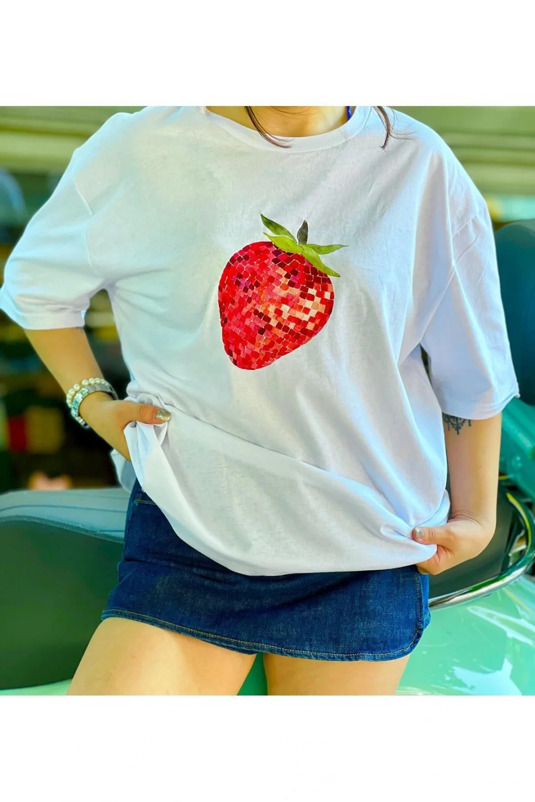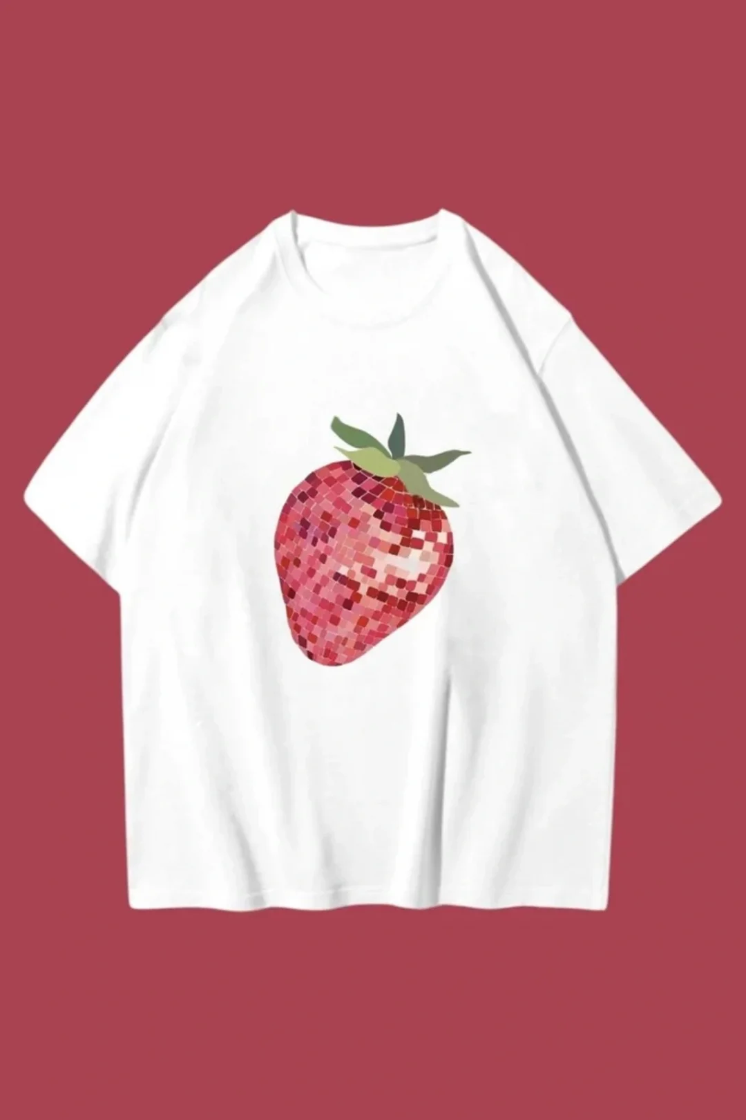 Oversize t-shirt ile tarzınızı özgürce yansıtın.; ; Unisex kalıbı sayesinde kadın ve erkek kullanıcılar için uygundur.; ; Modern çilek baskısı ile enerjik ve dikkat çekici bir görünüm sunar.; ; Yüksek pamuk oranı ile nefes alabilen ve konforlu bir kullanım sağlar.; ; %95 pamuk ve %5 elastan karışımı kumaşı sayesinde yumuşak ve esnektir.; ; Beyaz zemin üzerine kırmızı tonlarda çilek figürü ile tasarlanmıştır.; ; Günlük stil ve sokak modası için ideal bir alternatiftir.; ; Farklı vücut tiplerine uygun oversize kesimiyle rahatlık sunar.; ; Kot pantolon ve spor ayakkabılarla rahat kombinler oluşturulabilir.; ; Mini eteklerle genç ve enerjik bir görünüm elde edilebilir.; ; Denim ceketlerle katmanlı ve şık kombinler yapılabilir.; ; Sezonun öne çıkan oversize t-shirt trendleri arasında yer alır.; ; Yaz ve bahar aylarında hafif yapısı sayesinde rahatlıkla kullanılabilir.; ; Şehir stiline hareket ve canlılık katmak isteyenler için uygundur.; ; Gardırobun favori parçalarından biri olmaya adaydır.; ; Ürün, S bedende 54 cm en ve 70 cm boya sahiptir.; ; M beden 55 cm en ve 72 cm boy ölçülerindedir.; ; L beden 57 cm en ve 74 cm boy uzunluğuna sahiptir.; ; XL beden 58 cm en ve 75 cm boy ölçüsüne sahiptir.; ; Ters çevrilerek 30°C’de yıkanmalıdır.; ; Düşük ısıda ütülenmesi önerilir.; ; Denim pantolon, şort veya etek ile kolaylıkla kombinlenebilir.; ; Trendyol’da en çok aranan unisex oversize t-shirt modelleri arasında yer alır.; ; Çilek baskılı tasarımı ile genç ve dinamik bir stil oluşturur.