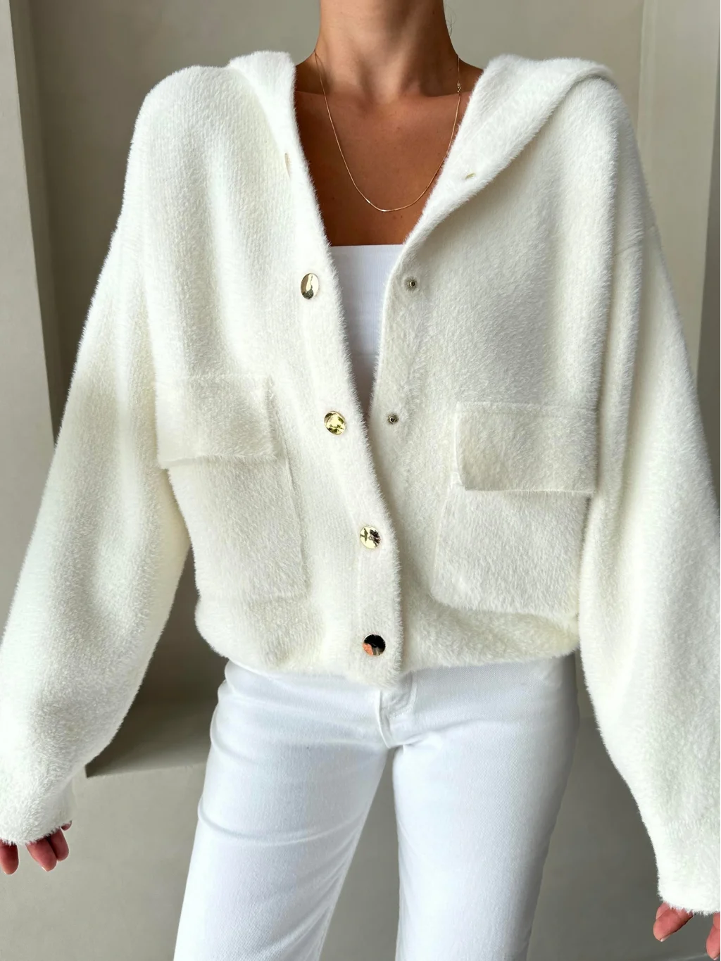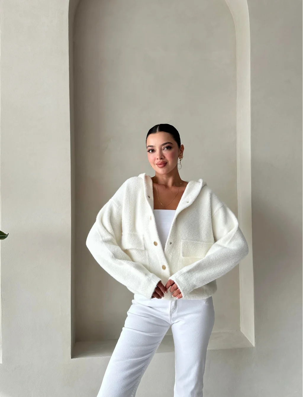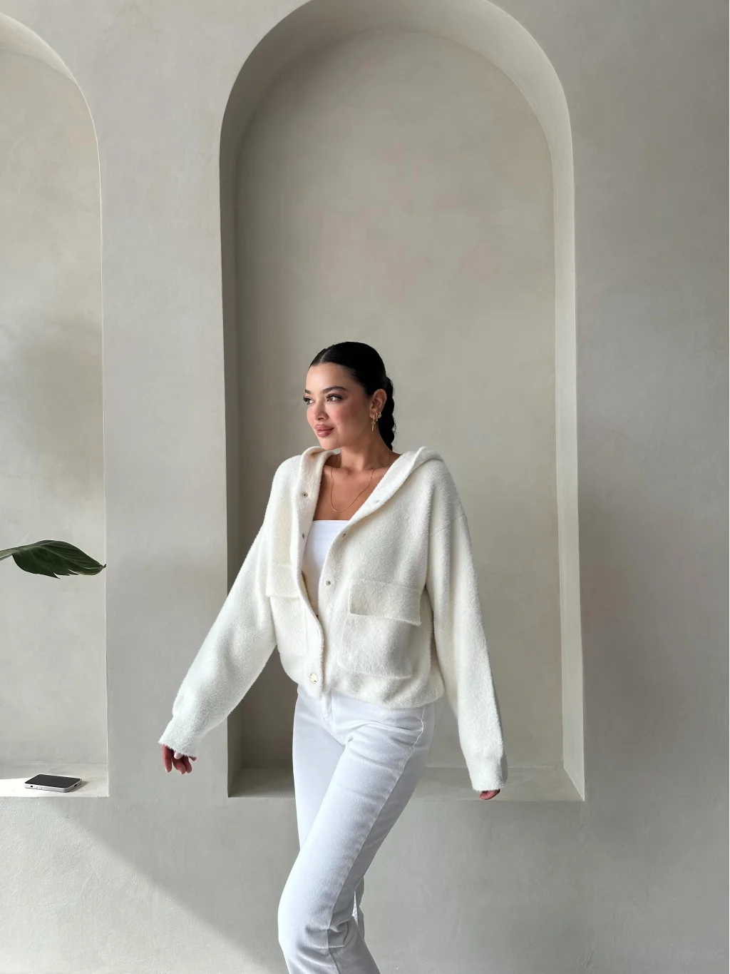 VibeGaia Beyaz Yumoş Kapüşonlu Ceket, şıklığı ve rahatlığı bir arada sunar.