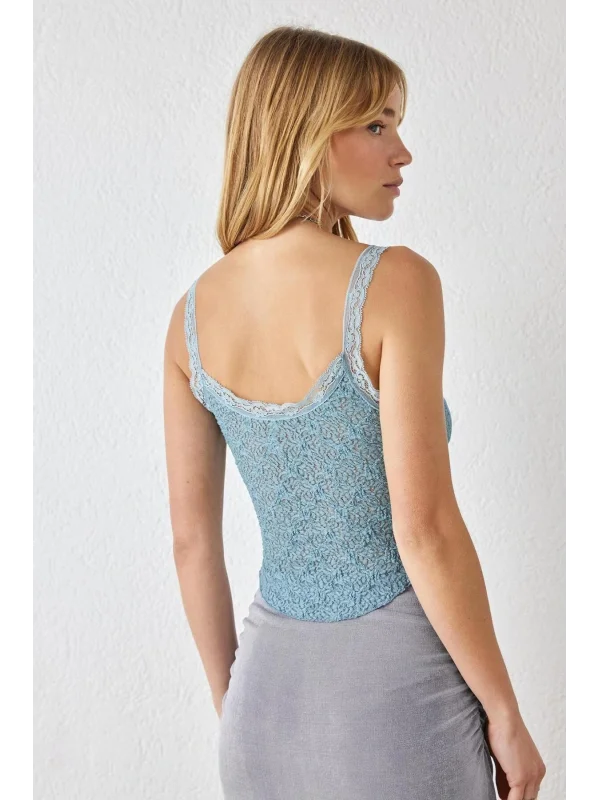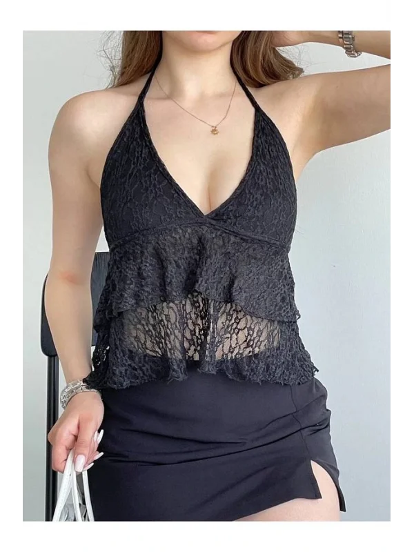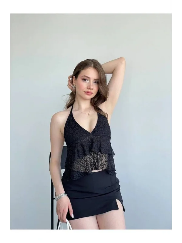 Dantelli Halter Yaka Sırt Dekolteli Transparan Katlı Crop Bluz