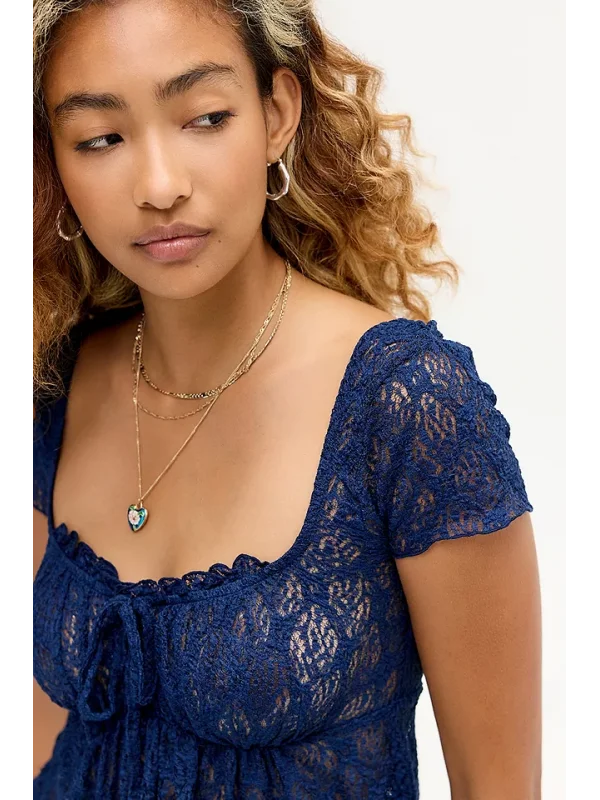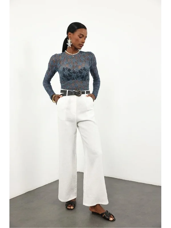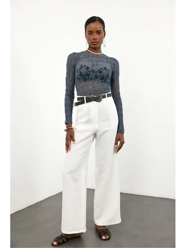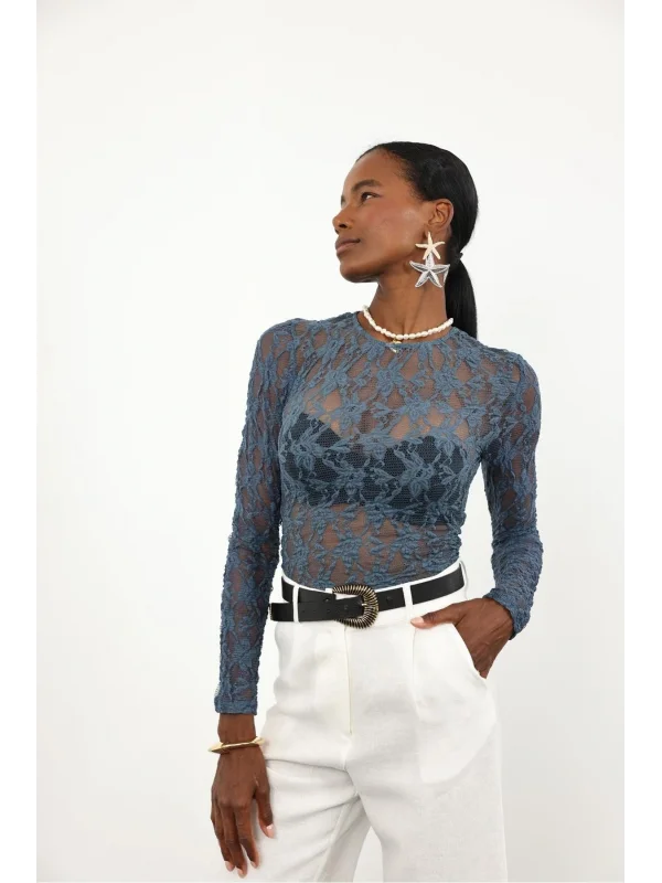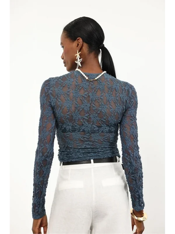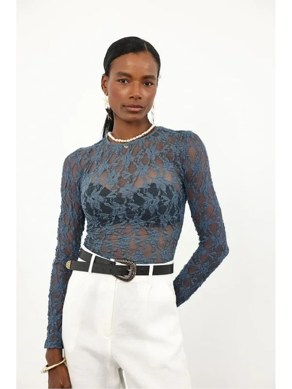 Petrol Mavisi Dantel Uzun kollu Bluz