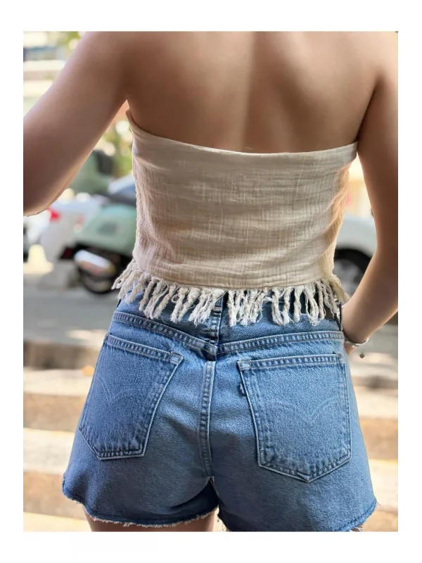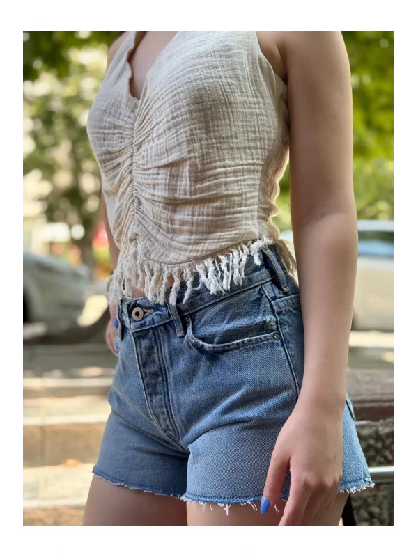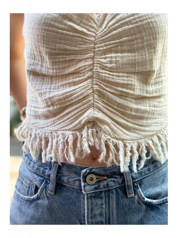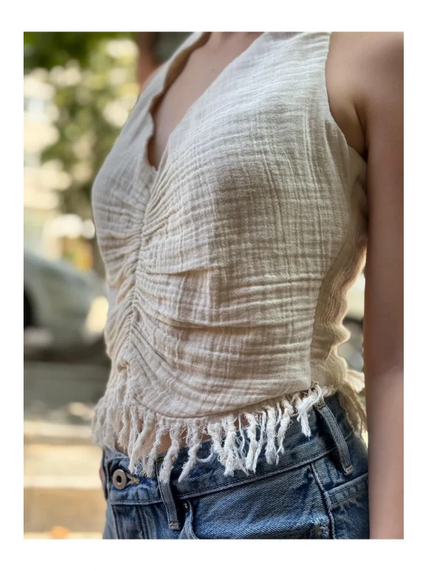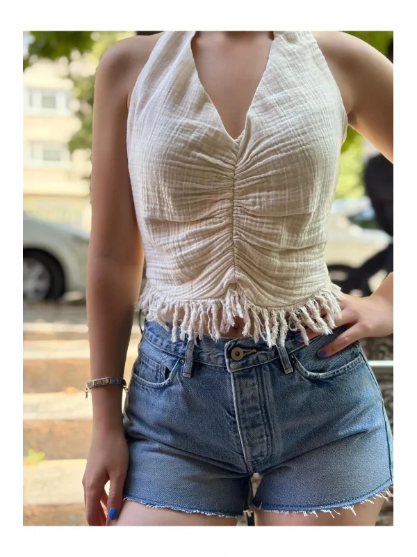 Boyundan Bağlamalı Püsküllü Keten-Pamuk Crop Bluz – Ekru