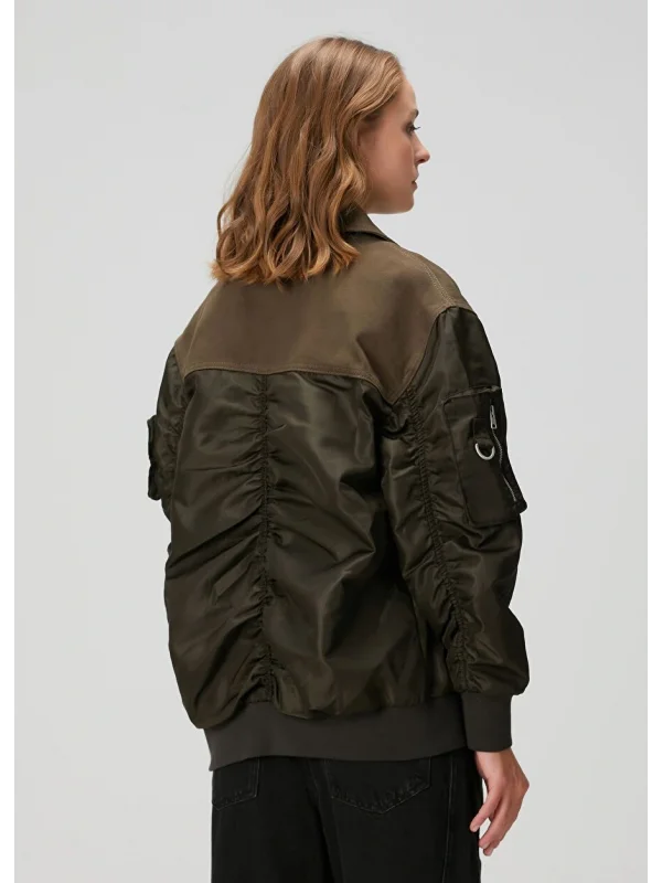 Unisex Gül Kurusu Kadife Yakalı Kürk Astar Detaylı Oversize Tuval Bomber Ceket