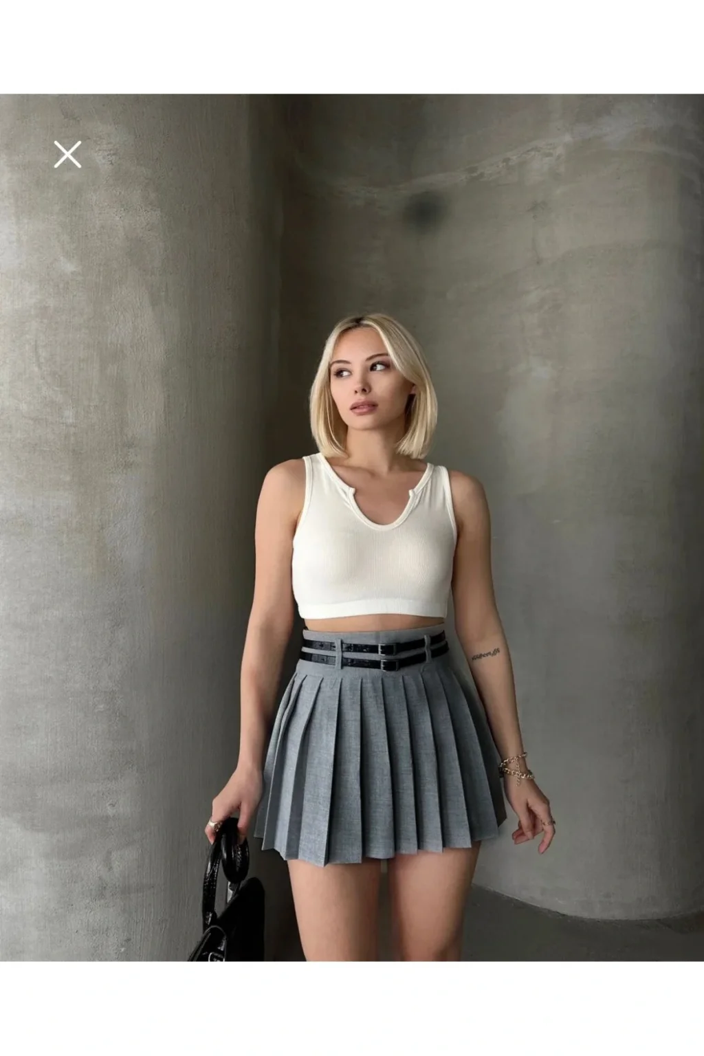 Kemerli Düşük Bel Kadife Gri Mini Etek