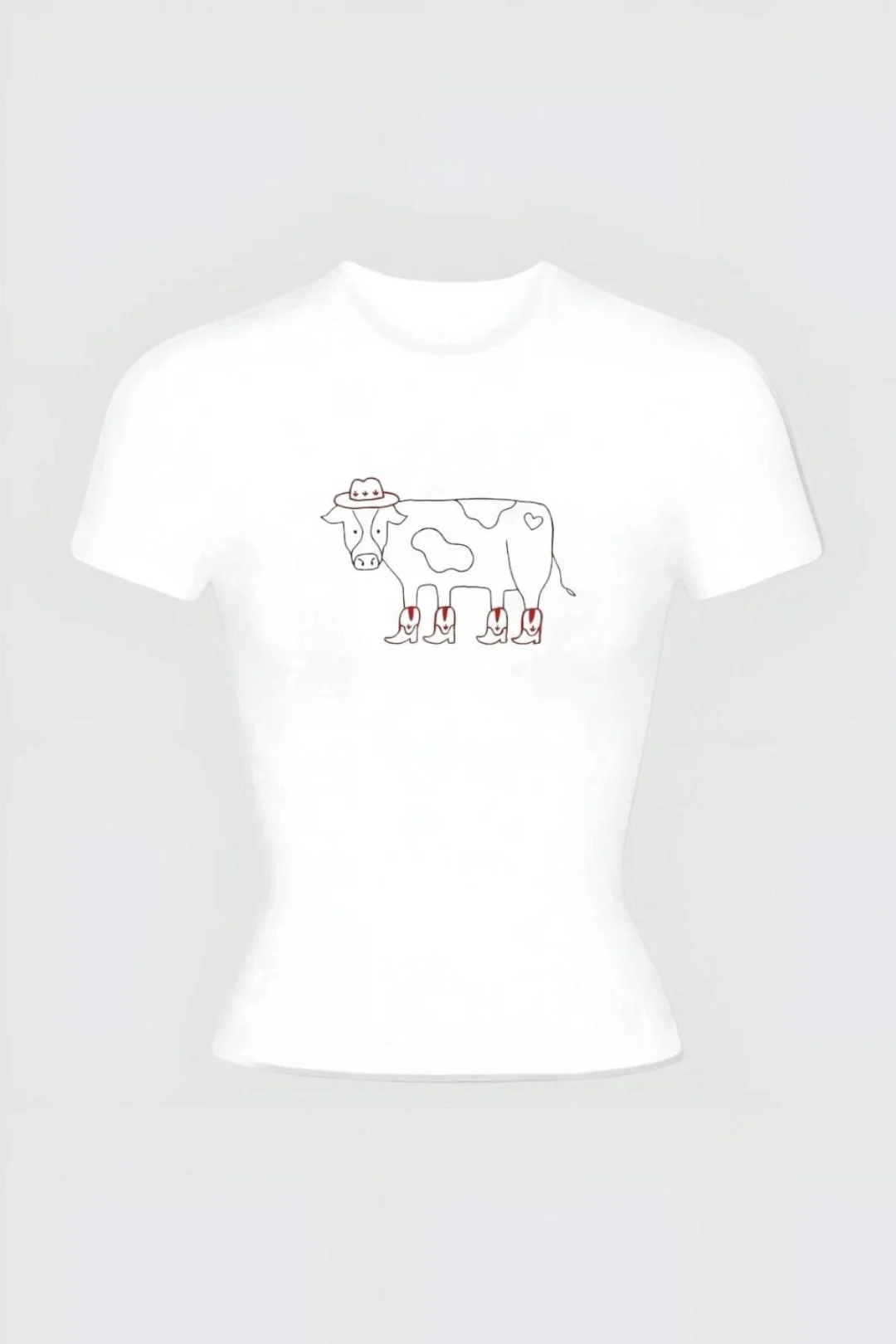 Cowboy Cow Baskılı Kadın Tam Boy Crop Bluz Pamuklu T-Shirt