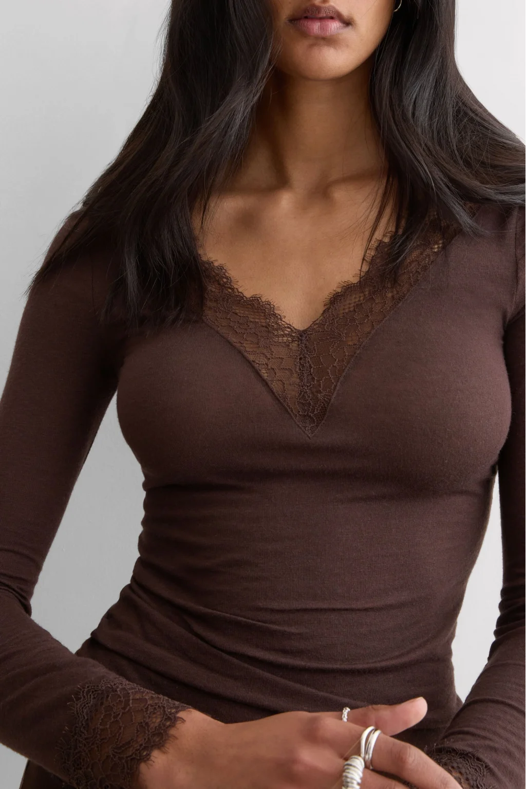 Dantel detaylı, modal ve ultra hafif kaşmir karışımlı bu uzun kollu bluz; yumuşak dokusu ve hafif yapısıyla gün boyu konfor sunar. V yaka kısmındaki zarif dantel detayı tasarıma feminen ve romantik bir dokunuş katar. Nefes alan ve ipeksi his veren kumaşı sayesinde hem günlük kullanımda hem özel anlarda şık bir tercih olur. İnce yapısı ile her mevsime uygun olan bu bluz, gardırobun zamansız parçalarından biridir. Ürünün formunu korumak için elde veya hassas programda yıkanması önerilir.