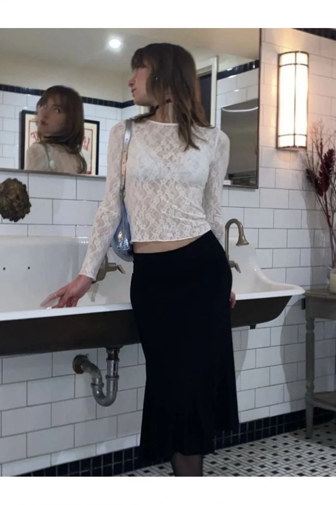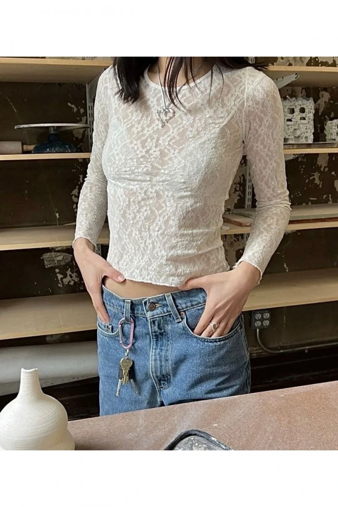 Y2K Vintage Kapitone Dokulu Fırfır Detaylı Gömlek Dantel Kollu Kısa Bluz