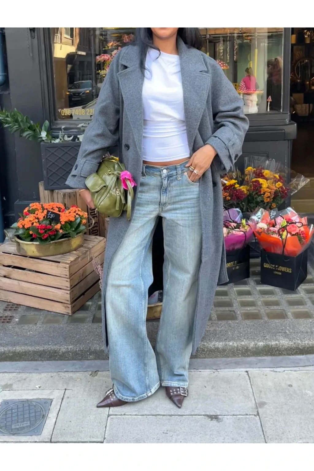Düşük Bel Gri Düz Paça Jean Pantolon