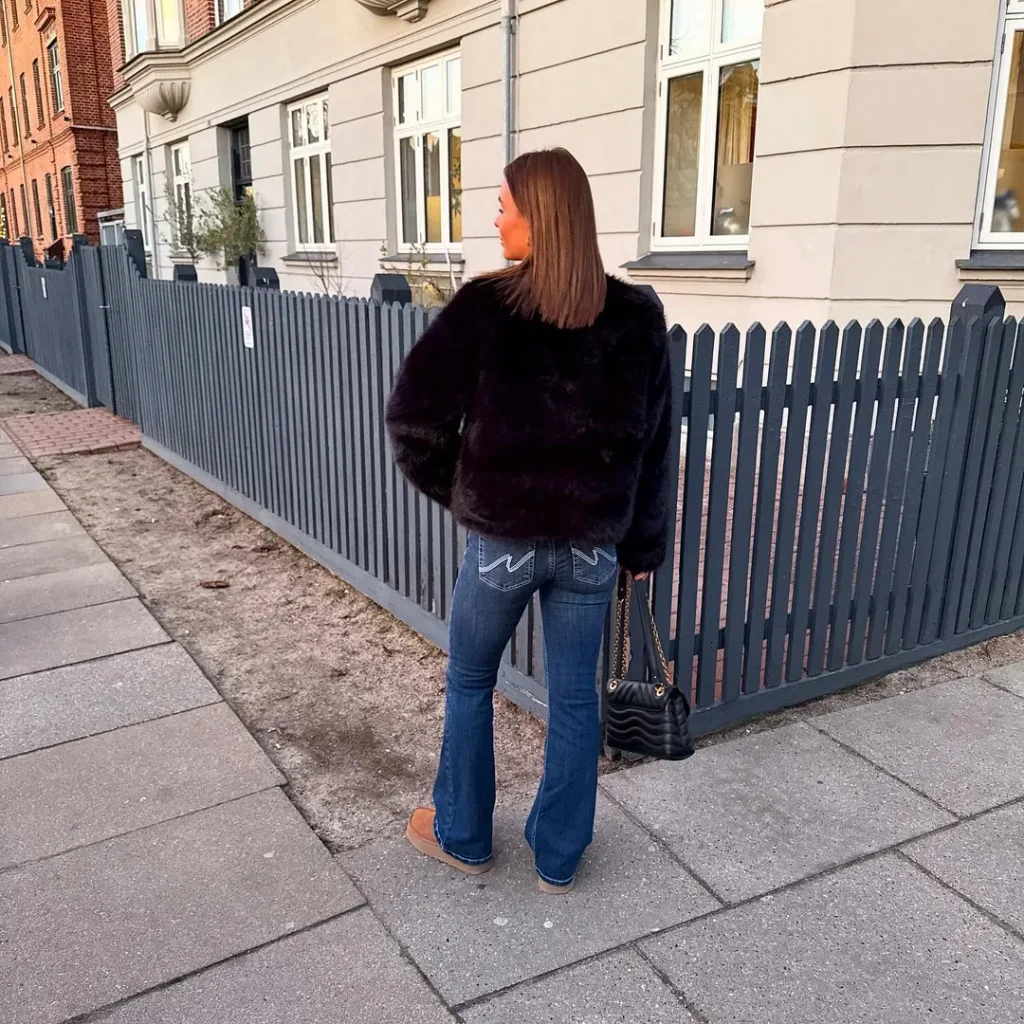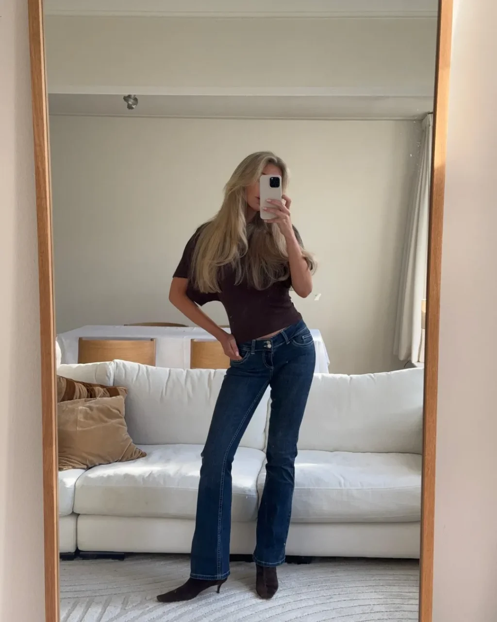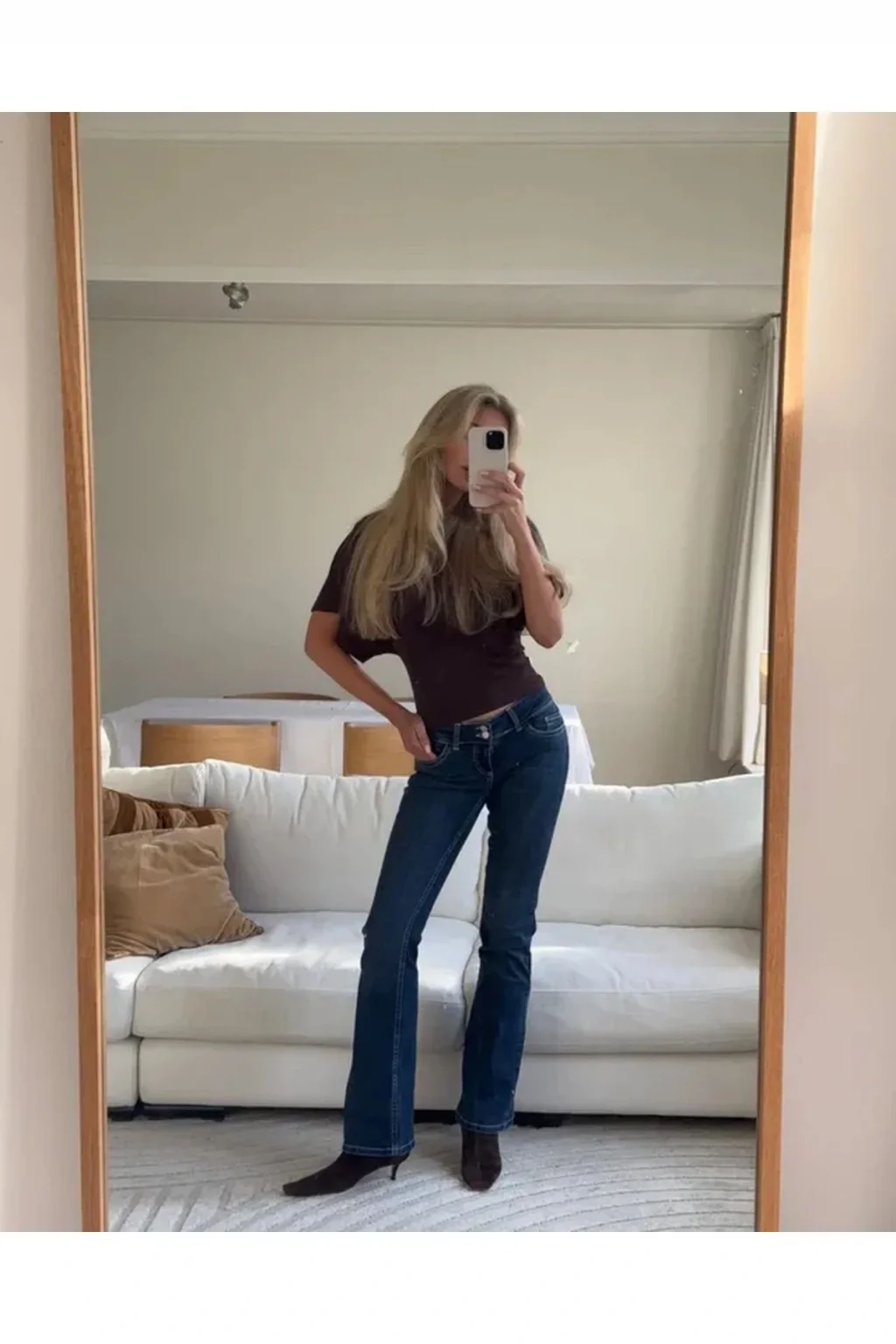 İspanyol paça kesimiyle bacak boyunu optik olarak uzatır, düşük bel detayıyla Y2K tarzının feminen enerjisini yansıtır. Günlük kombinlerde basic tişörtlerle sade bir görünüm oluşturabilir, akşam stilinde crop bluzlar veya gömleklerle şık bir etki yakalayabilirsiniz.
