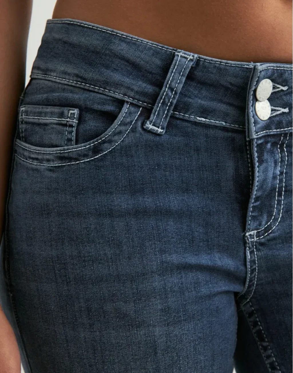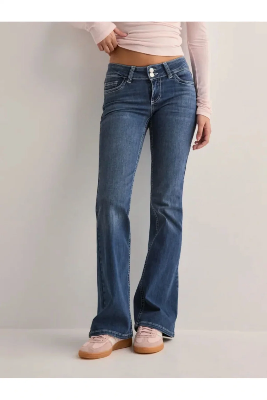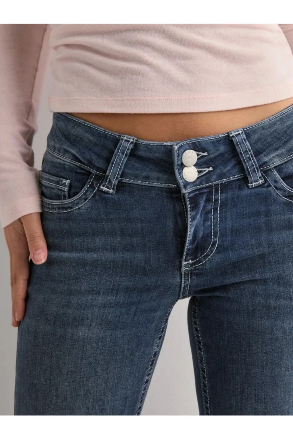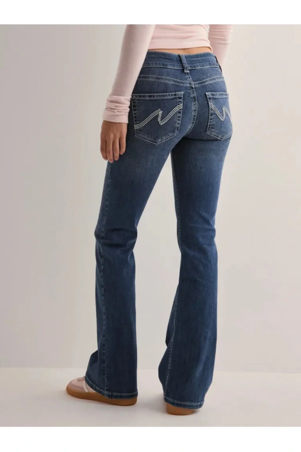 Klasik denim görünümünü modern hatlarla buluşturan bu düşük bel bootcut jean, zamansız bir siluet sunar. Vücudu saran formu, yüksek pamuk oranlı likralı kumaşı sayesinde gün boyu rahatlık sağlarken aynı zamanda toparlayıcı bir etki yaratır.