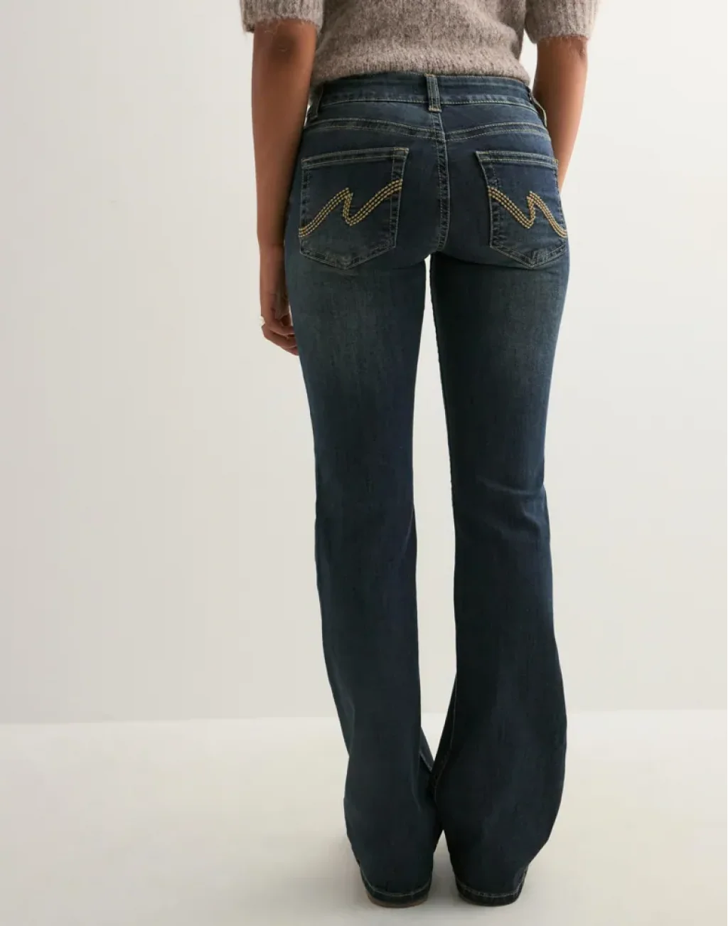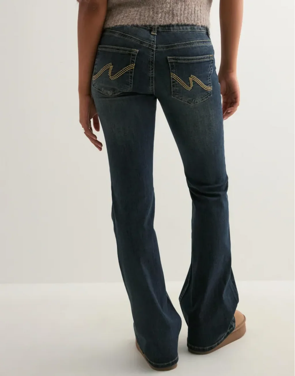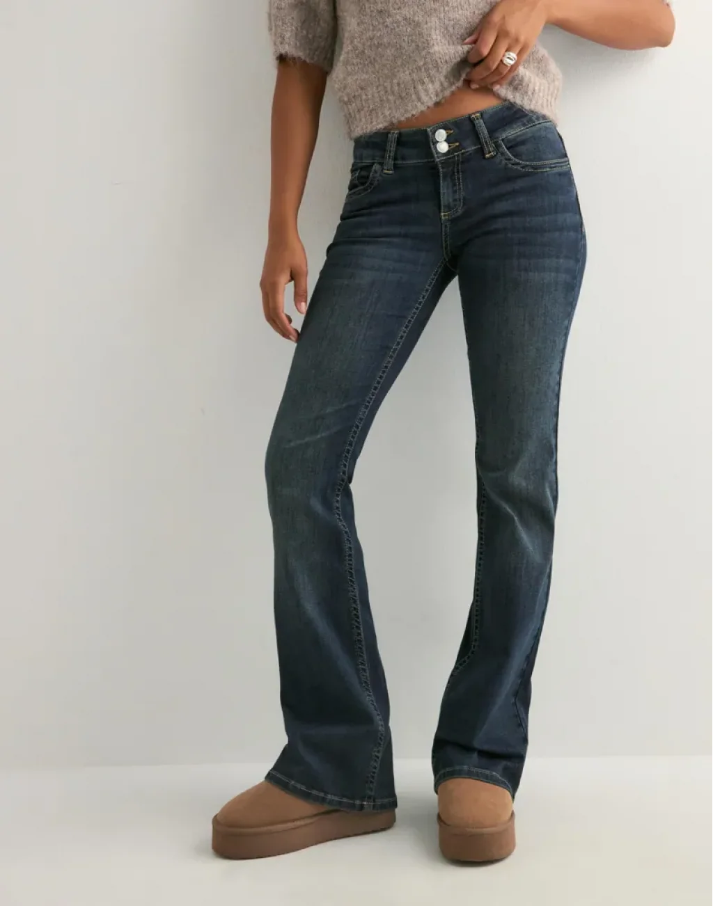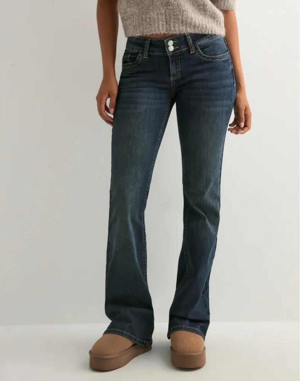 Klasik denim görünümünü modern hatlarla buluşturan bu düşük bel bootcut jean, zamansız bir siluet sunar. Vücudu saran formu, yüksek pamuk oranlı likralı kumaşı sayesinde gün boyu rahatlık sağlarken aynı zamanda toparlayıcı bir etki yaratır.