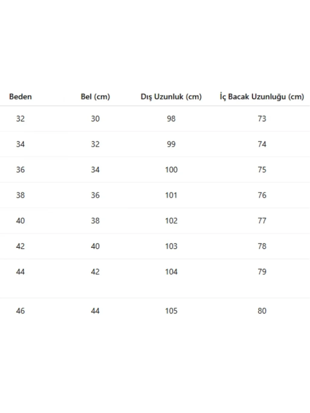 - Model ölçüsü: 36 beden (bel 34 cm, dış uzunluk 100 cm, iç bacak 75 cm)