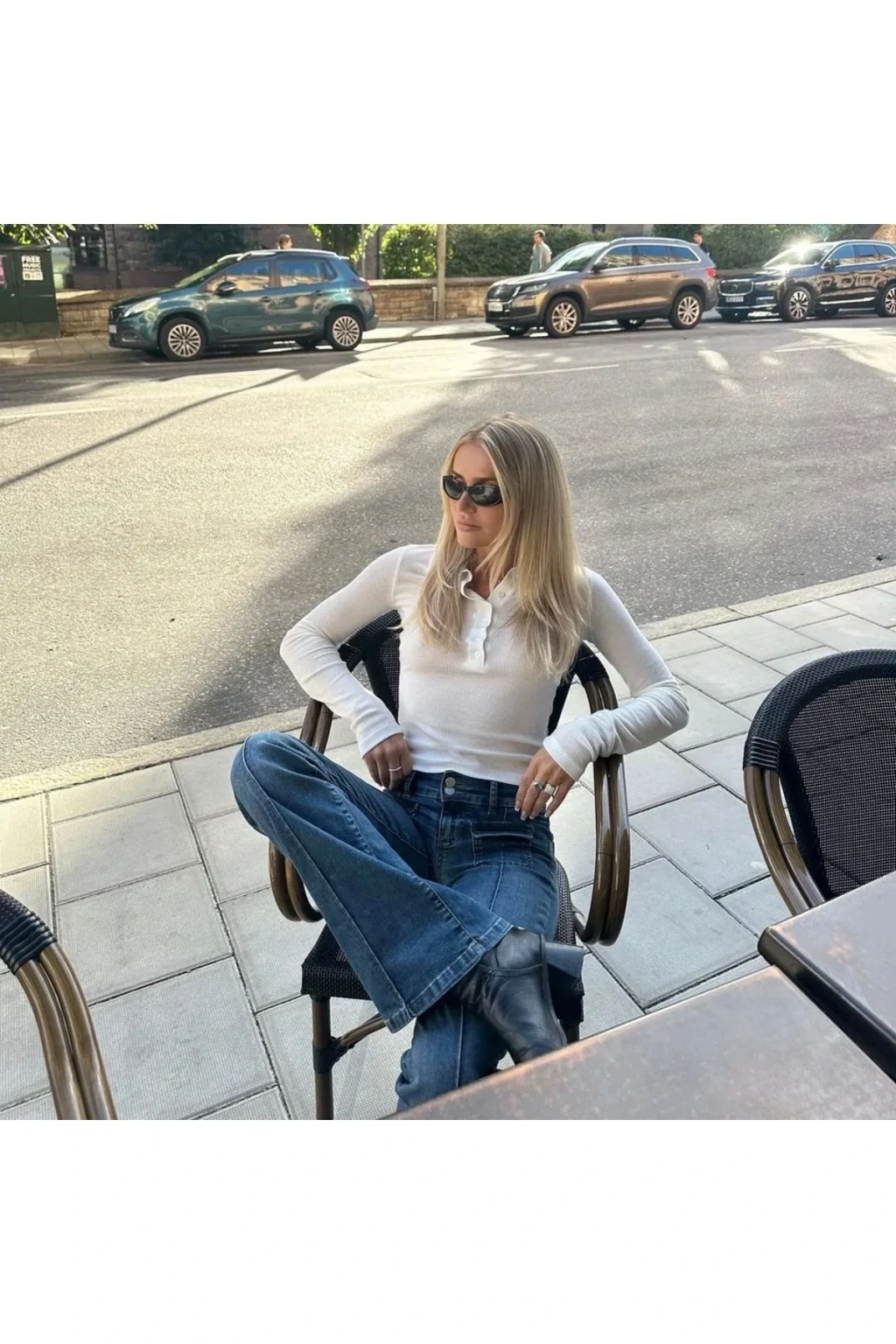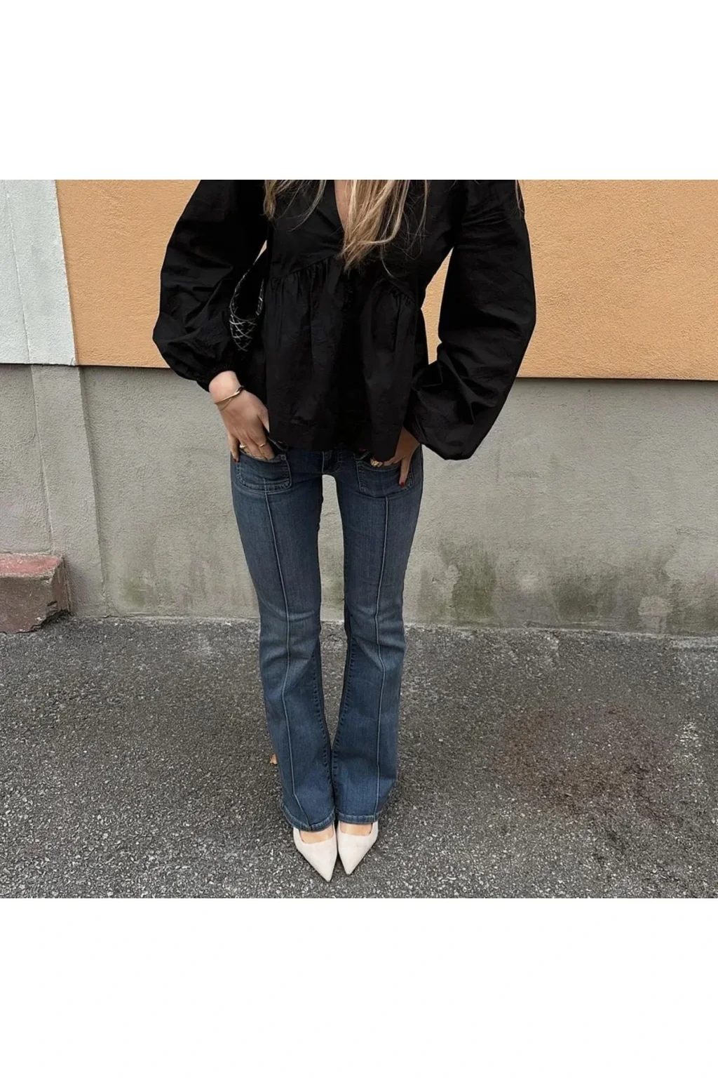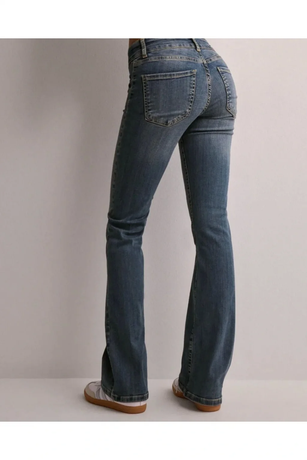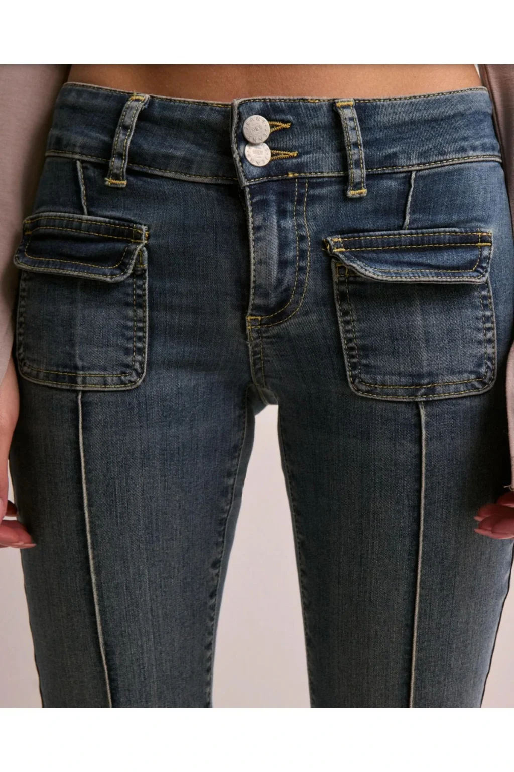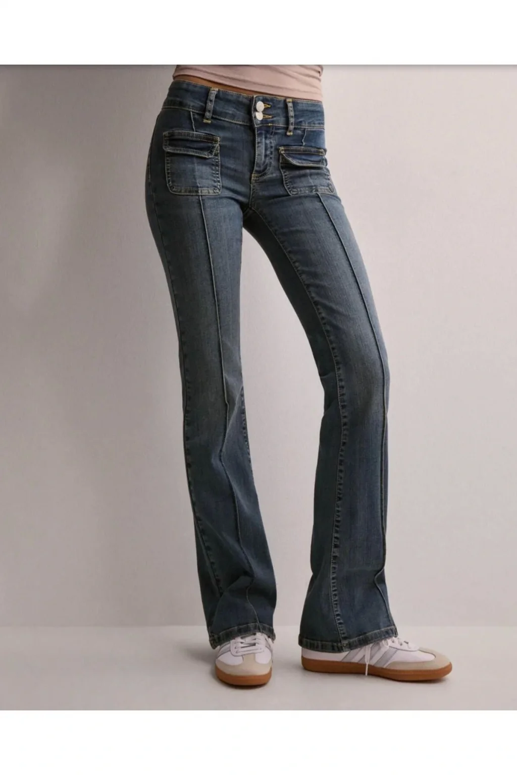 Diz hizasından itibaren genişleyen bootcut (İspanyol paça) formu, bacak boyunu optik olarak uzatarak daha dengeli ve zarif bir görünüm sağlar. Ön yüzeydeki dikiş detayları ve çift cepli tasarım, jean’e hem retro hem de modern bir dokunuş kazandırır.