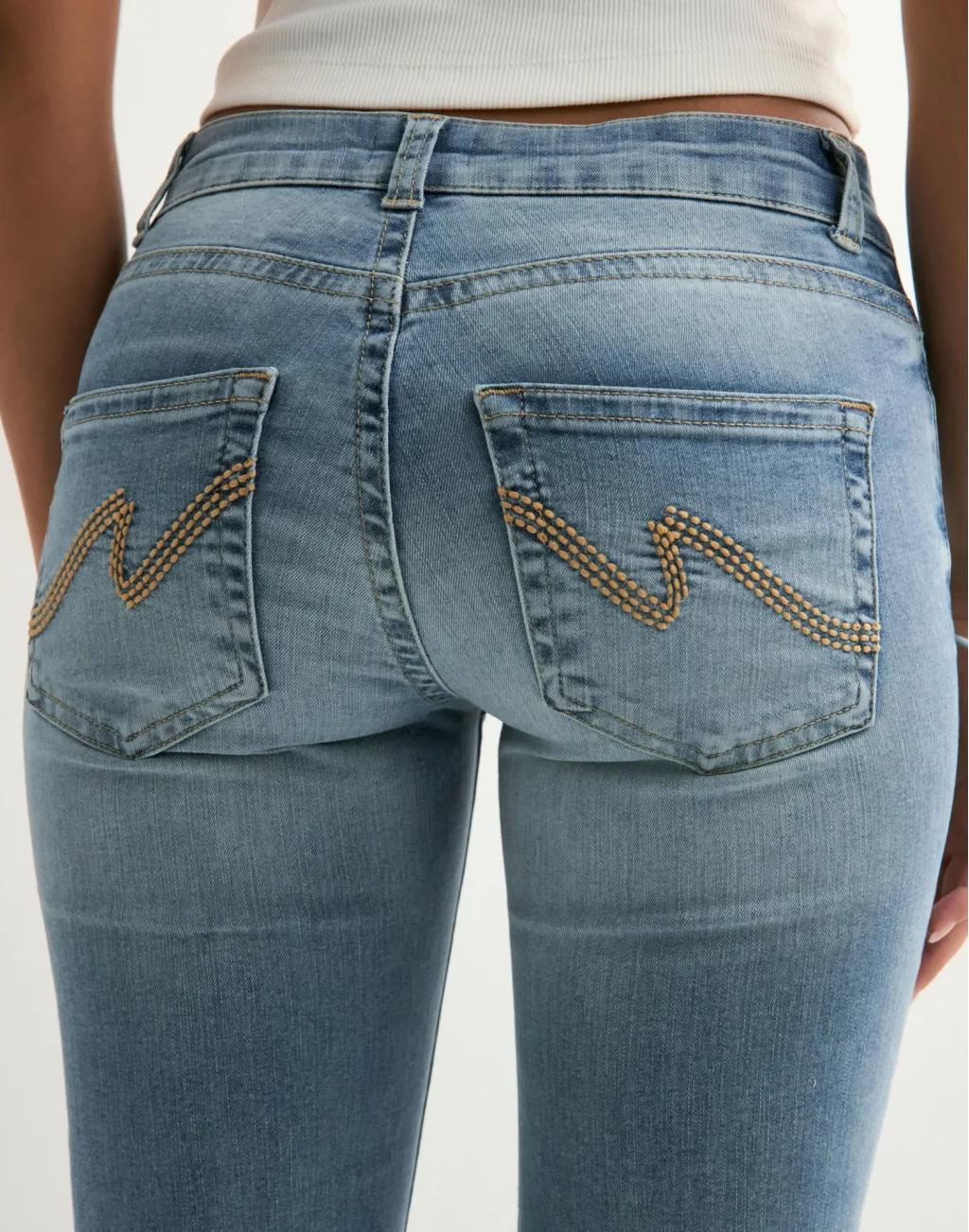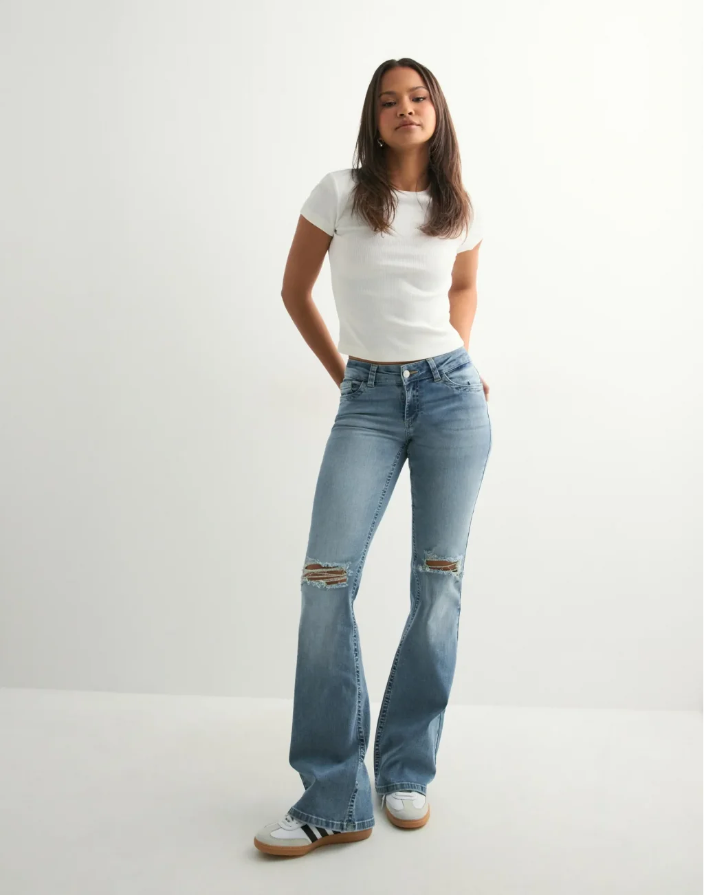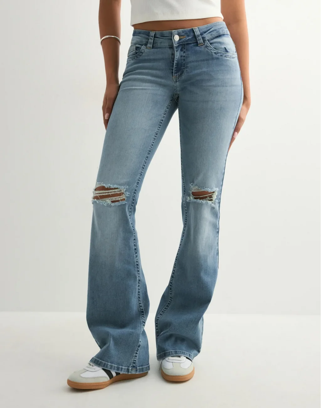Açık mavi düşük bel yırtık detaylı bootcut jean, retro stilin enerjisini günümüz trendleriyle harmanlıyor.