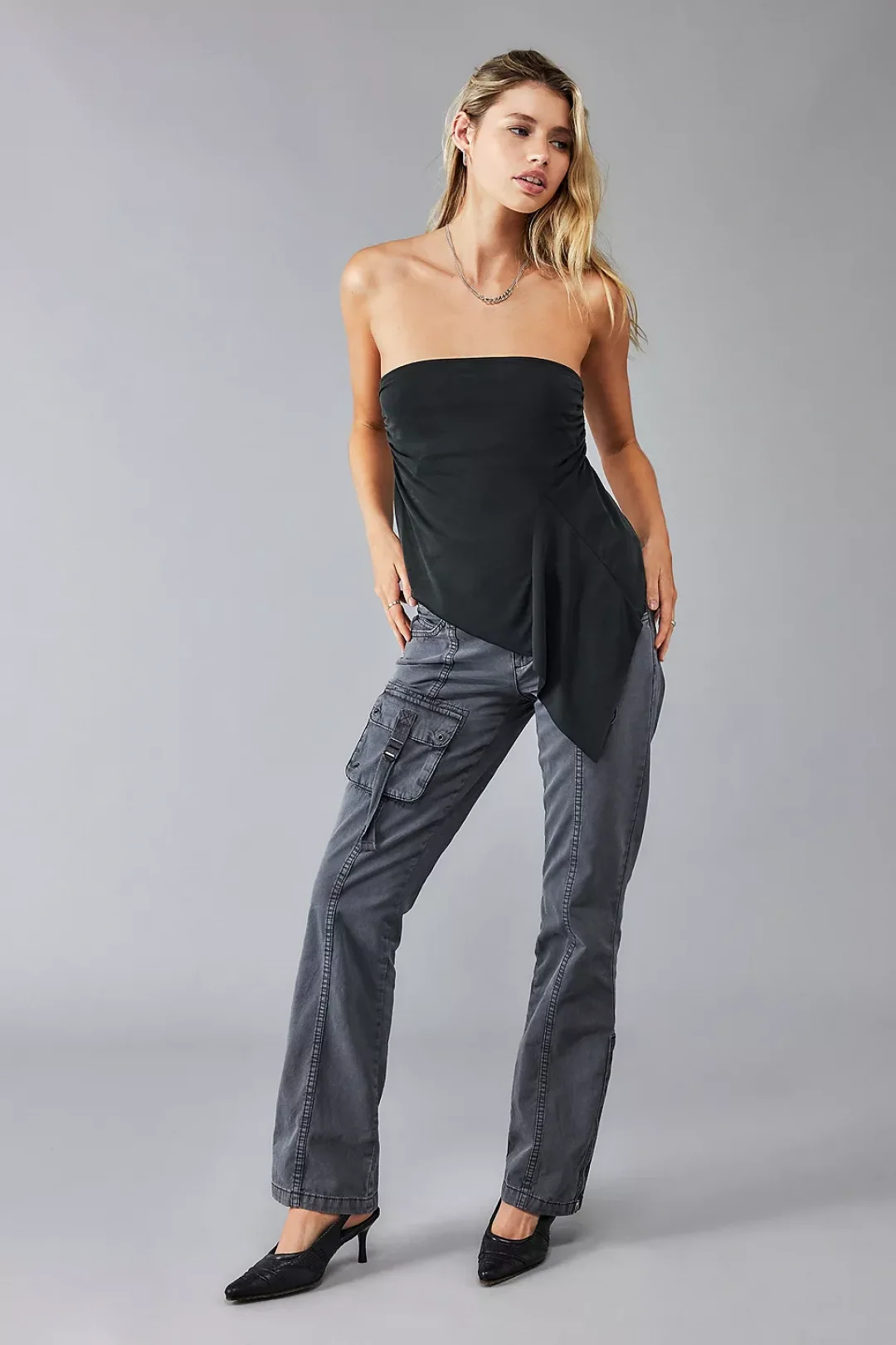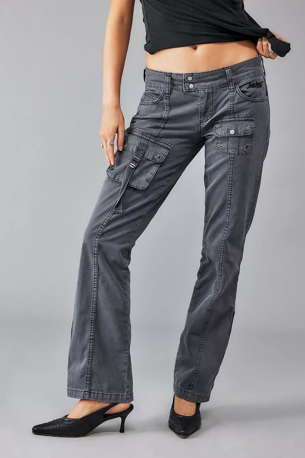 Günlük stilinize hem rahat hem de modern bir dokunuş katacak bu gri kargo pantolon, geniş cepleri ve fonksiyonel detaylarıyla öne çıkıyor. Yan kısımdaki kapaklı cepler, metal halka detayı ve düşük bel kesimi sayesinde Y2K trendine uyumlu cesur bir görünüm sunar.