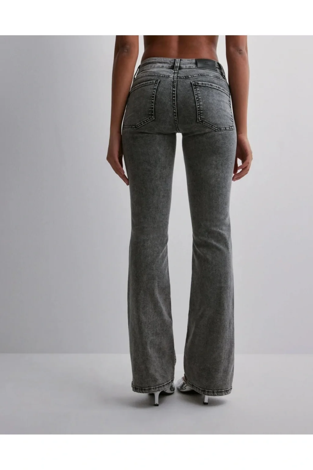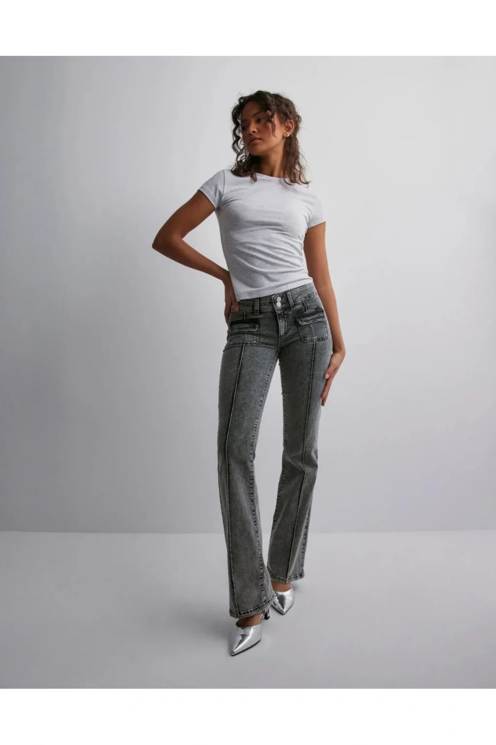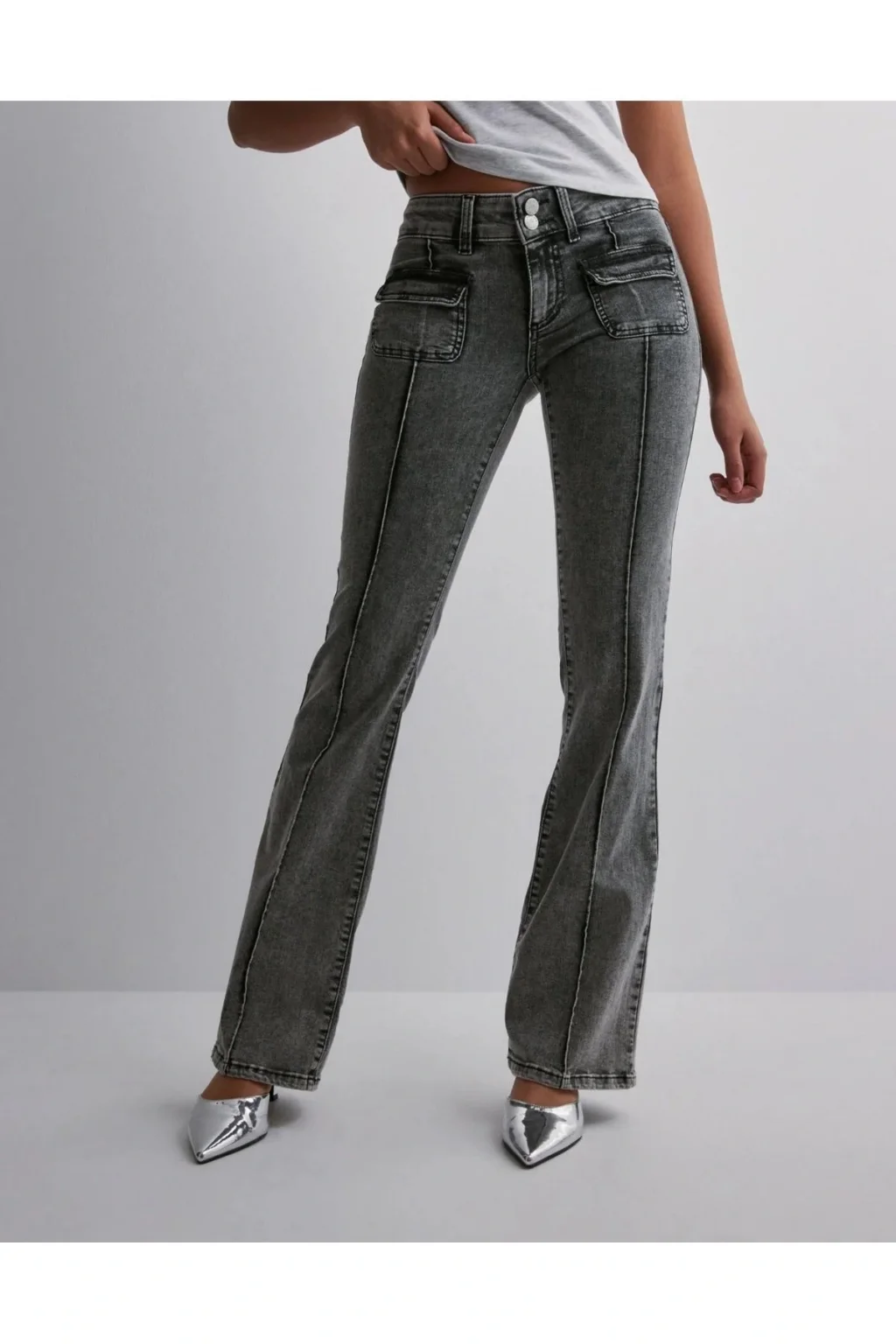 gri düşük bel bootcut jean, 2000’ler Y2K ruhunu modern hatlarla birleştiriyor.