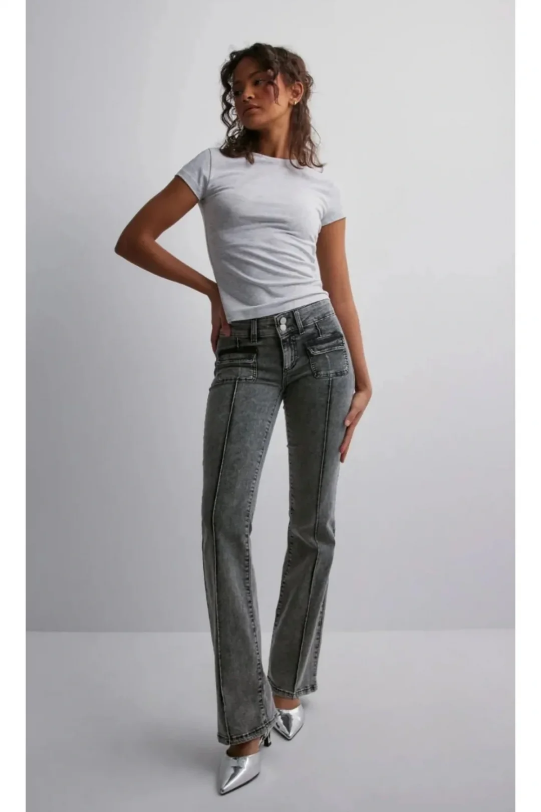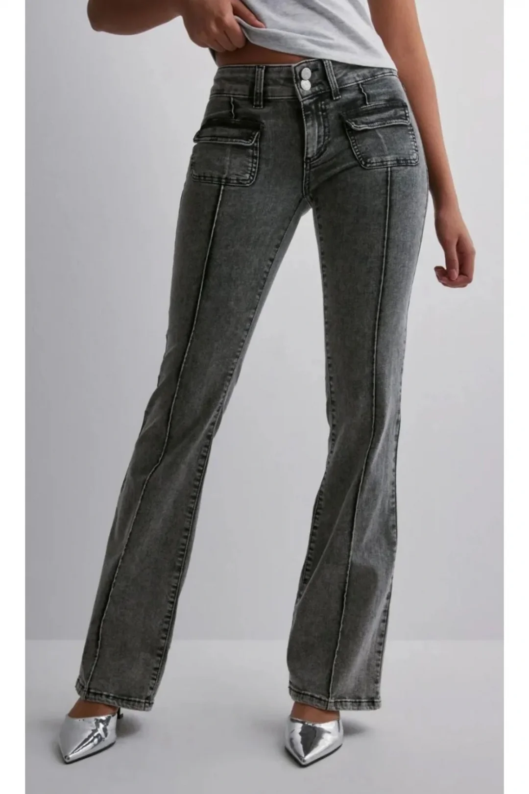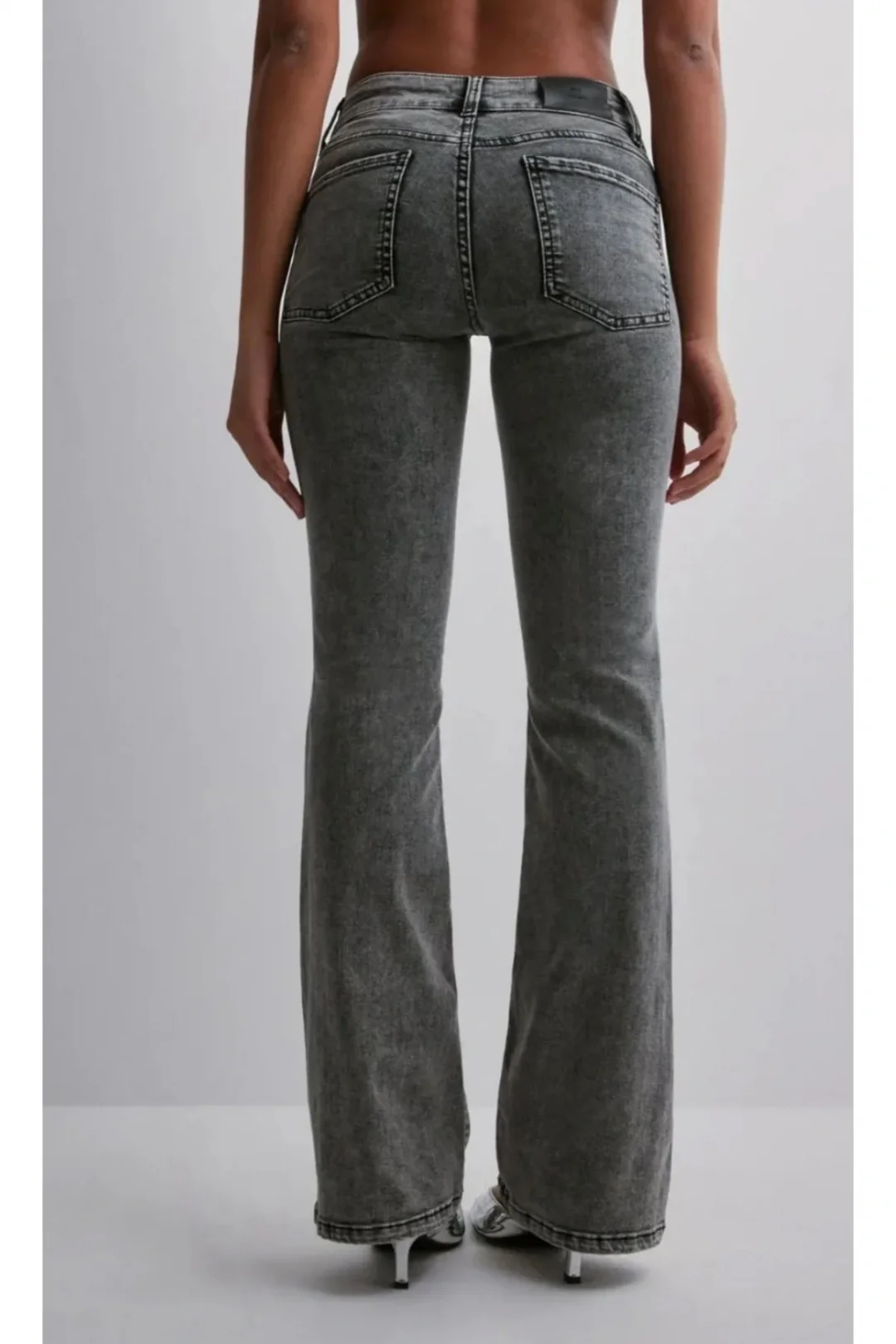 Mokşa’nın güçlü ve feminen siluetini yansıtan gri düşük bel bootcut jean, 2000’ler Y2K ruhunu modern hatlarla birleştiriyor.