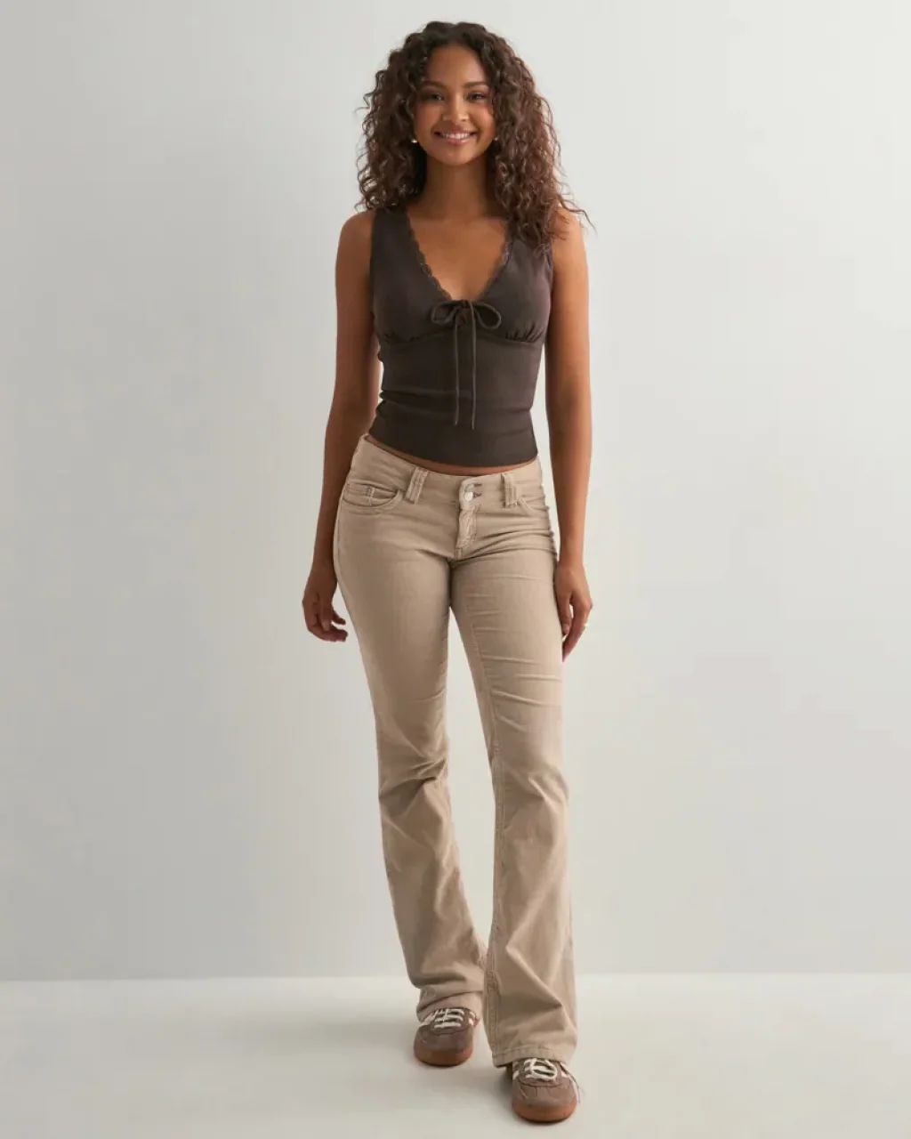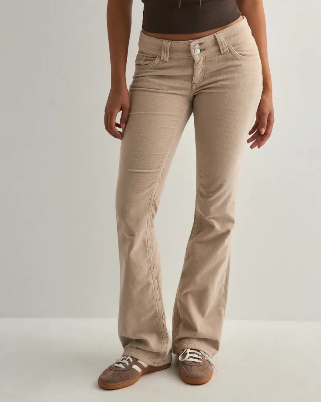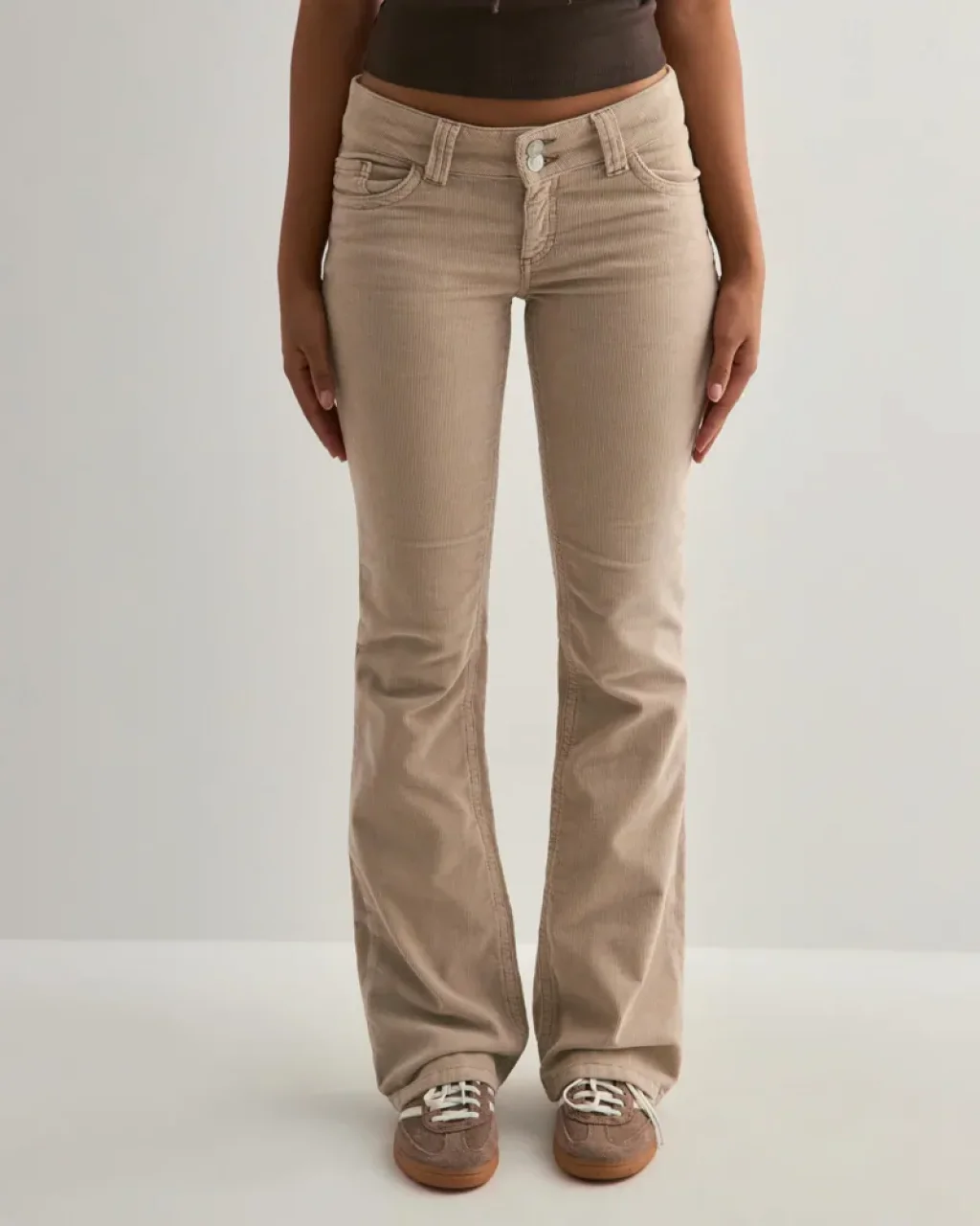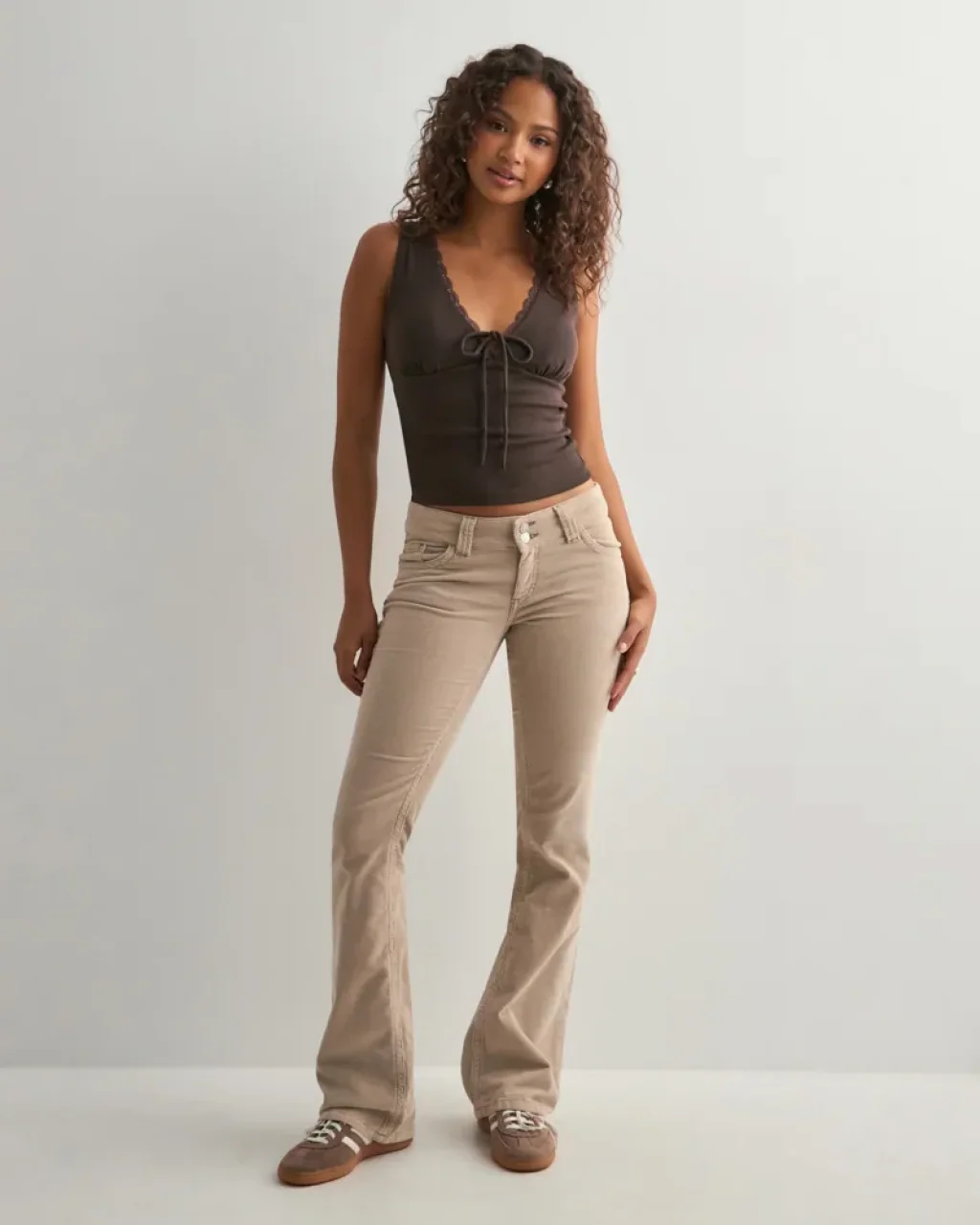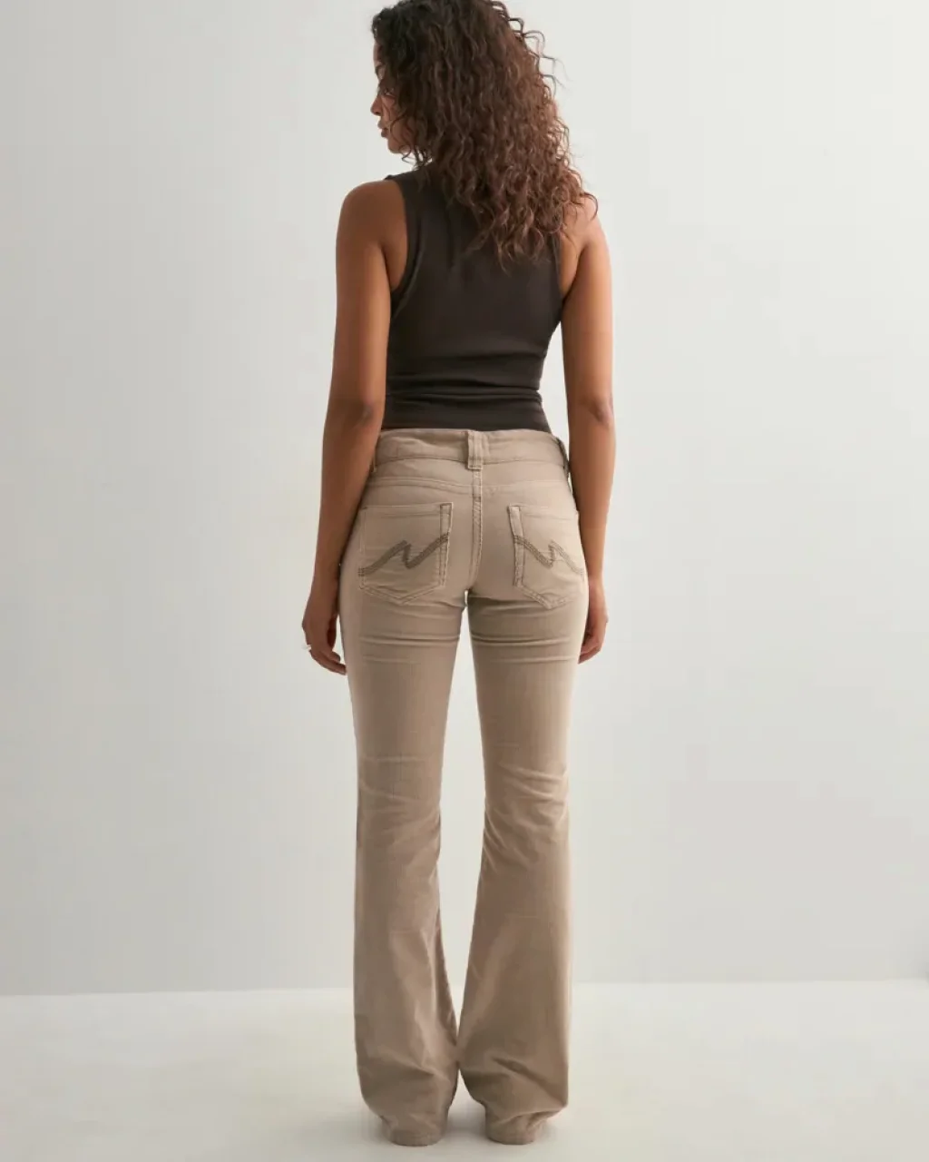 Bej kadife düşük bel bootcut pantolon, 2000’ler estetiğini modern bir yorumla sunan Mokşa’nın yeni sezon favorilerindendir. Kadife kumaşın tok ve pürüzsüz dokusu, bacak hattını vurgularken aynı zamanda zarif bir parlaklık kazandırır.