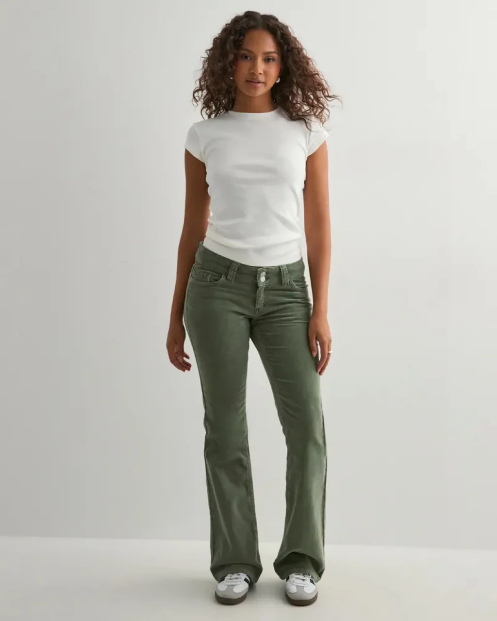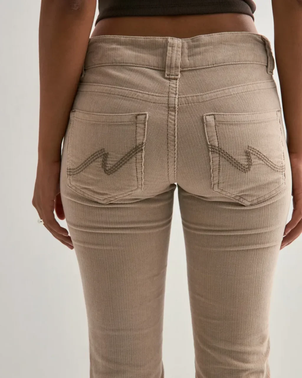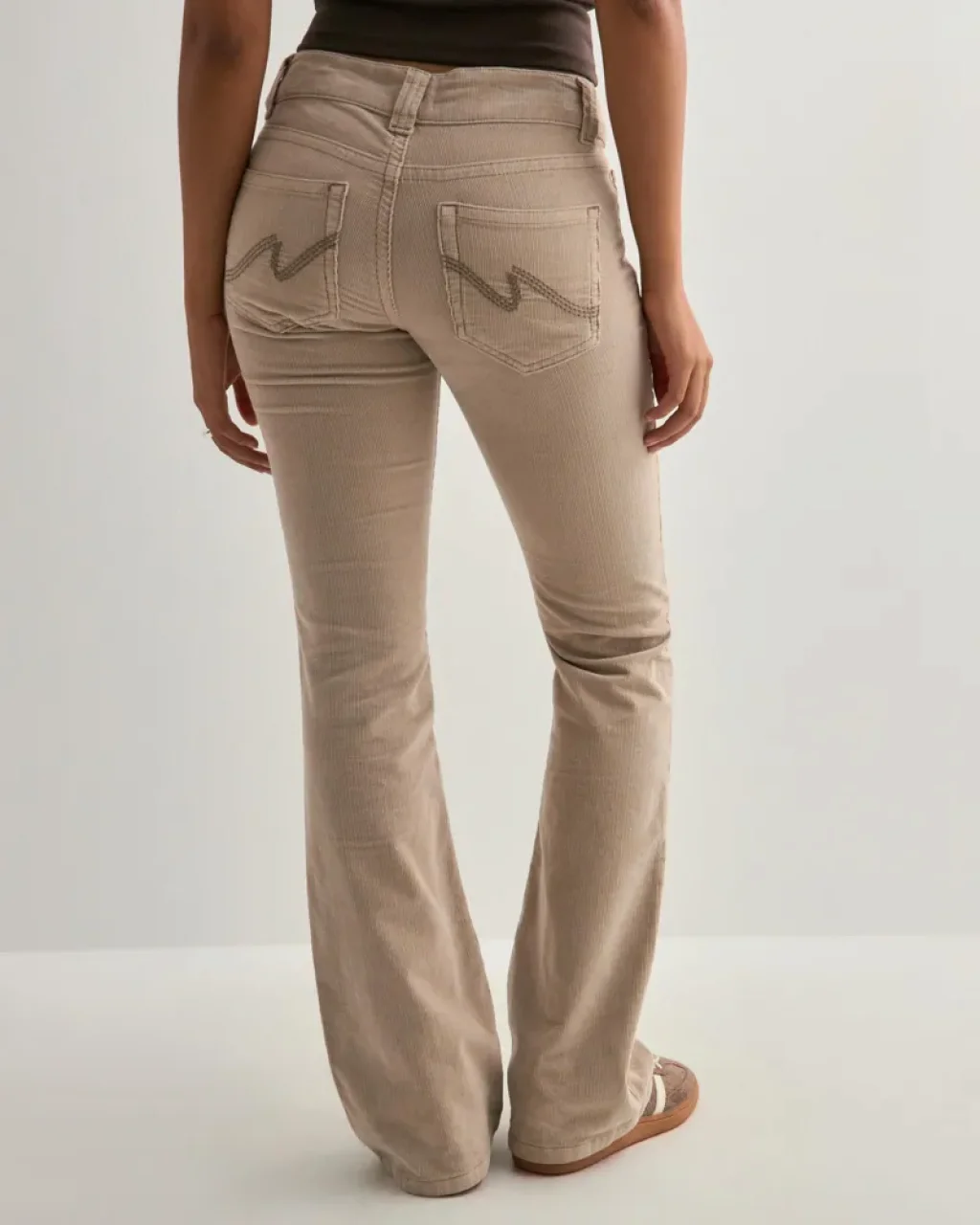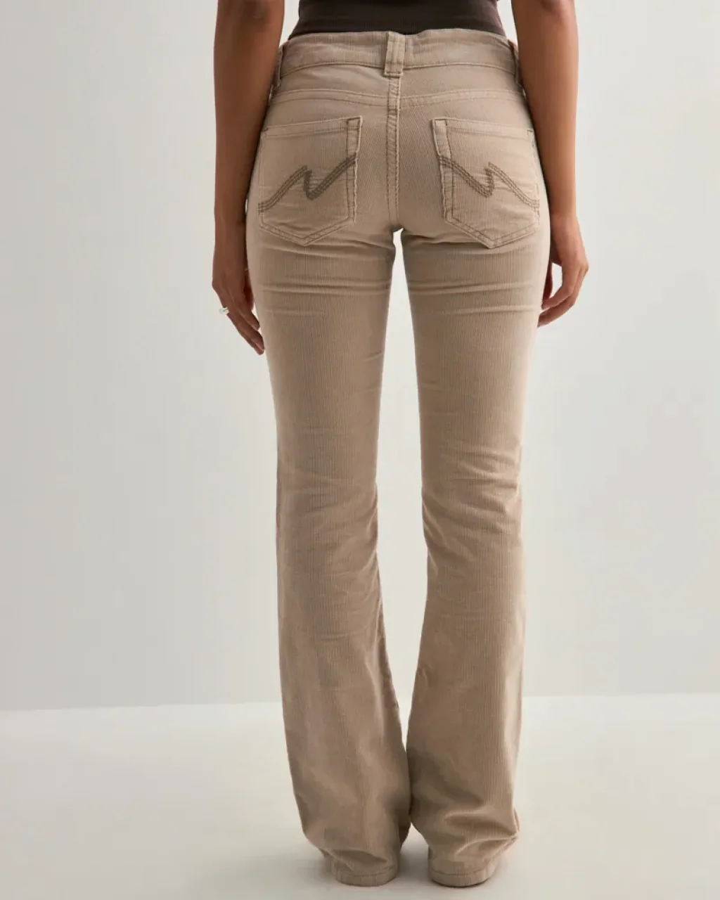 Bej kadife düşük bel bootcut pantolon, 2000’ler estetiğini modern bir yorumla sunan Mokşa’nın yeni sezon favorilerindendir. Kadife kumaşın tok ve pürüzsüz dokusu, bacak hattını vurgularken aynı zamanda zarif bir parlaklık kazandırır.
