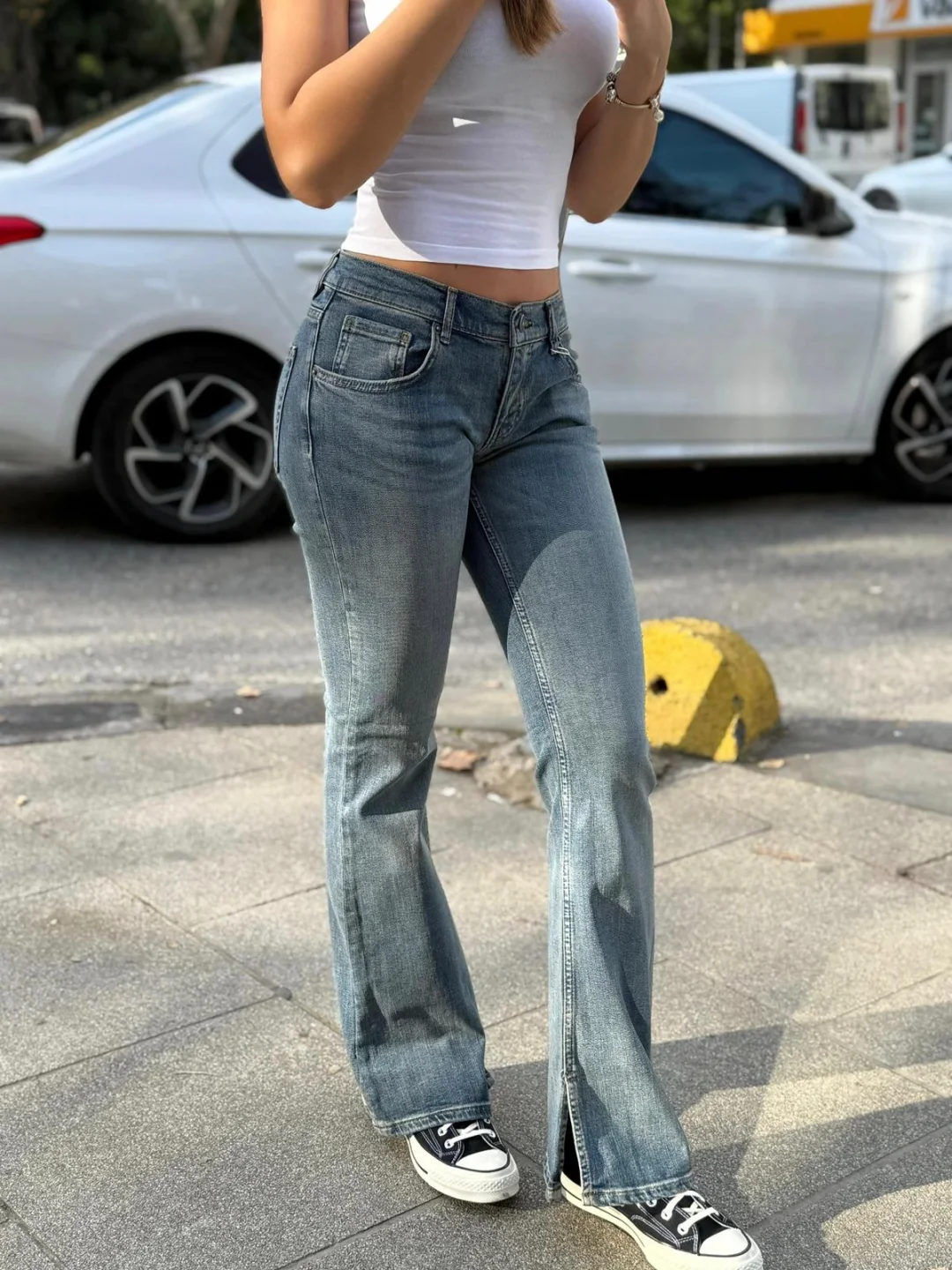 Y2K modasının en sevilen kesimlerinden ilham alan bu düşük bel bootcut jean, paça yırtmaç detayıyla modern bir dokunuş kazanıyor. Hafif soluk mavi tonu ve vücudu saran kalıbıyla bacak boyunu optik olarak uzatır, paçadaki yırtmaç detayı ise sneaker veya topuklularla stile dinamizm katar. Yumuşak ve esnek dokusu sayesinde konforlu bir kullanım sunarken, vücudu şekillendiren toparlayıcı etkisiyle göz alıcı bir siluet oluşturur.Paça yırtmacı sayesinde topuklu ayakkabılarla şık, sneaker’larla sportif bir görünüm elde edebilirsin. Basic crop tişörtlerle gündüz rahatlığını yakalayabilir, blazer veya deri ceketlerle akşam stiline dönüştürebilirsin.