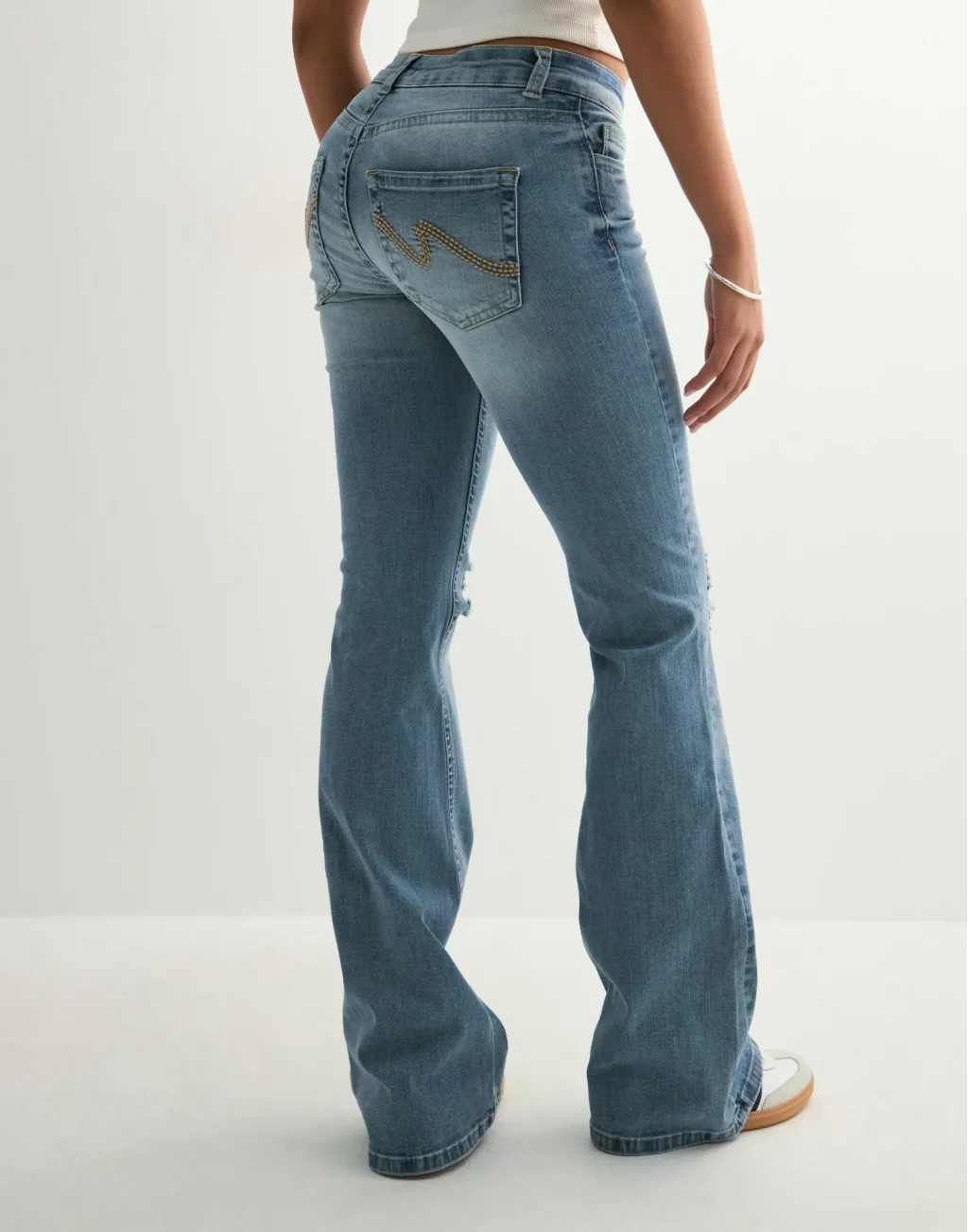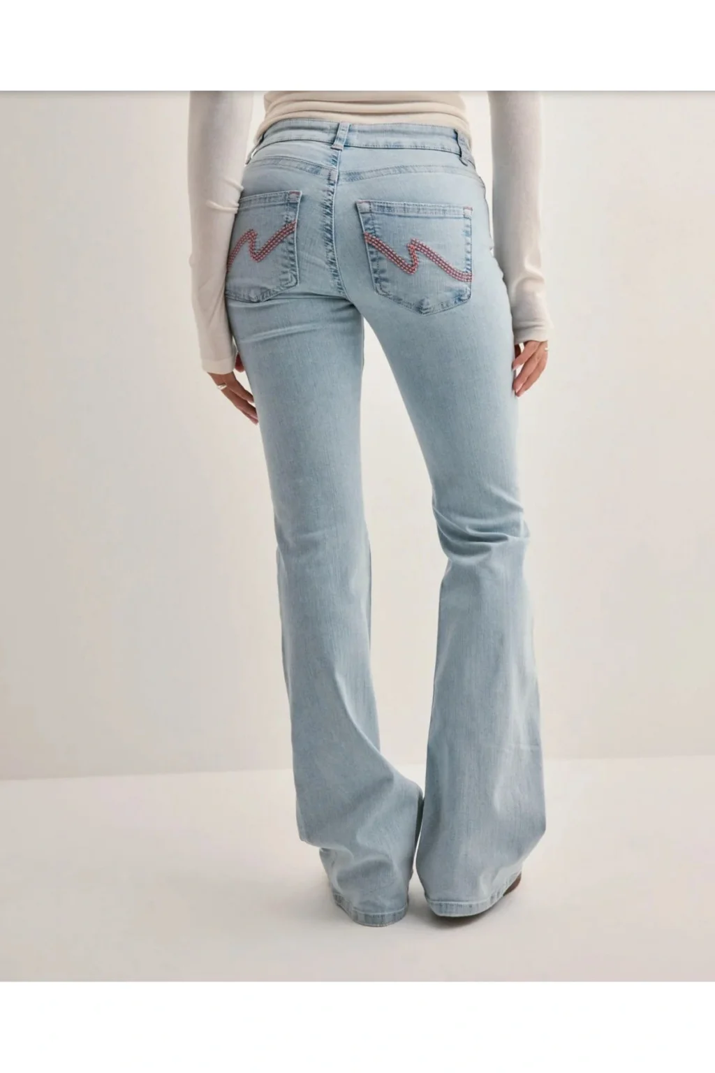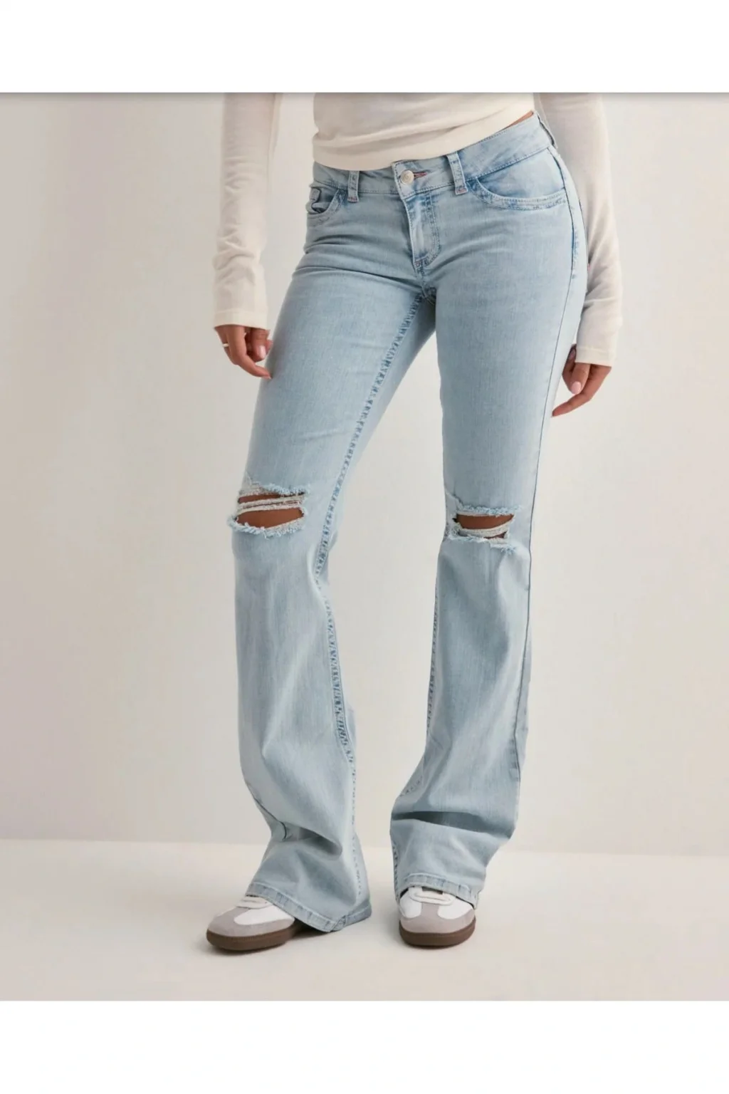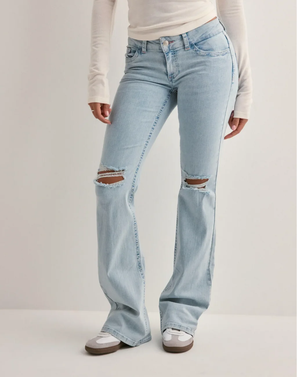 Açık mavi düşük bel yırtık detaylı bootcut jean, retro stilin enerjisini günümüz trendleriyle harmanlıyor.