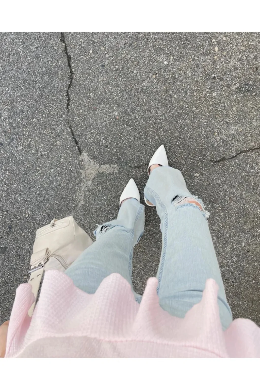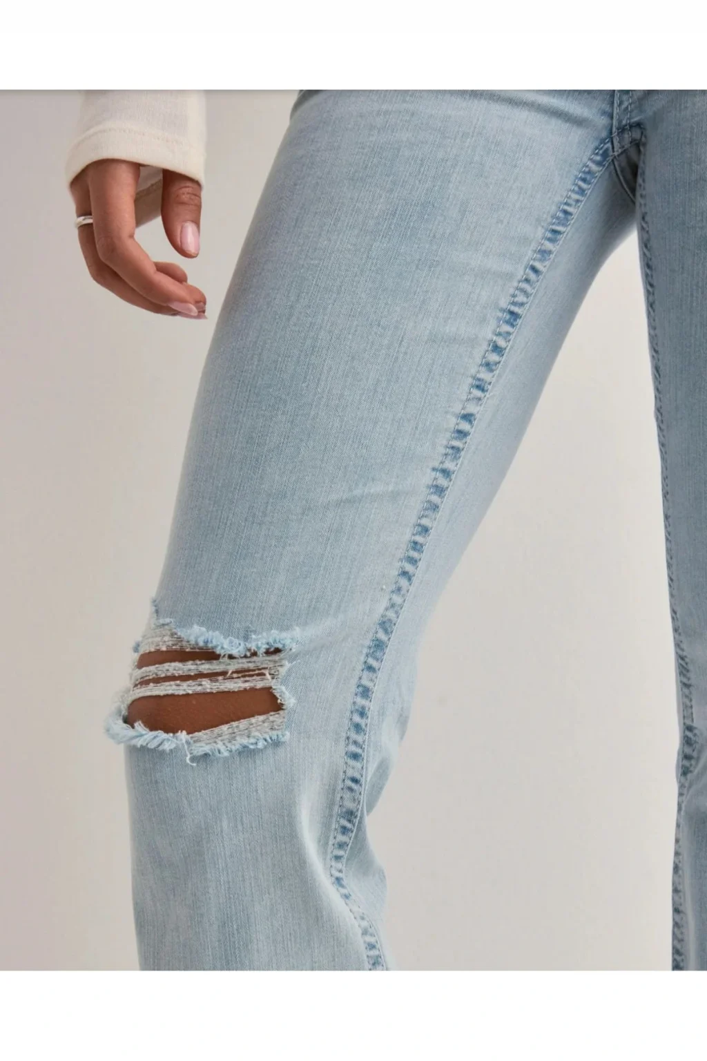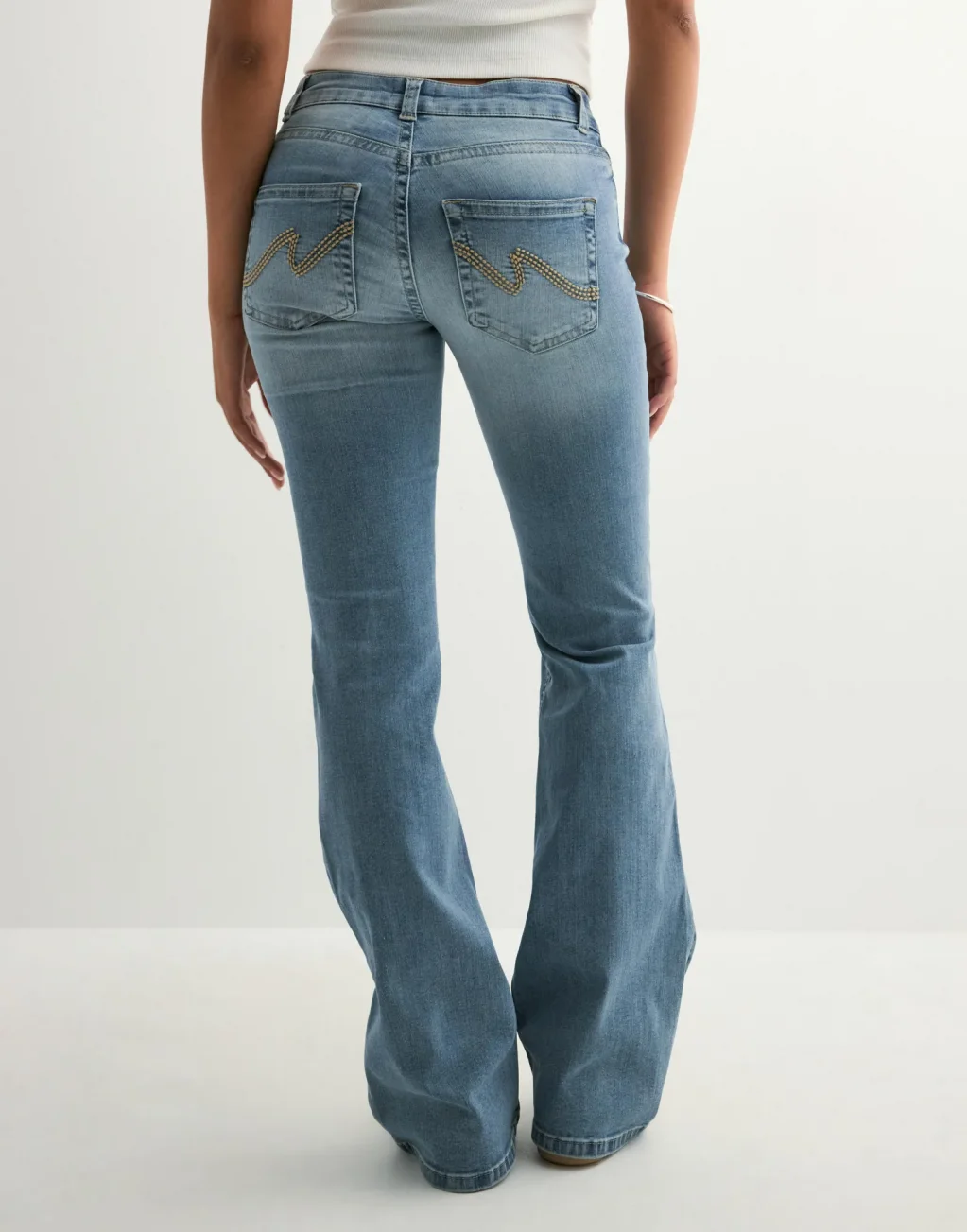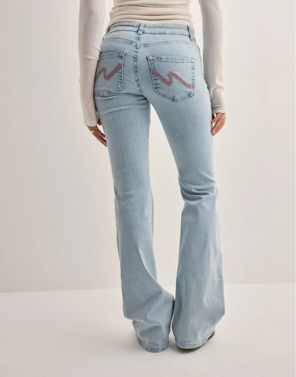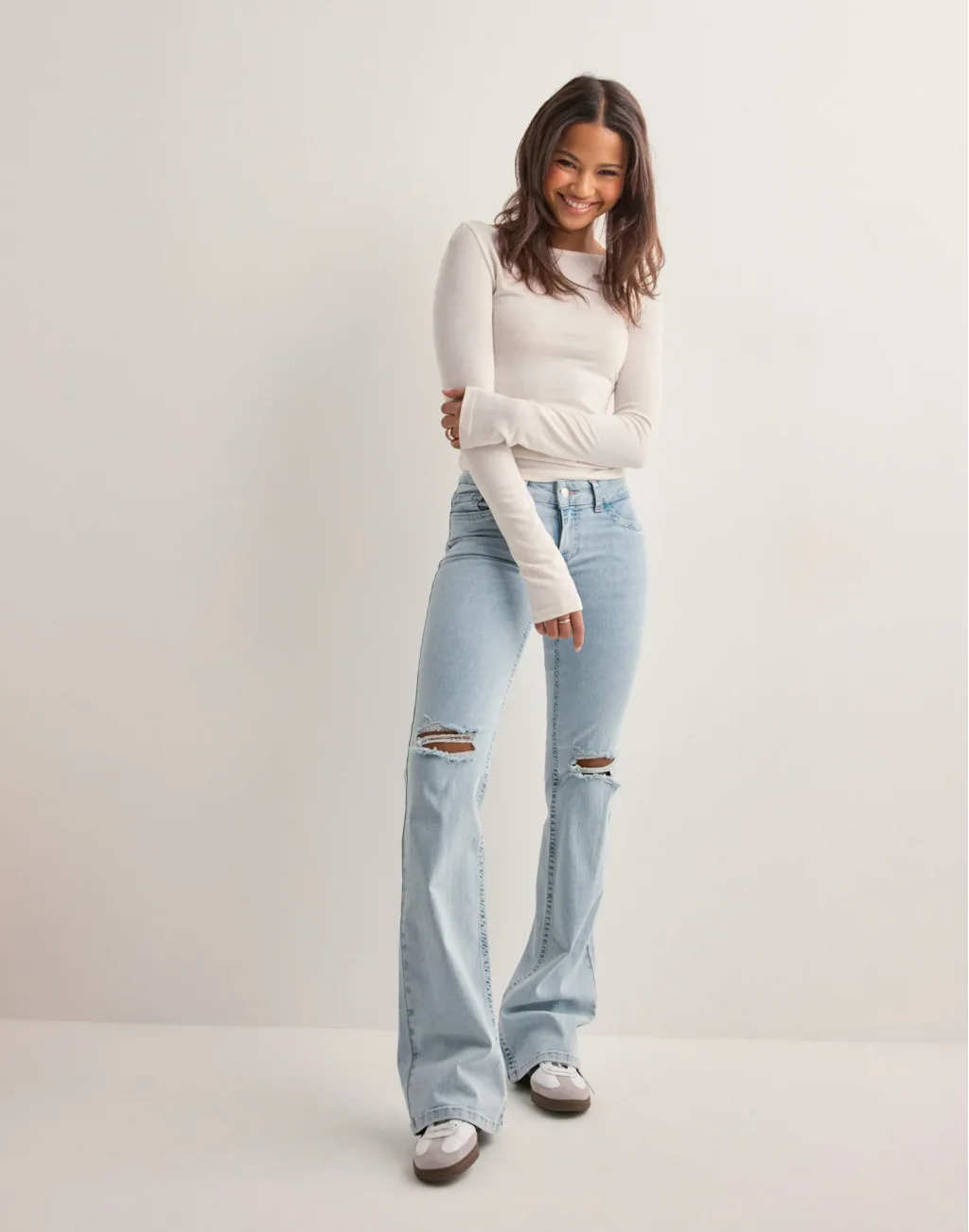 Açık mavi düşük bel yırtık detaylı bootcut jean, retro stilin enerjisini günümüz trendleriyle harmanlıyor.