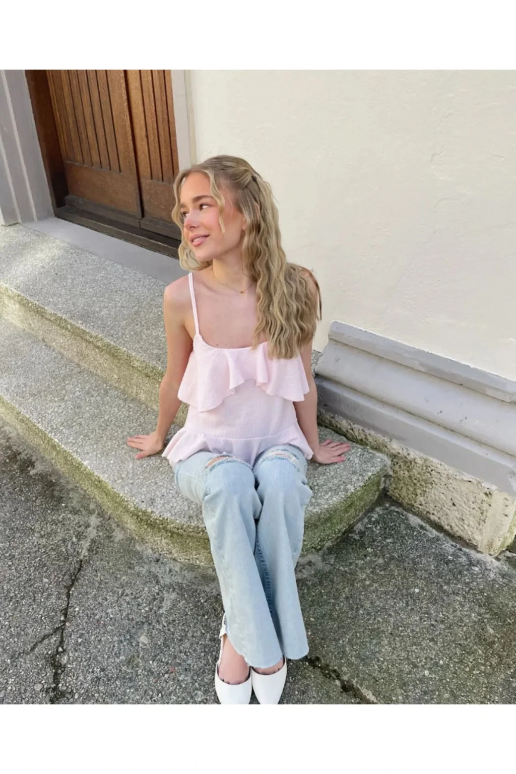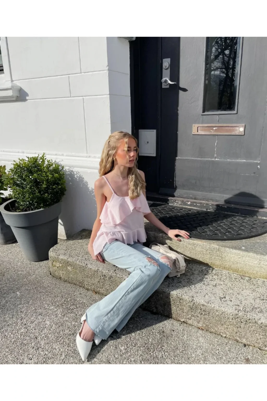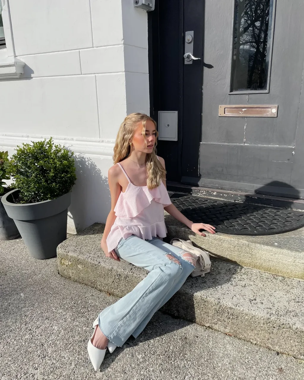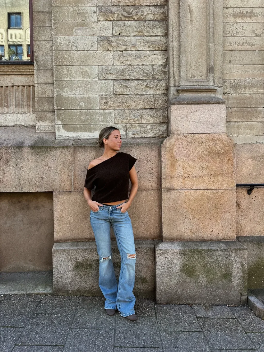 Açık mavi düşük bel yırtık detaylı bootcut jean, retro stilin enerjisini günümüz trendleriyle harmanlıyor.