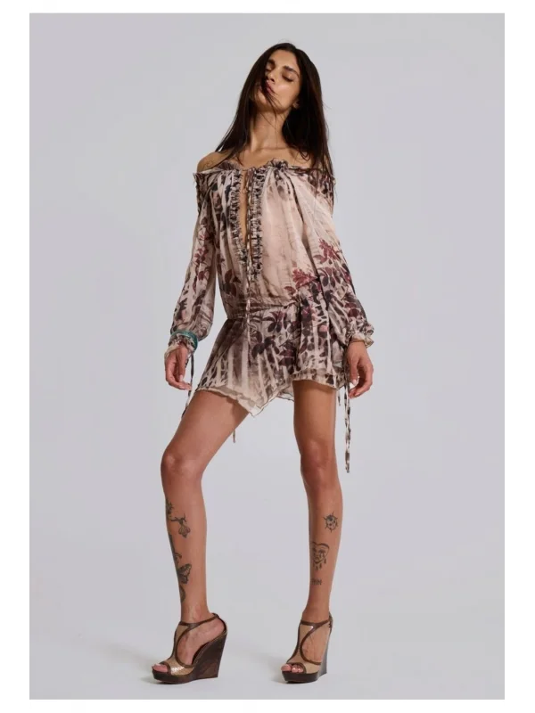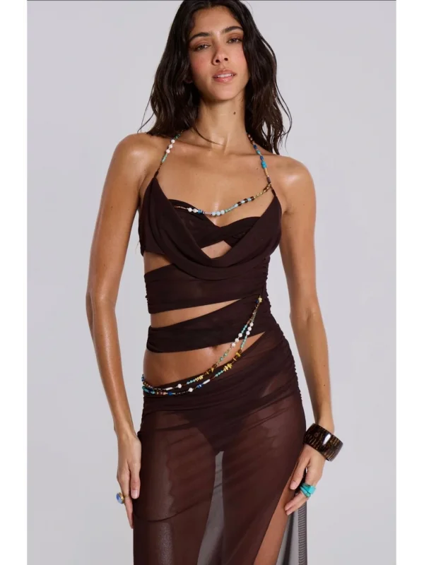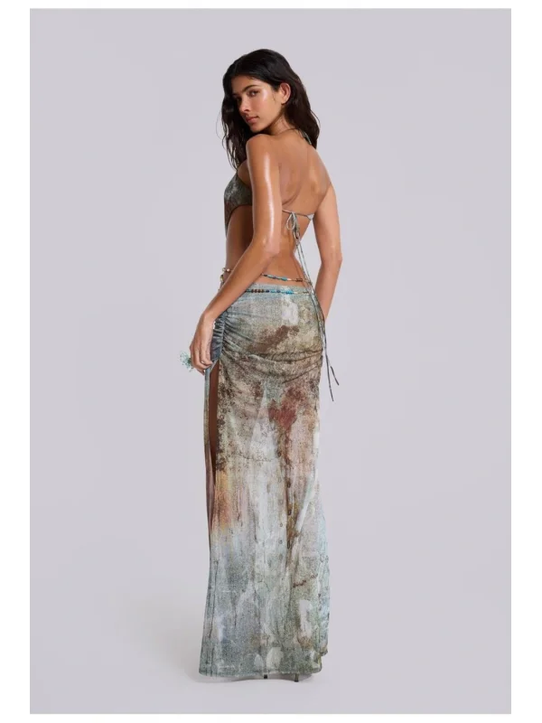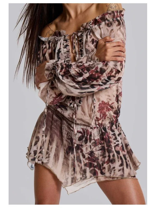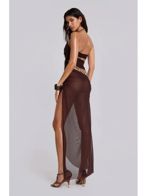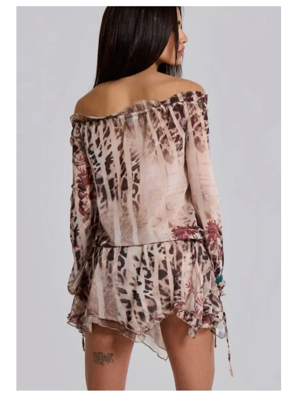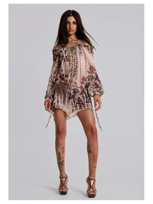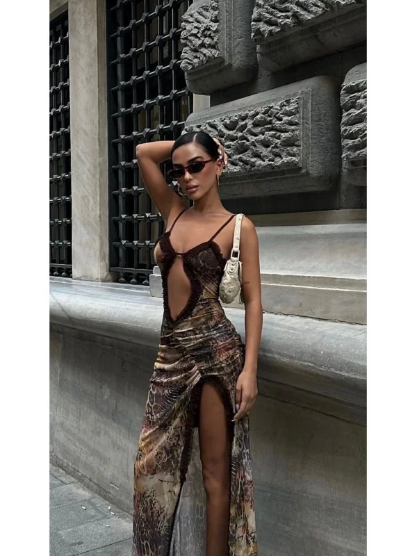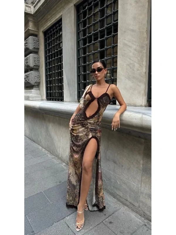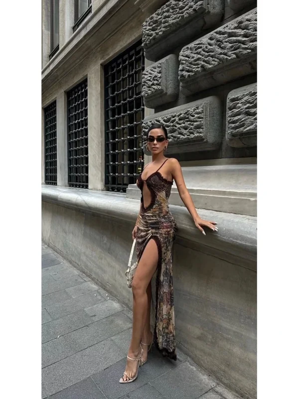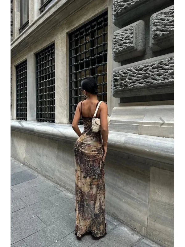 Y2k Desenli Kahve Tül Elbise