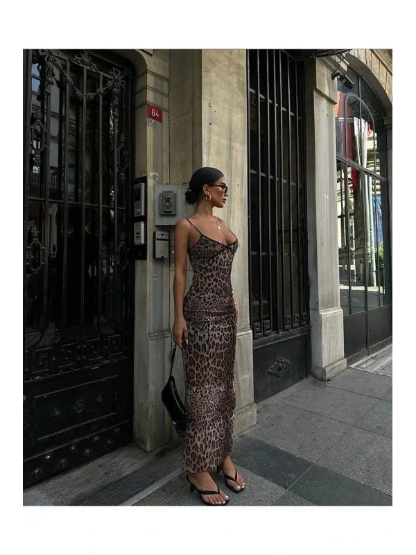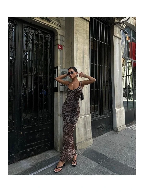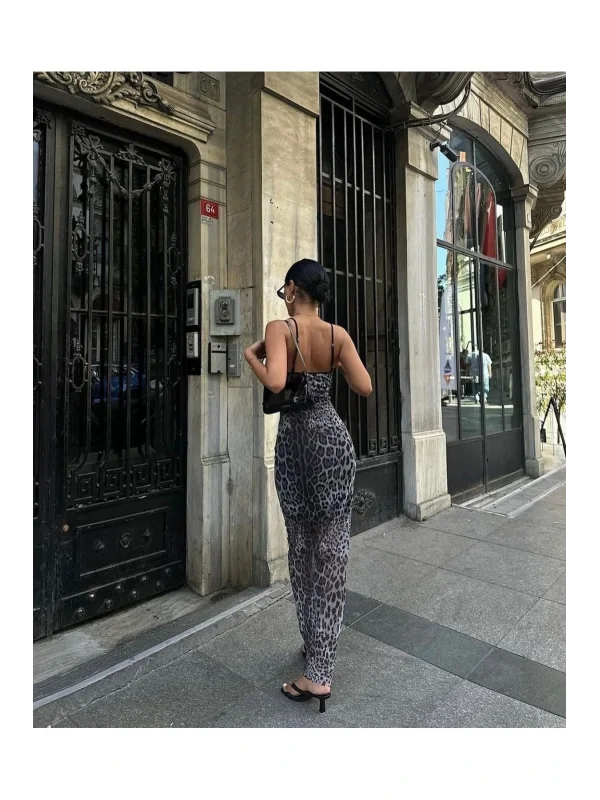 y2k Gri Leopar Desenli Elbise
