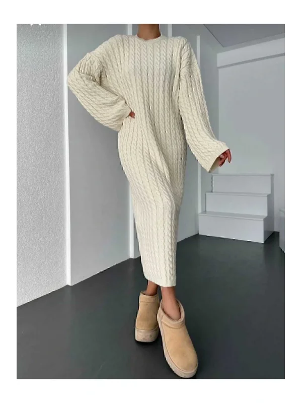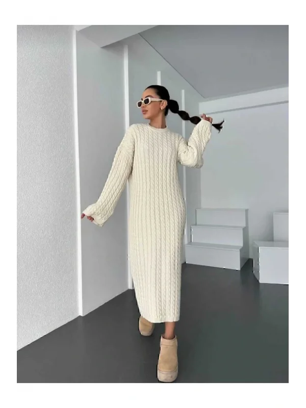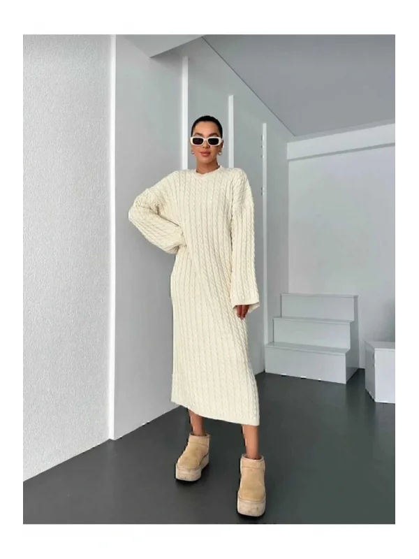Krem Renk Oversize Model Triko Elbise