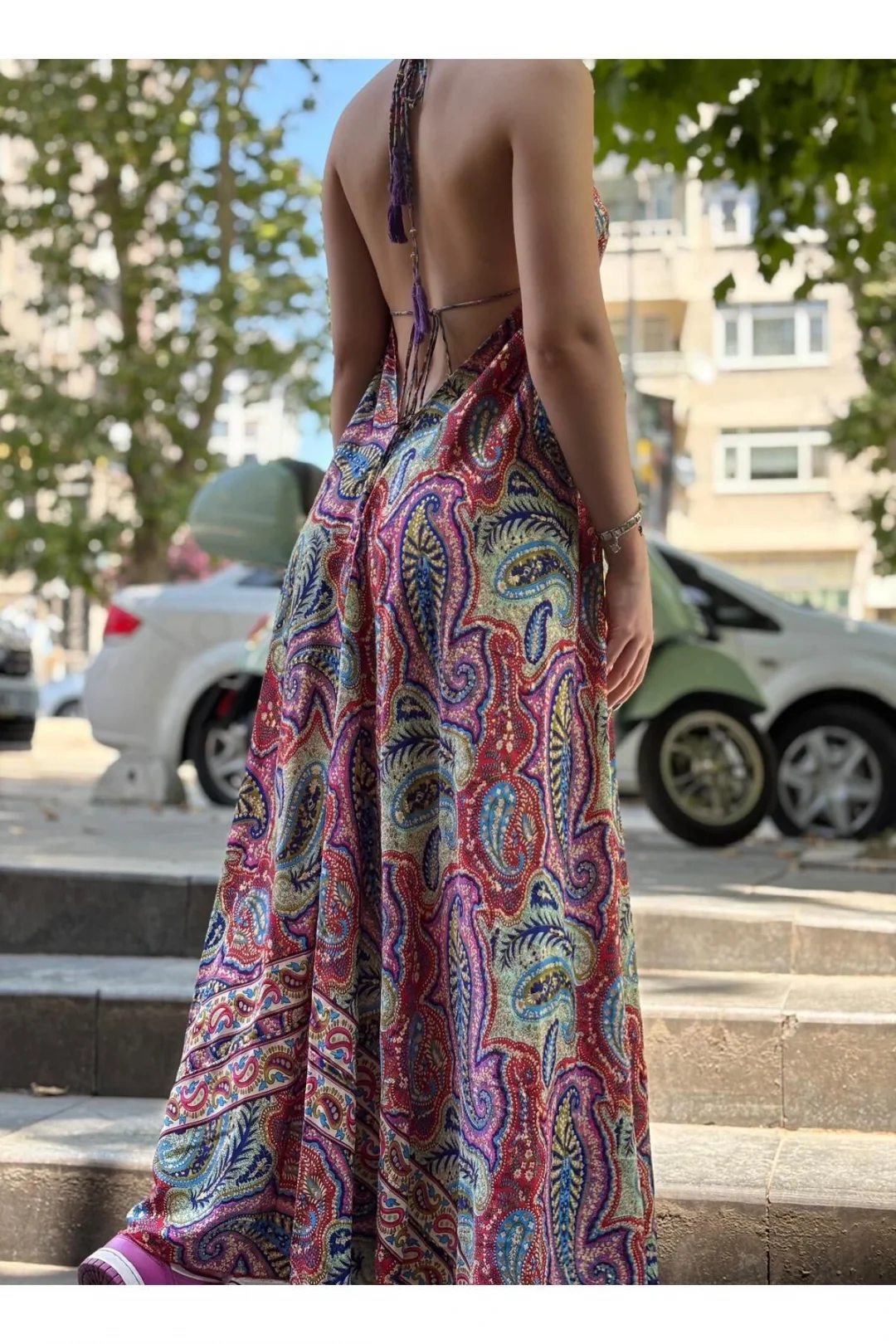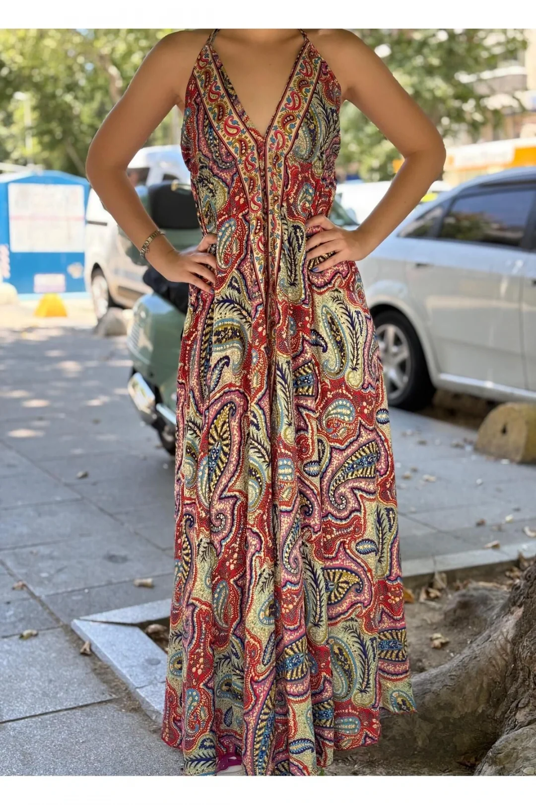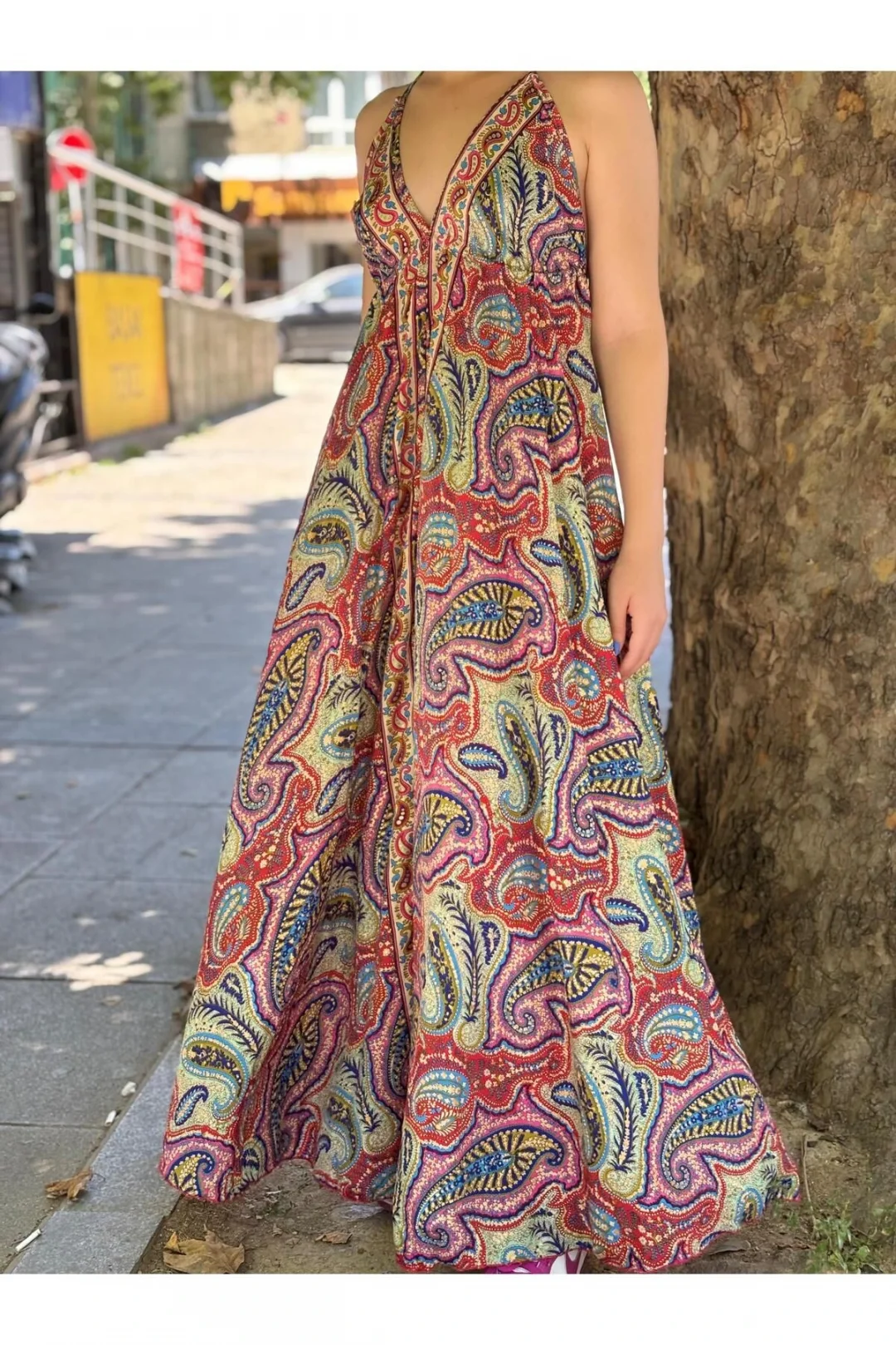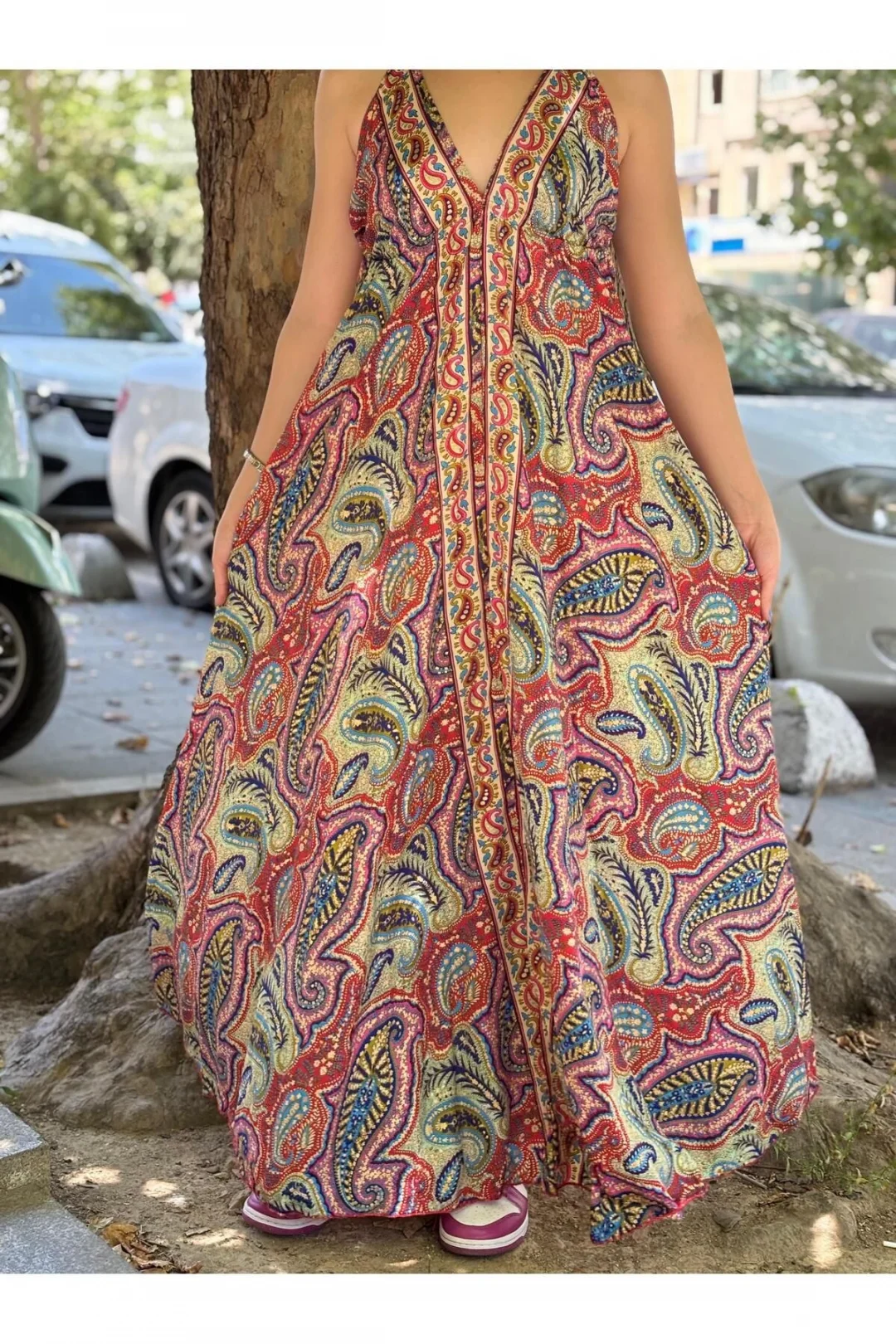 Yazın enerjisini ve bohem ruhunu yansıtan bu etnik desenli uzun elbiseyle tarzınıza eşsiz bir dokunuş katın! Canlı renkleri ve göz alıcı paisley desenleriyle dikkat çeken bu elbise, hem plajda hem de günlük kombinlerinizde rahatlığı ve şıklığı bir araya getiriyor.