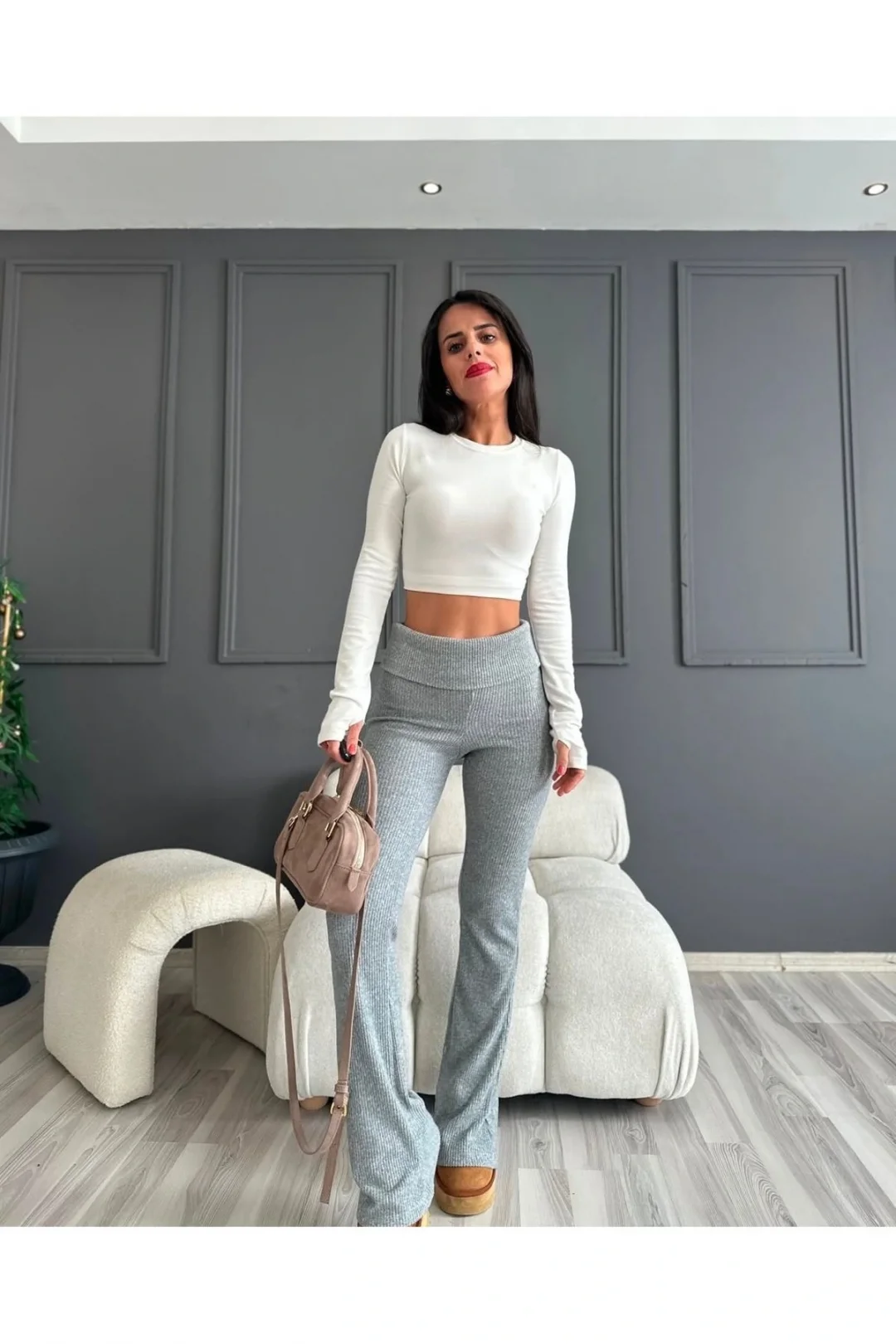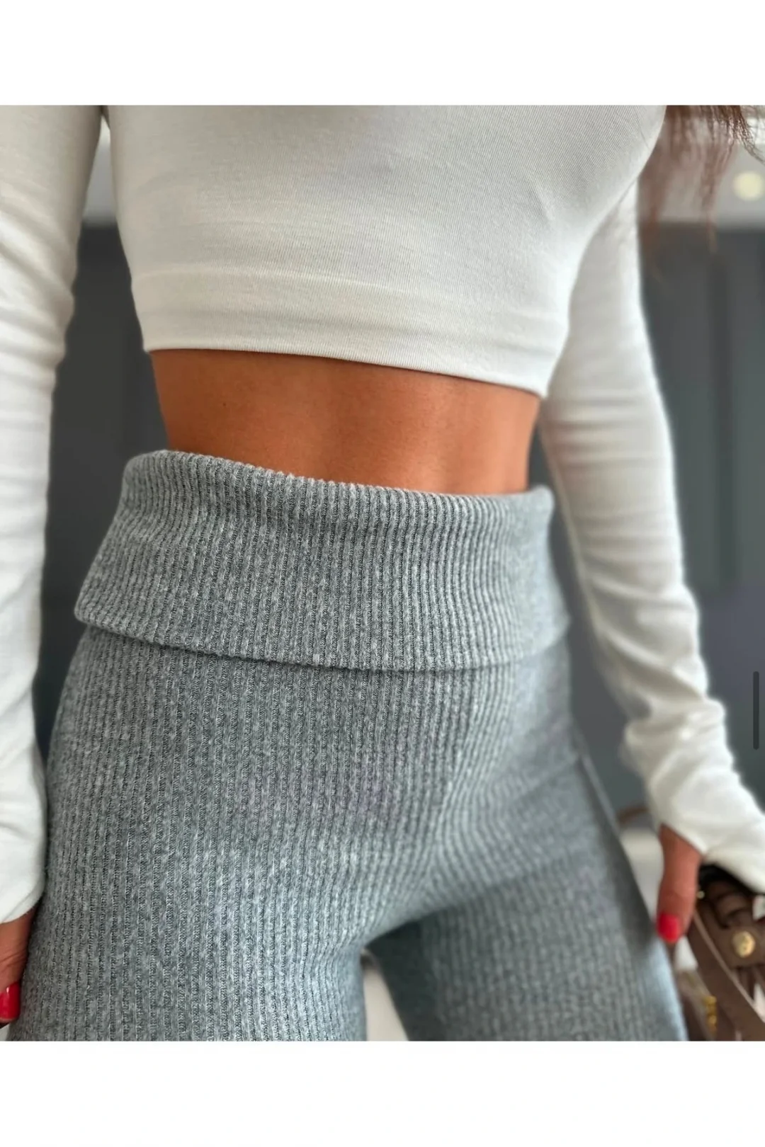 Gri Katlanmış Bel Bantlı Şeritli İspanyol Paça Pantolon