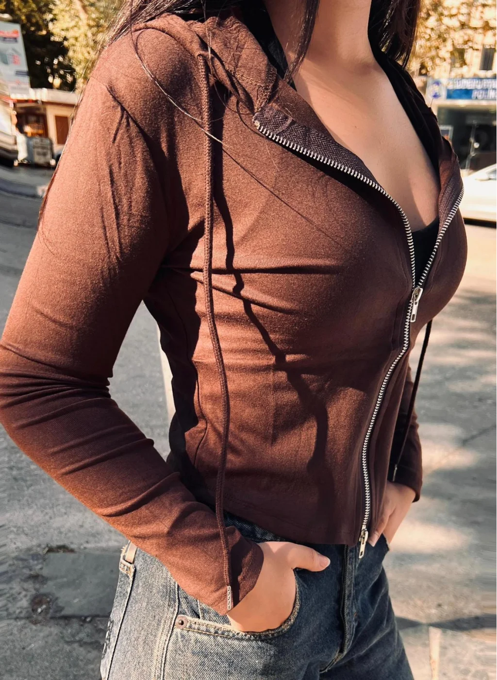 Tasarım: Fermuarlı, kapüşonlu, crop kesim