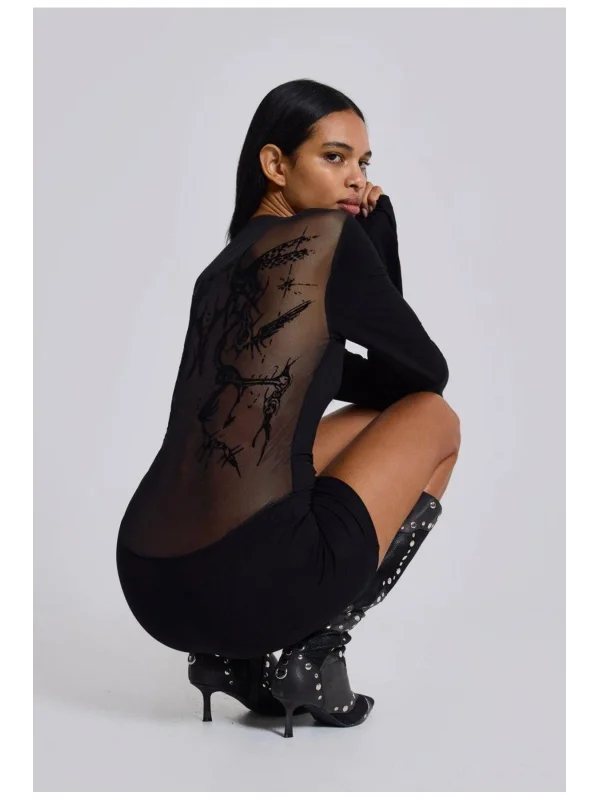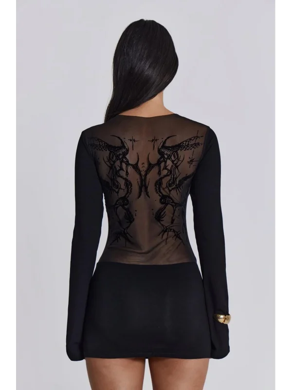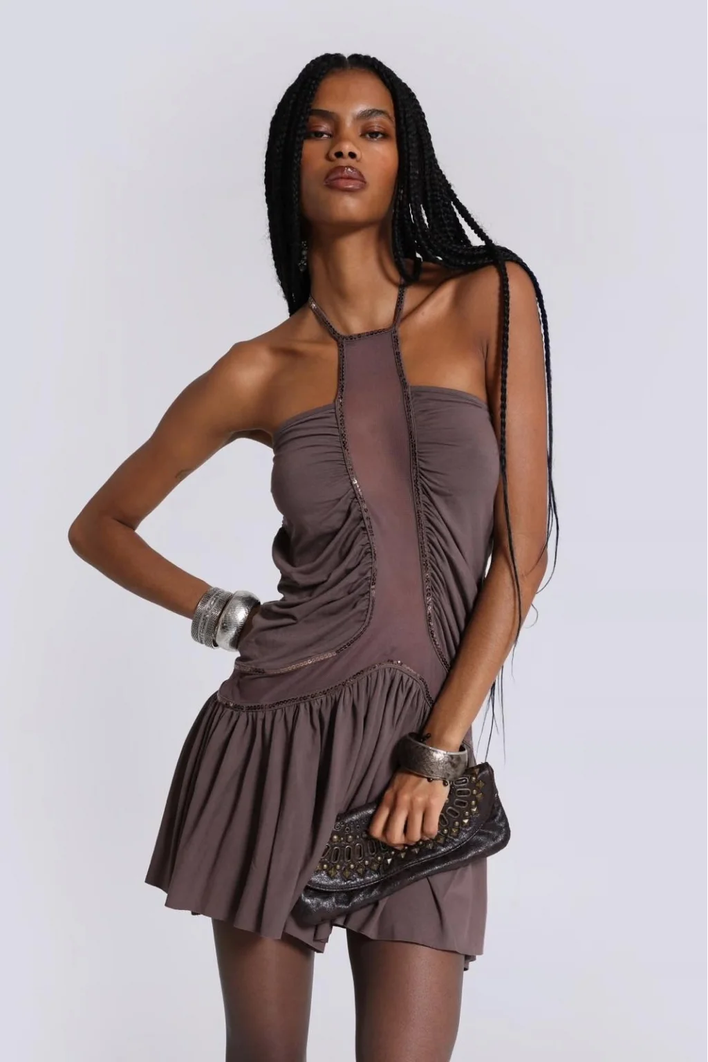 Şık ve dikkat çekici mini elbise, halter yaka tasarımı ile boyun hattını zarifçe vurgular. Ön ve kalça bölgesinde yer alan mesh (file) paneller ile modern bir dokunuş sunar; ışıltılı payet detaylar göz alıcı bir görünüm sağlar. Göğüs kısmı büzgülü dokusu ve açık sırt detayı ile feminen siluet etkisini güçlendirir. Etek kısmı hafifçe genişleyen (flare) kesimi sayesinde hem hareket özgürlüğü sağlar hem de dinamik bir duruş yaratır.