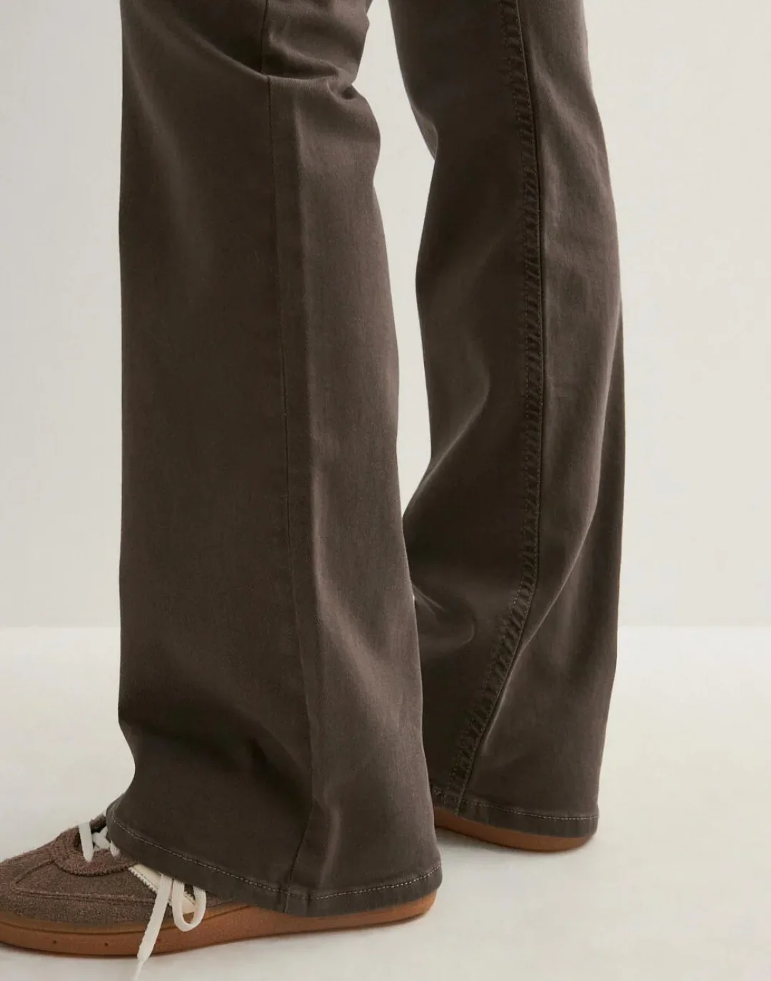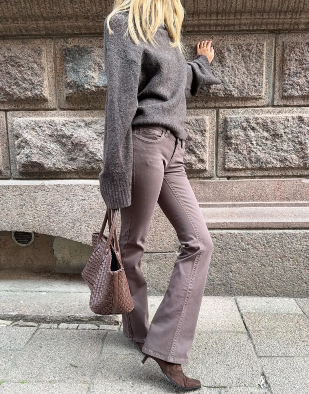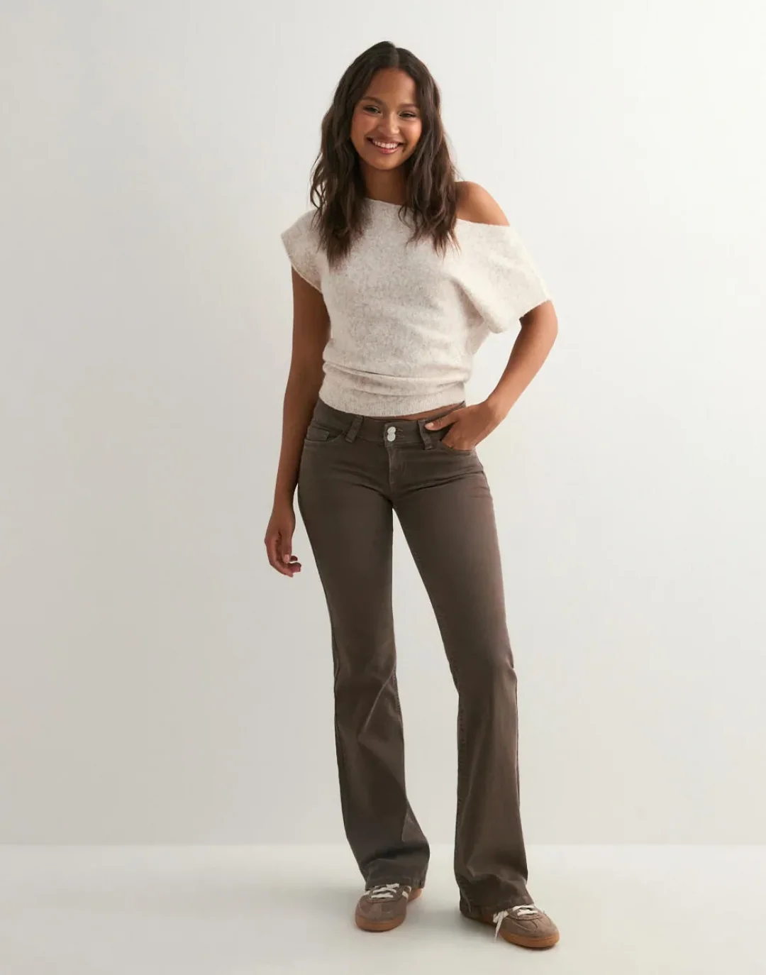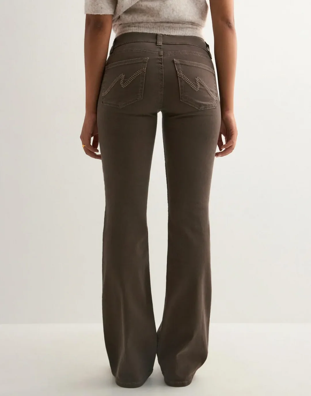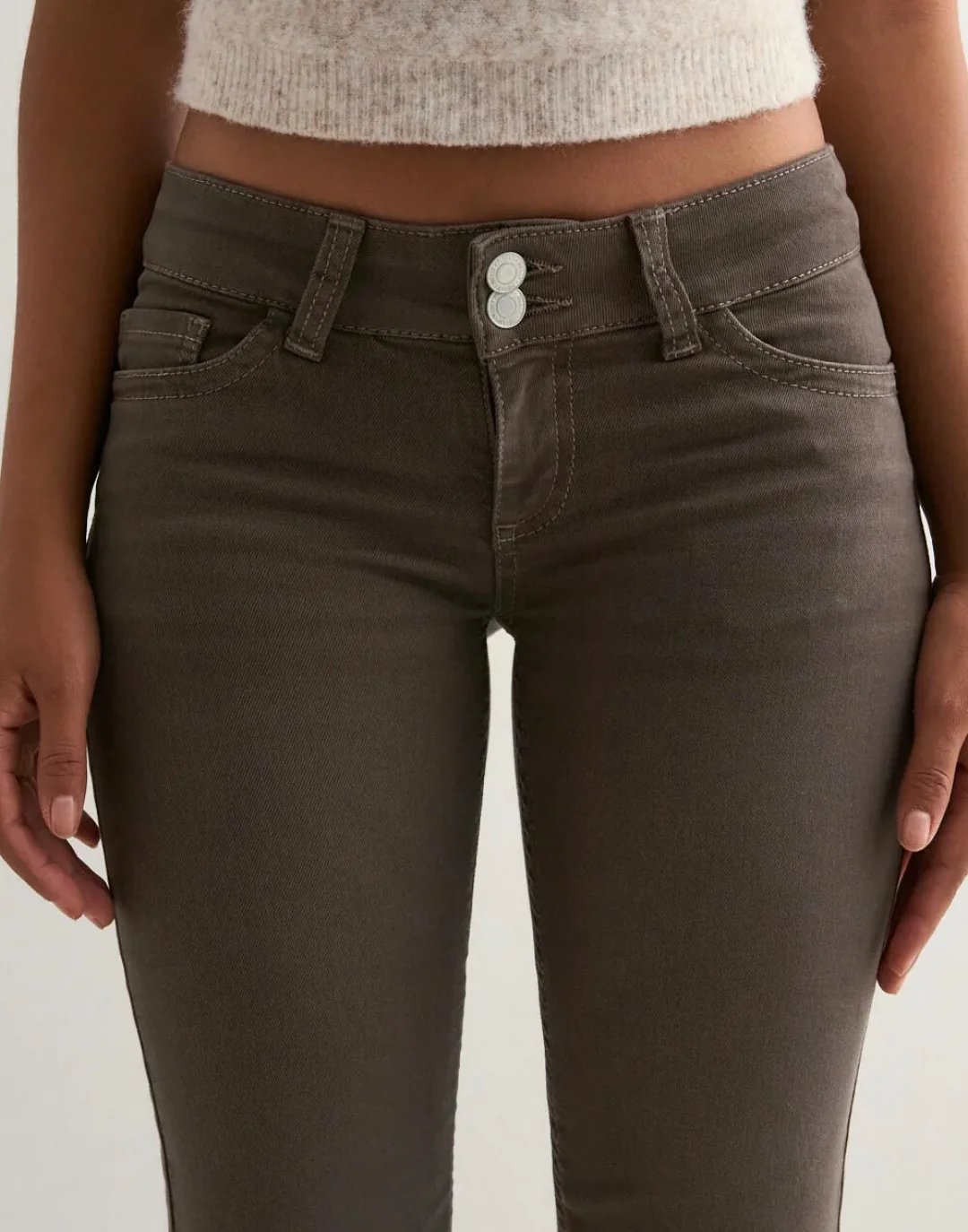 Düşük bel kesimiyle bel hattını vurgulayan bu model, diz hizasından itibaren hafif açılarak İspanyol paça (bootcut) formu oluşturur ve bacak boyunu optik olarak uzatır.