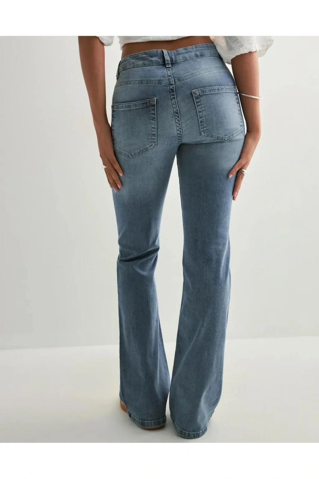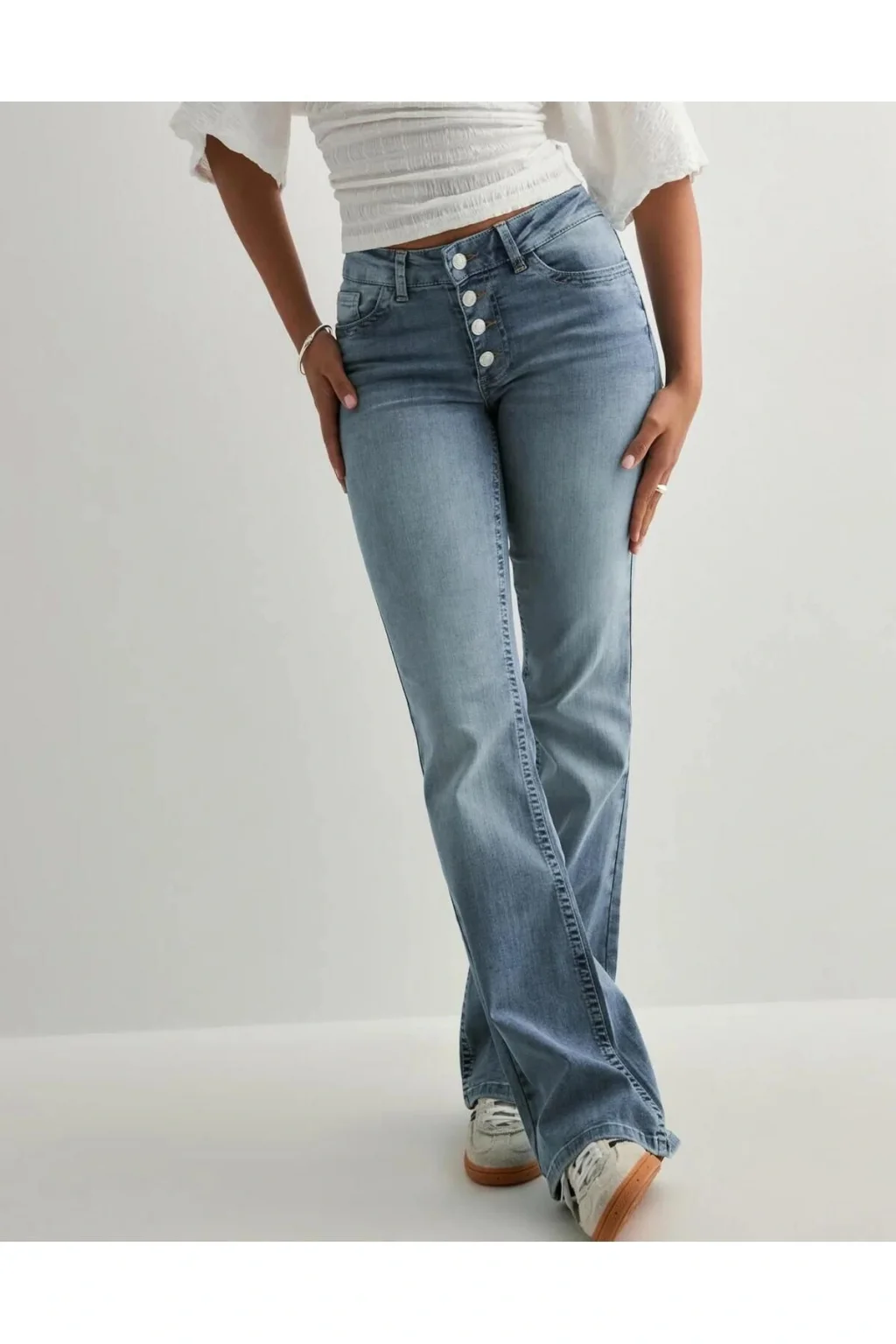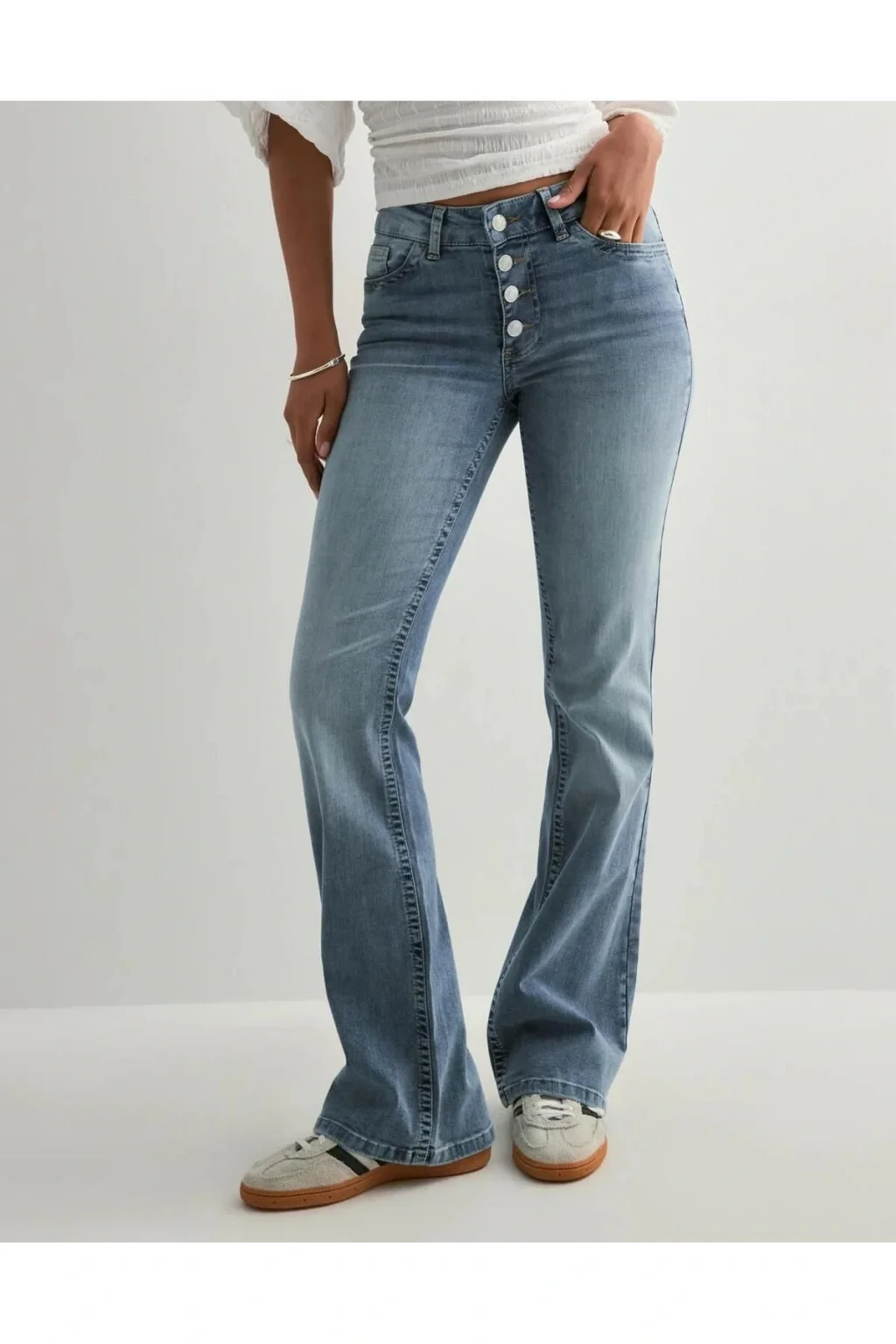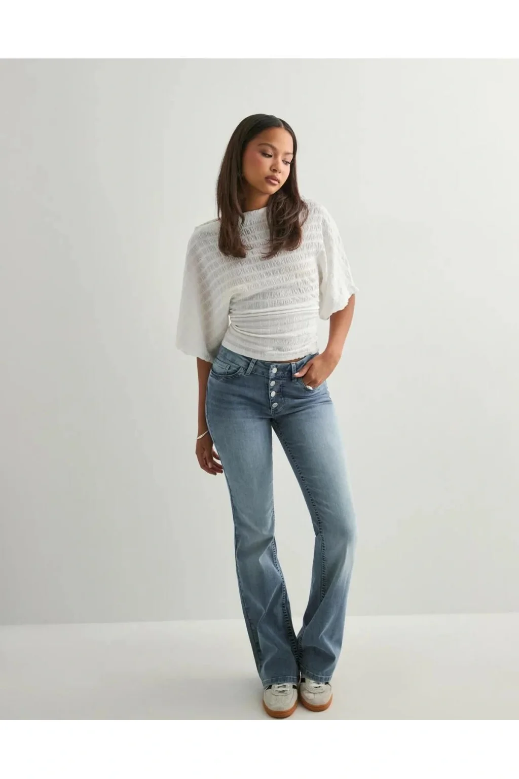 Mokşa’nın modern kesimiyle üretilen bu jean, orta bel formuyla bel hattını zarifçe kavrar; toparlayıcı etkisiyle bedeni dengeler.