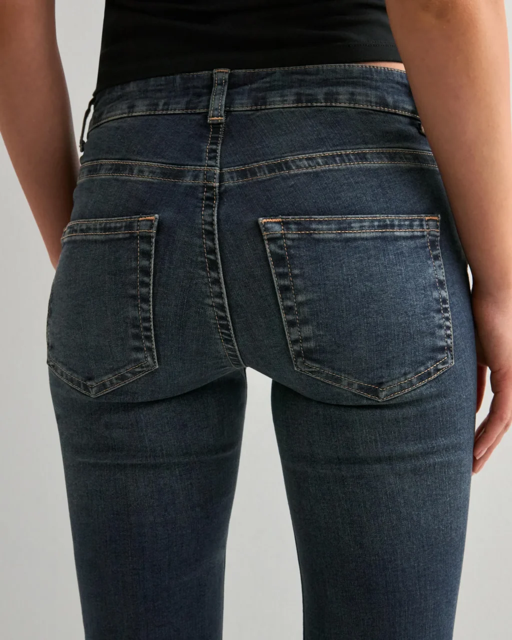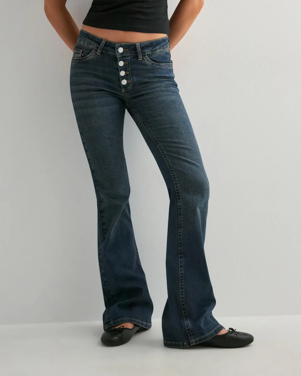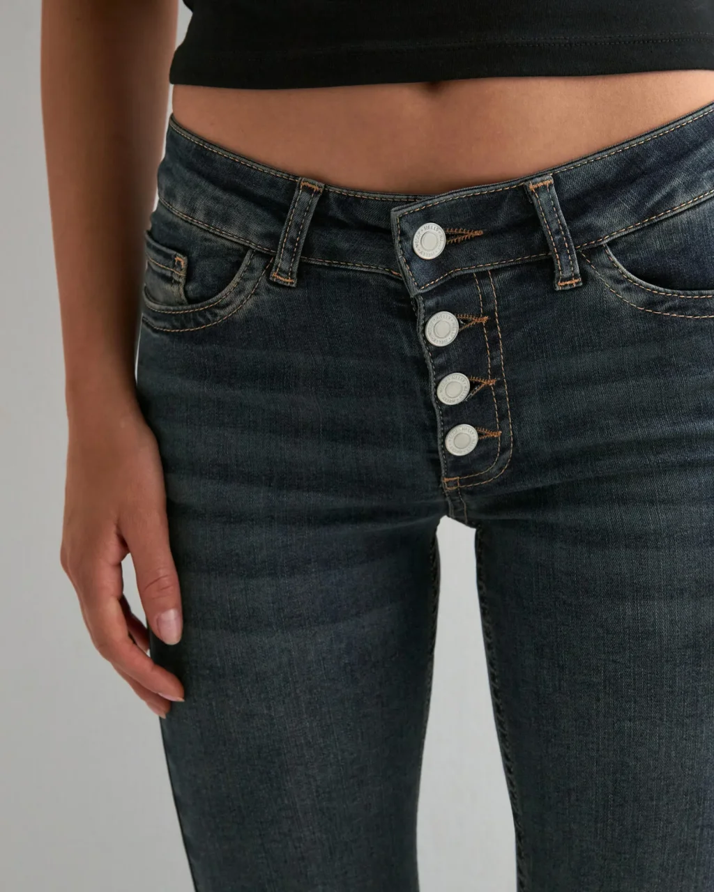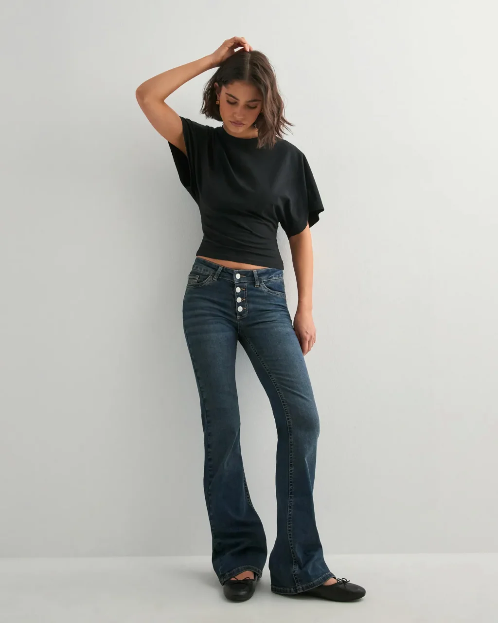 Mokşa’nın modern kesimiyle üretilen bu jean, orta bel formuyla bel hattını zarifçe kavrar; toparlayıcı etkisiyle bedeni dengeler.