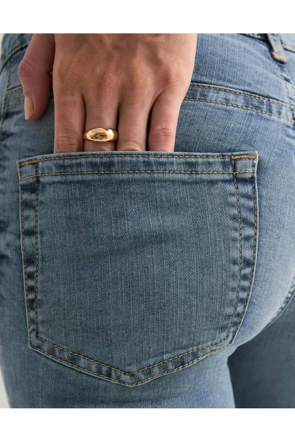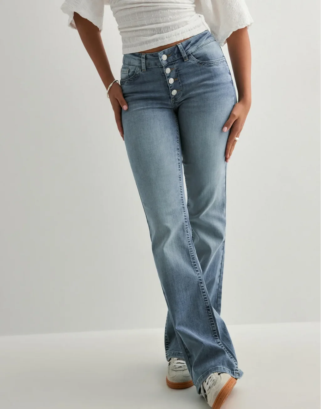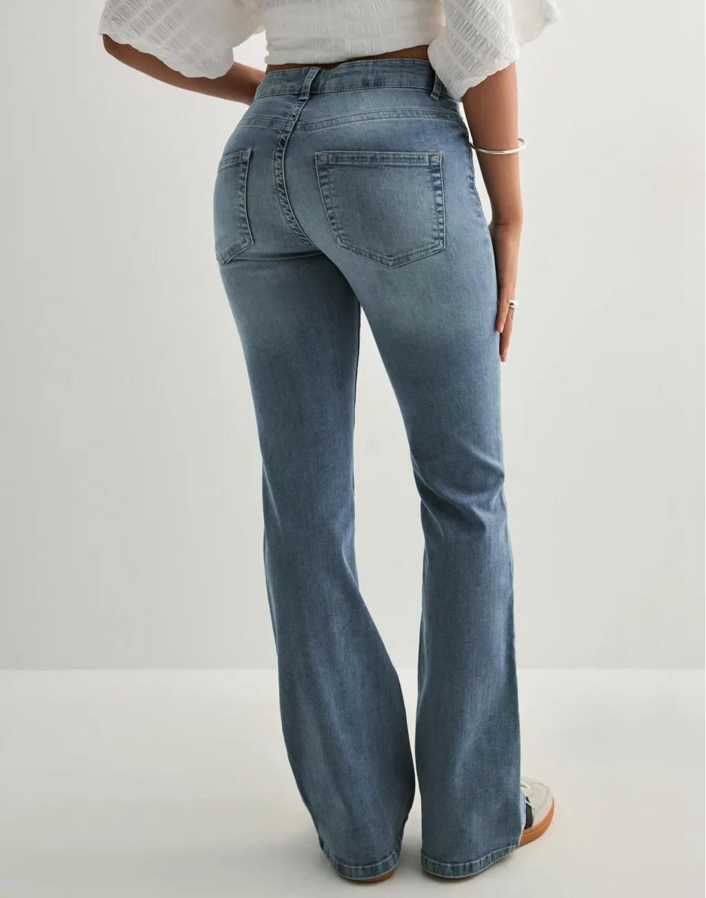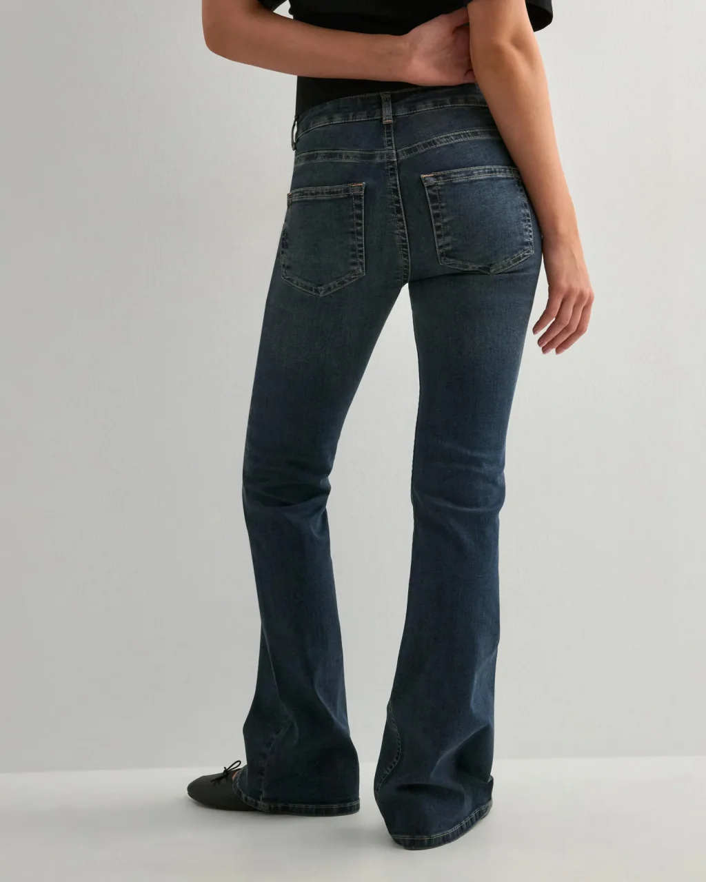 Mokşa’nın modern kesimiyle üretilen bu jean, orta bel formuyla bel hattını zarifçe kavrar; toparlayıcı etkisiyle bedeni dengeler.