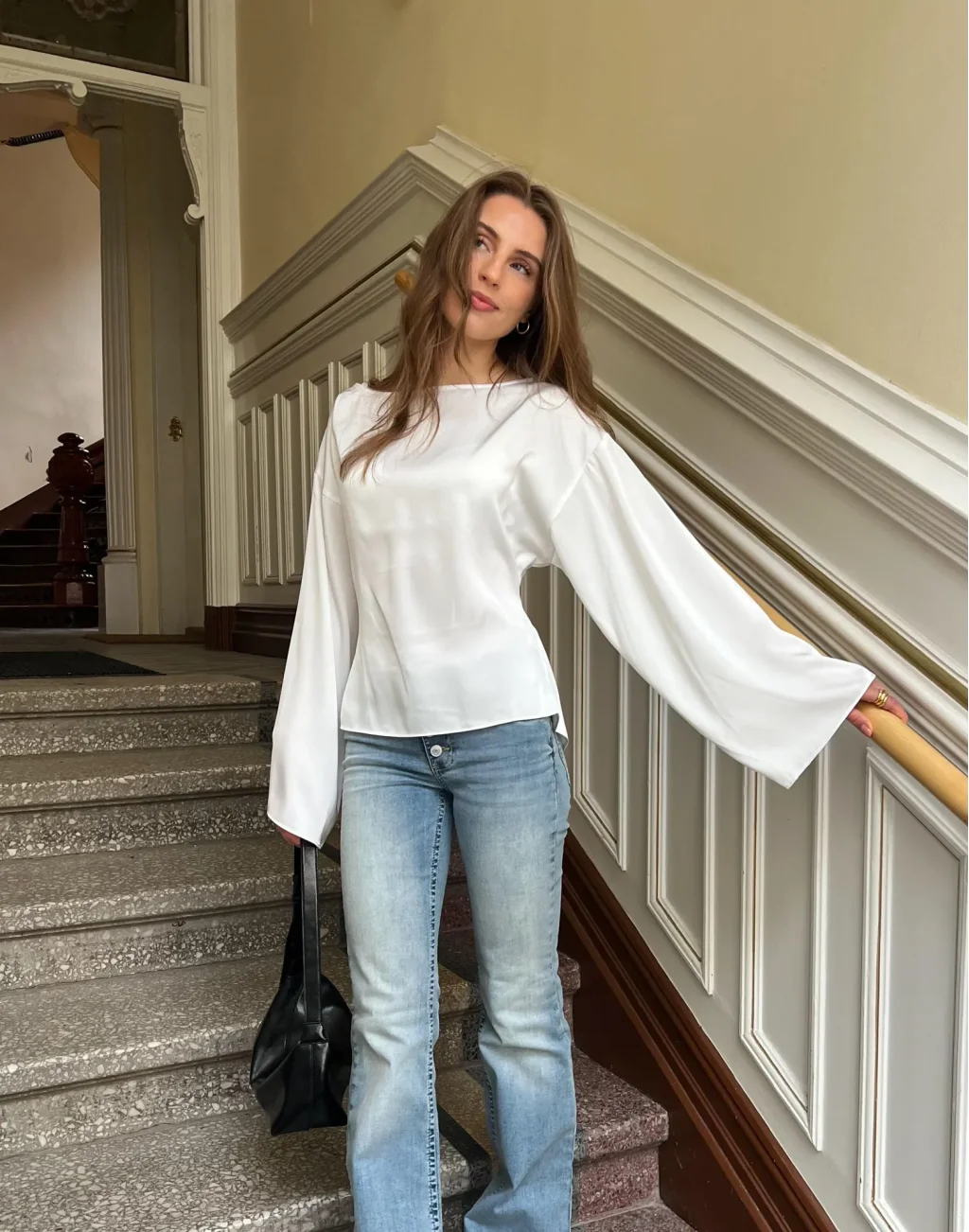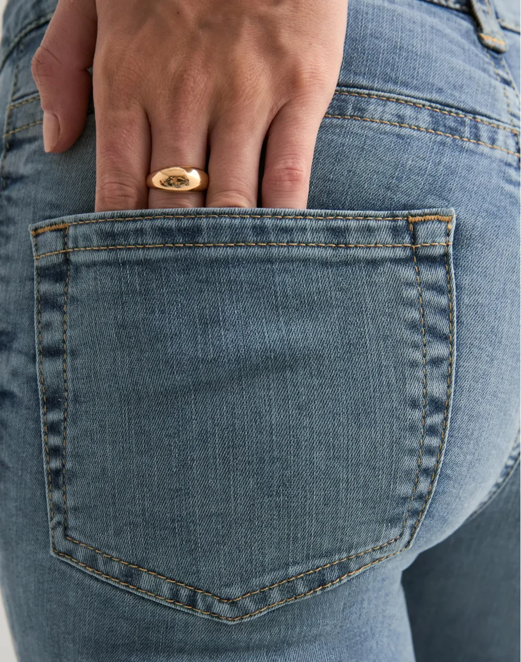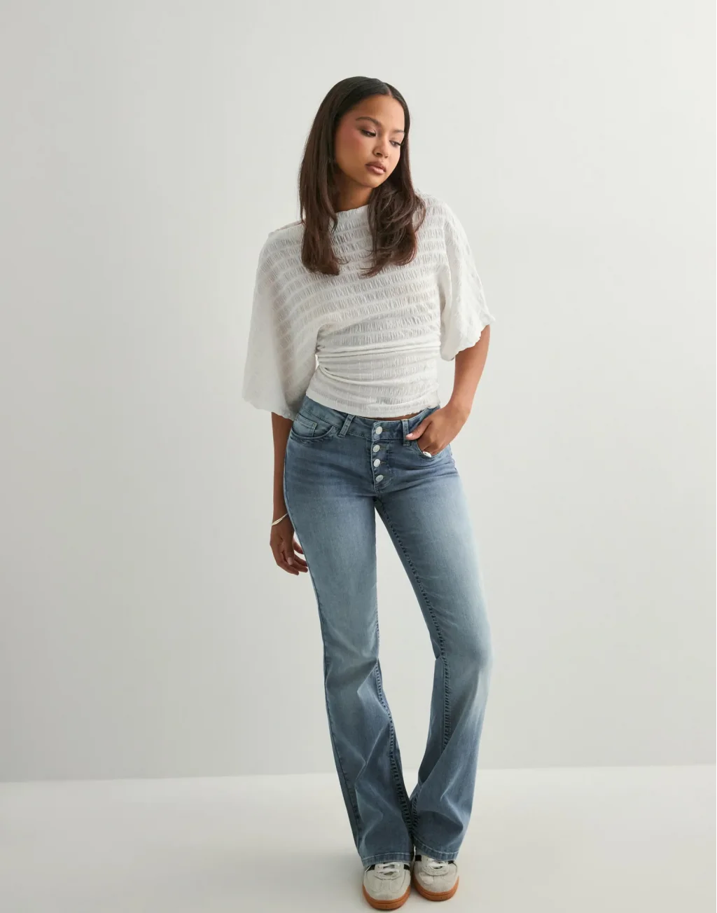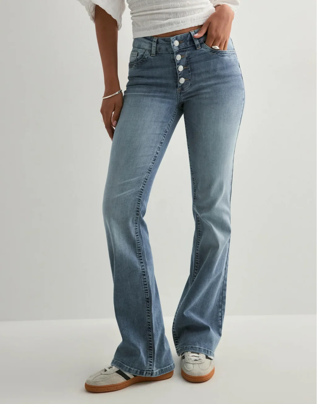 Mokşa’nın modern kesimiyle üretilen bu jean, orta bel formuyla bel hattını zarifçe kavrar; toparlayıcı etkisiyle bedeni dengeler.