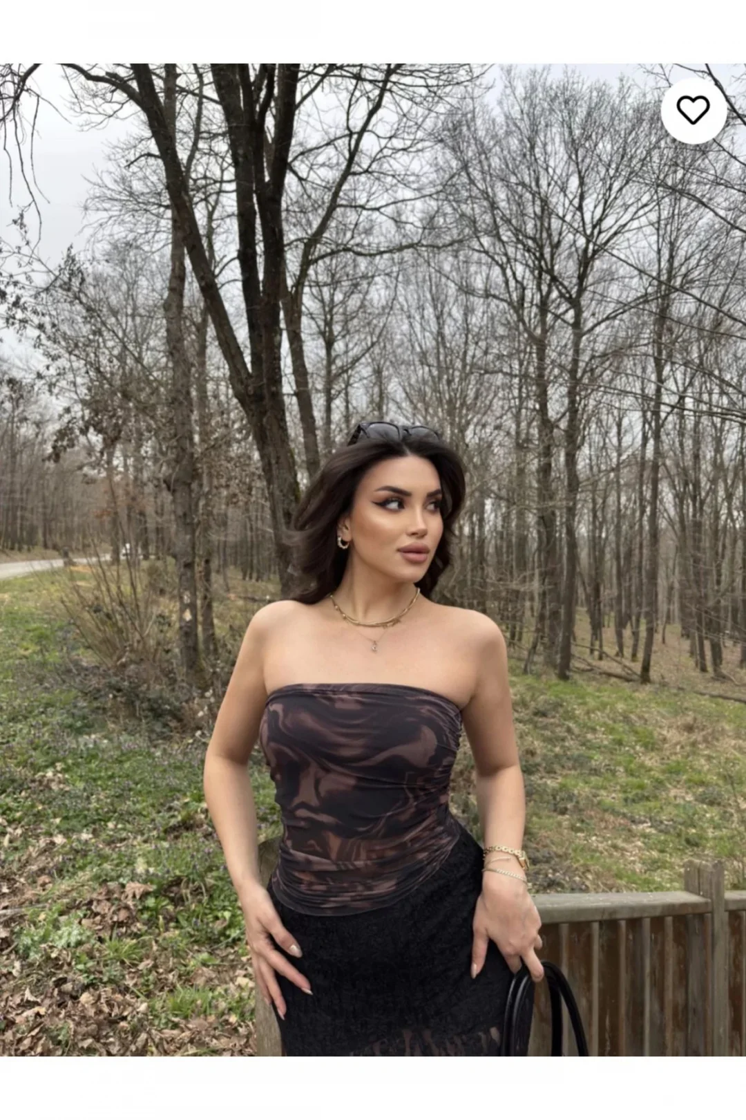 Kahverengi Desenli Straplez Tül Crop Model S beden giyiyor