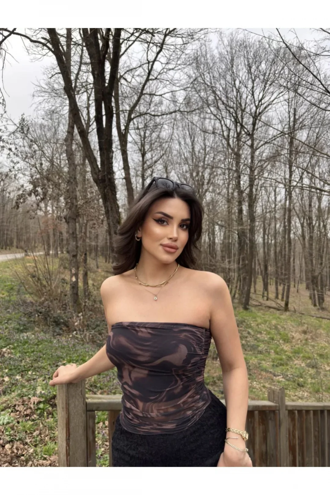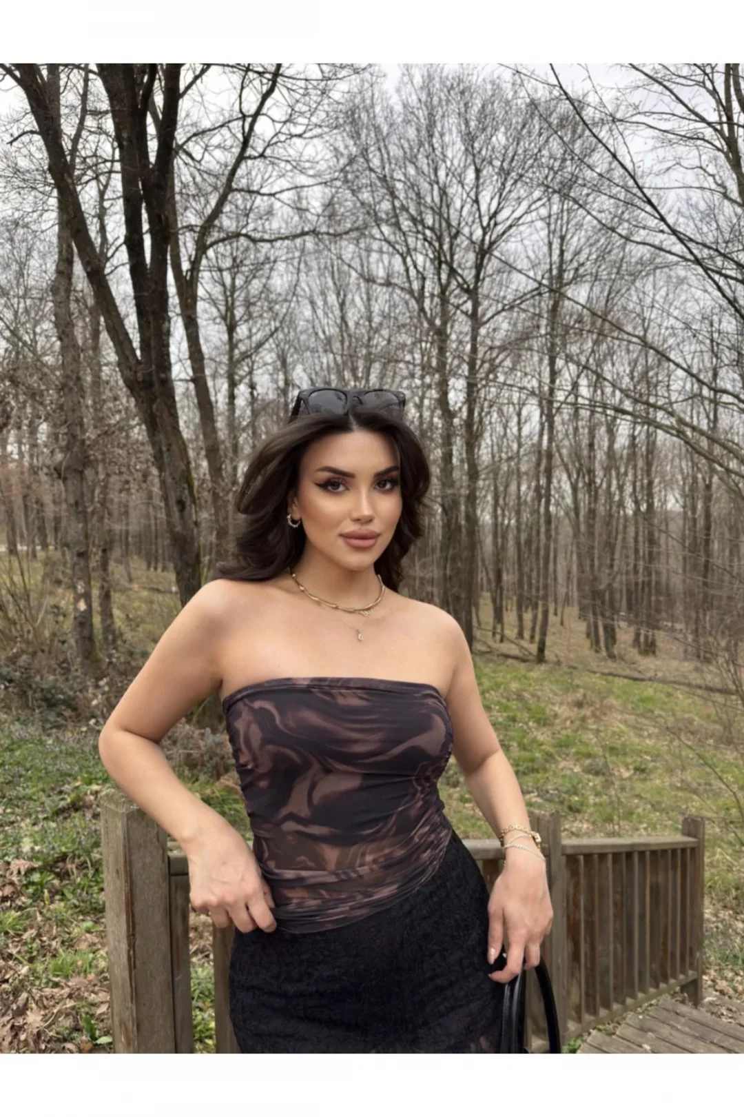 Kahverengi Desenli Straplez Tül Crop