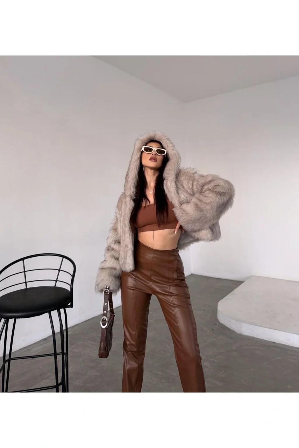 Kadın Günlük Kapüşonlu Kürk Detaylı Crop Fermuarlı Ceket